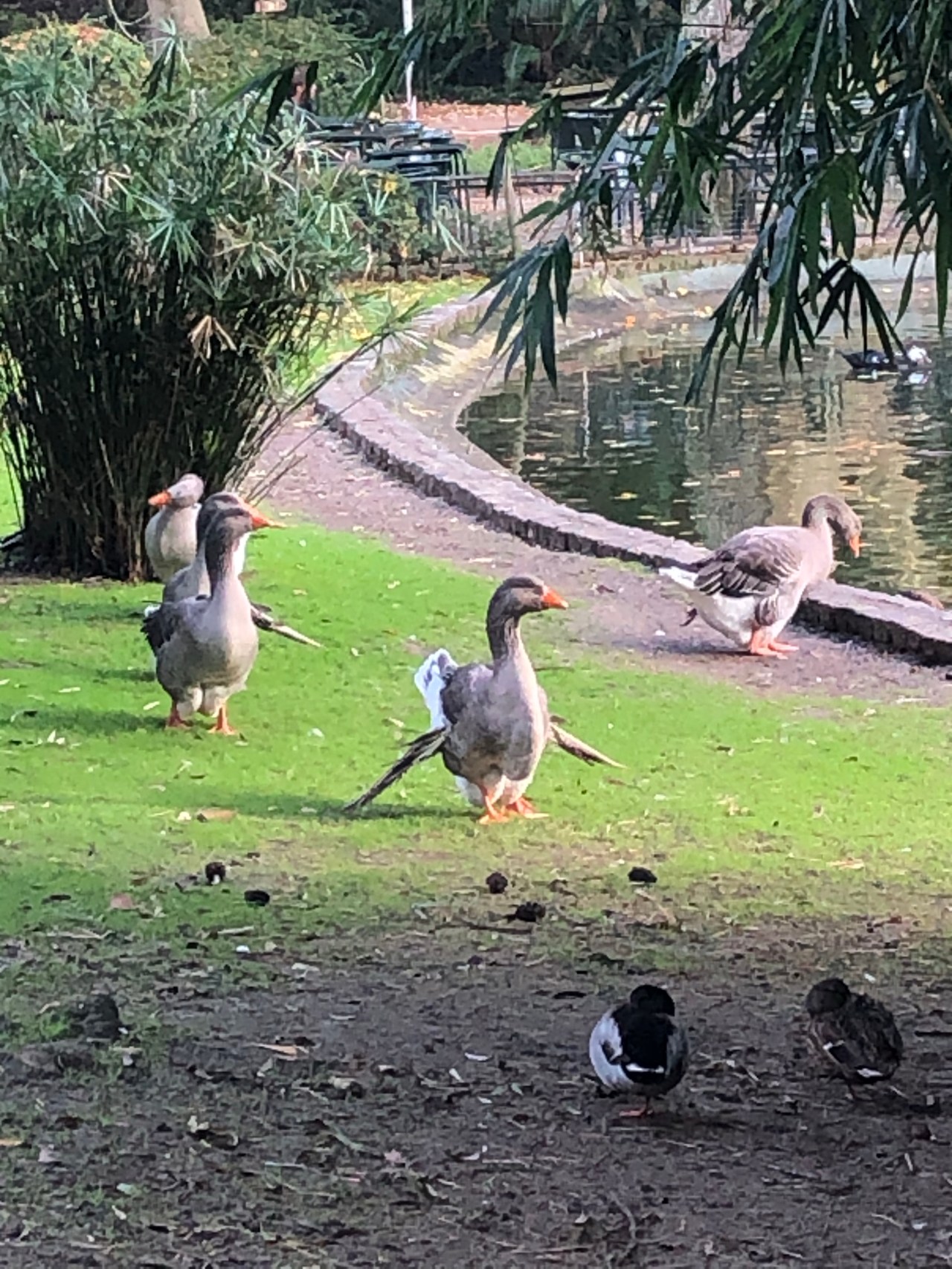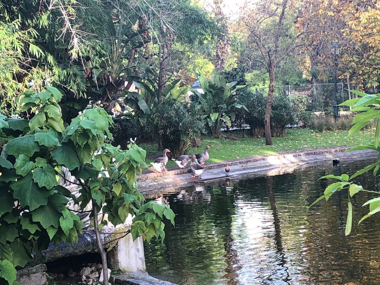 Beaucoup de petits lacs où des canards, des oies, des cygnes noirs ou blancs se promènent et font leurs parades amoureuses. Des petits kiosques verts à différents endroits du parc permettent de prendre un verre et de se reposer.