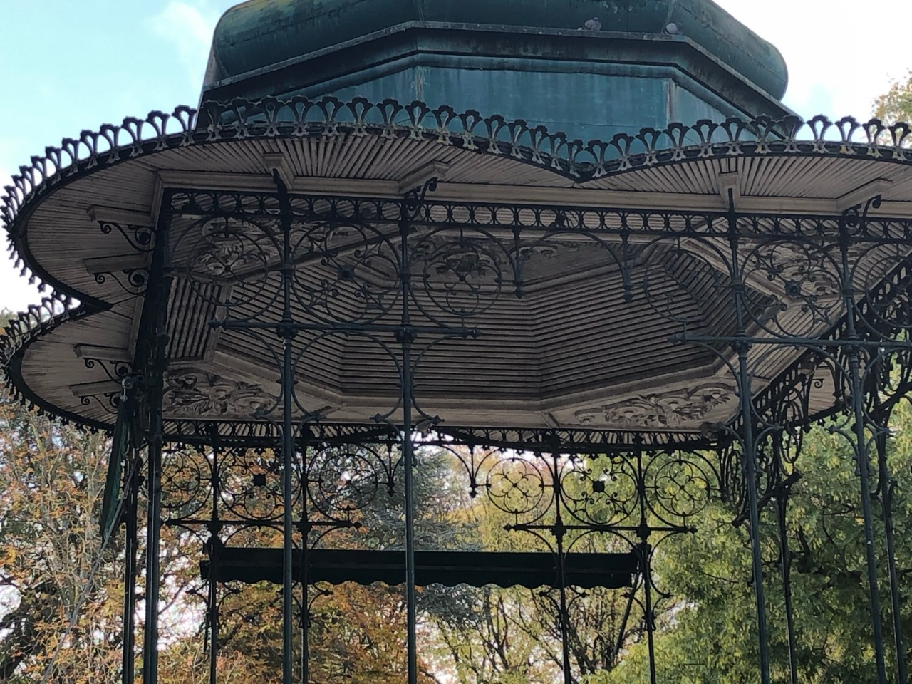 Mais surtout le clou de ce jardin c’est le fameux kiosque à musique de couleur bleu en fer forgé au magnifique escalier en fer à cheval et dont le plafond blanc fait comme des vagues empilées les unes sur les autres. Une sorte de gâteau blanc !