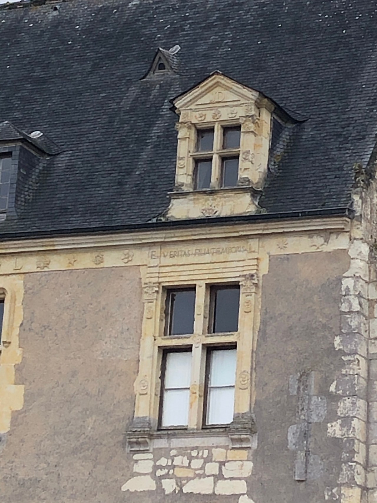 Dans le jardin il y avait un joli poisson en fer forgé qui attend le visiteur et tourne le dos au manoir. Et nous étions face à ce domaine bien vide en cette période de l’année. Et puis devant on pouvait voir les armoiries du château sur la porte et sur les hauts de fenêtres « Es veritas filia temporis » avec les fameuses roses autour.