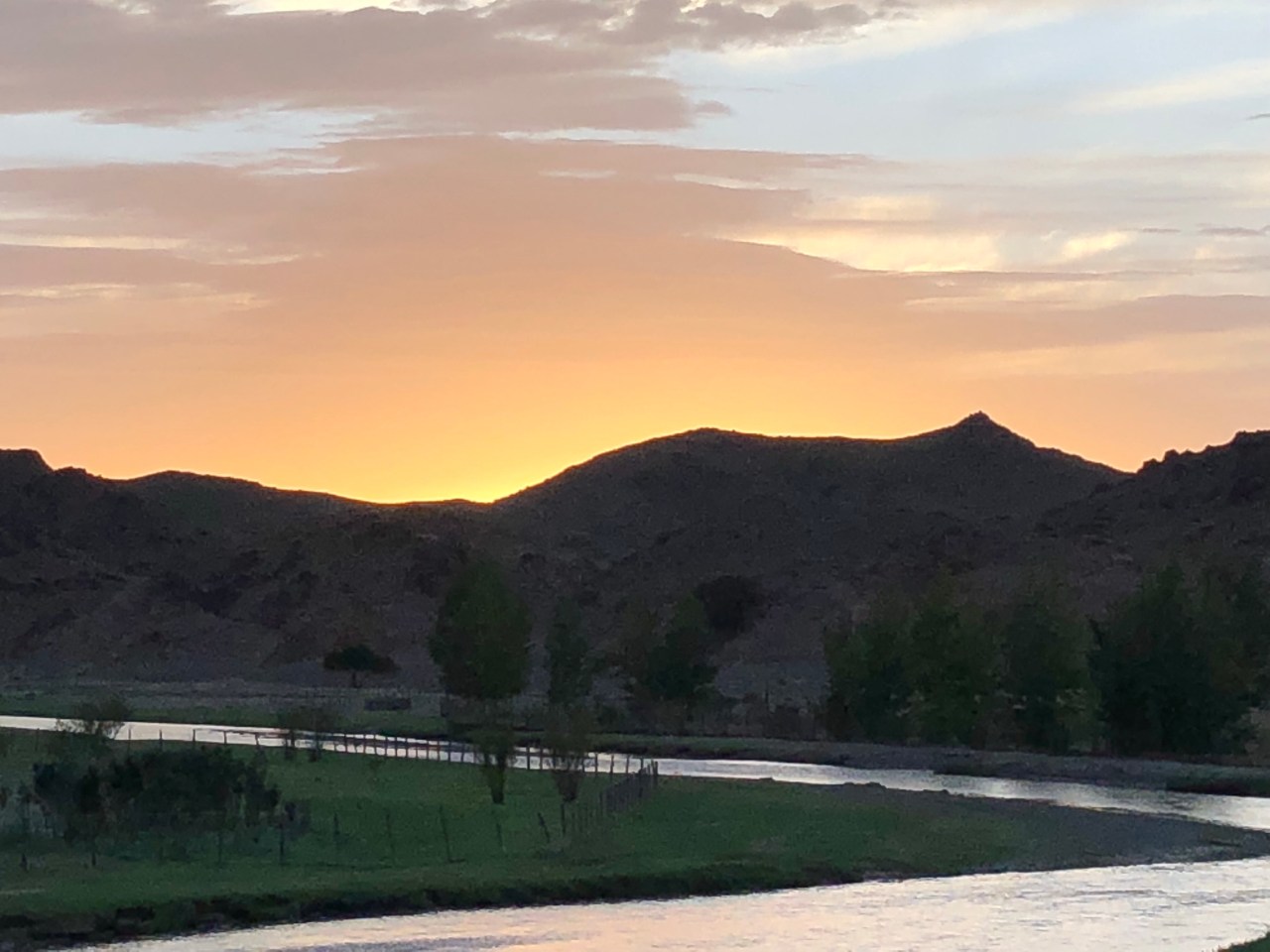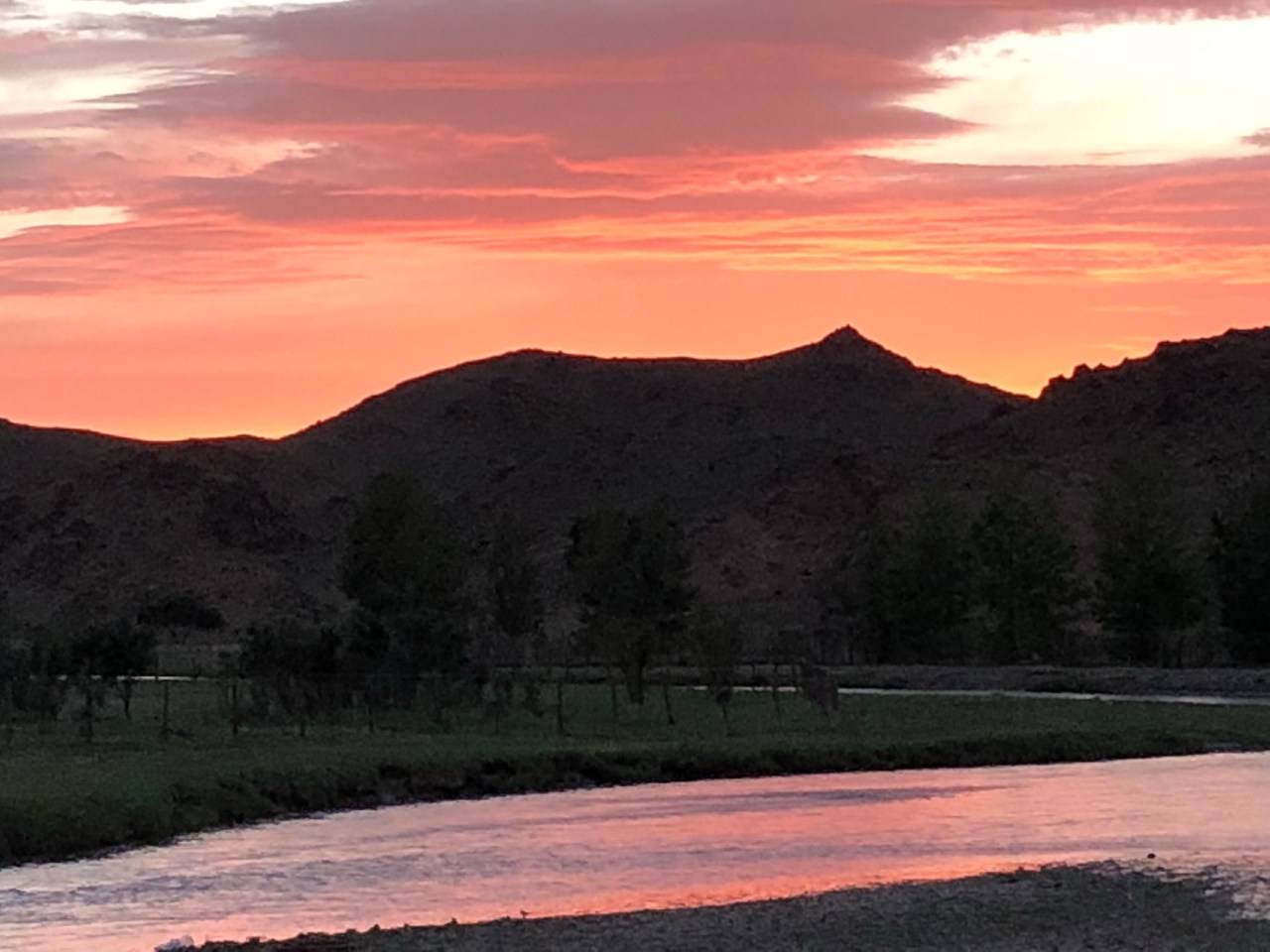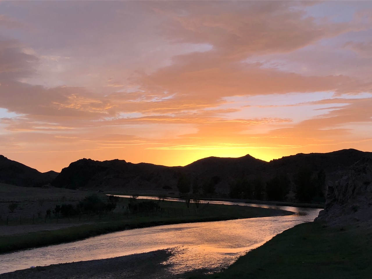 Et en soirée, vers 19h, le festival de lumières s’est installé sur la vallée de l’Onguii. Le ciel s’est recouvert d’un film grisâtre, blanc, avec des rayures plus ou moins foncées. Et puis à travers des trouées, le soleil a joué à venir, repartir, réapparaitre pour être encore plus fort et rayonnant. La terre s’est rosacée, les herbes sont devenues plus vertes et le vent a augmenté sa violence. Puis petit à petit le ciel est devenu orange pâle se reflétant dans la rivière. La rivière étincelait de doré, de jaune pâle, d’orange et de rouge flamboyant. Le coucher de soleil s’est caché derrière les montagnes. Puis il s’est affaissé pour briller sur les monts et recouvrir d’orange toute le paysage s’offrant à nous. Le bleu du ciel est réapparu se faufilant entre les interstices orange laissés par le soleil. Et toute la soirée le soleil s’est joué du ciel, des nuages et a coloré la vallée de rose, d’orange, de rouge, de mauve. Une féérie flamboyante de couleurs et de reflets !
