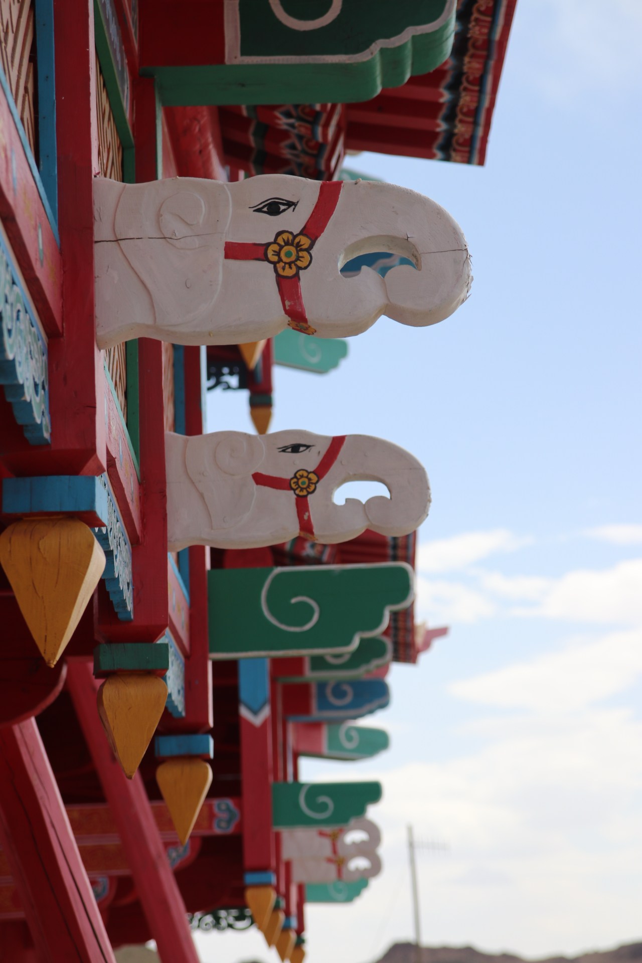 On retrouvait sur les portes les signes distinctifs du bouddhisme : la svastika pour le bonheur ; la conque symbole du son du dharma luttant contre l’ignorance ; le lotus symbole de pureté et le vase élixir d’immortalité de la vie. Et en hauteur des têtes d’éléphants blancs – dignes représentants de la puissance de Bouddha – avec des fleurs rouges entourant leurs têtes, faisait honneur aux touristes qui passaient mais surtout aux pèlerins et aux moines qui venaient se recueillir sur ce site.