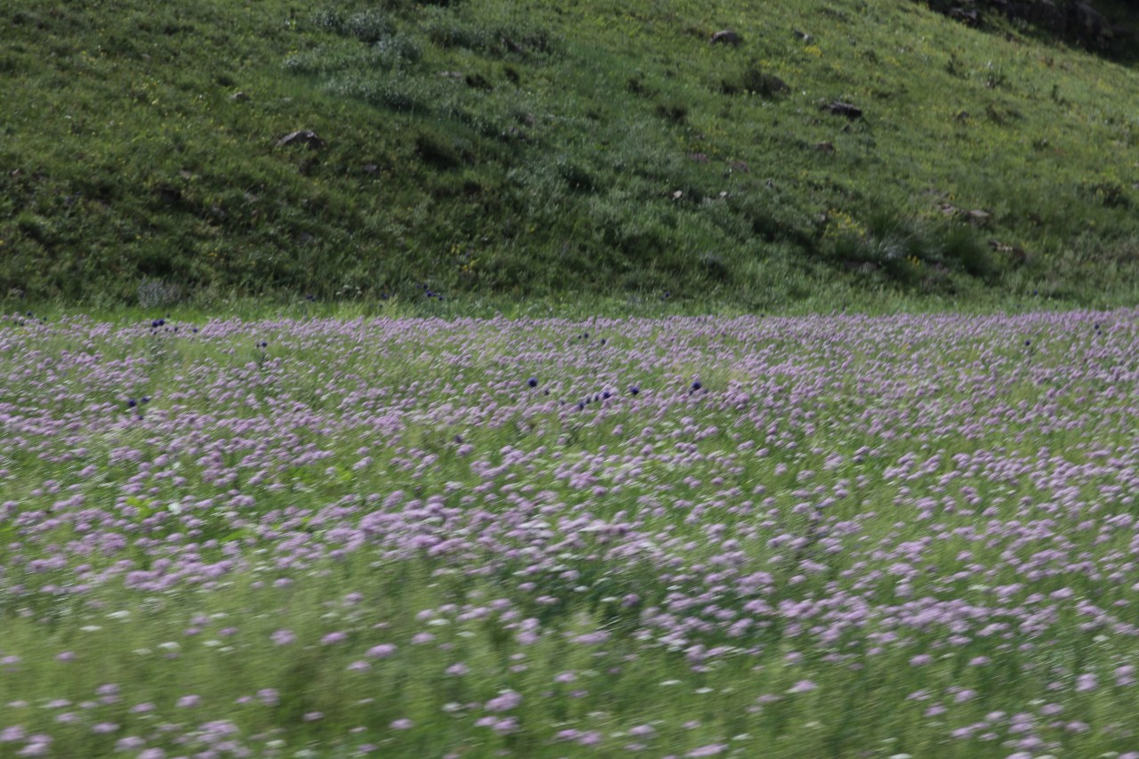 les odeurs des fleurs, les edelweiss qui parsèment les champs et que broutent les animaux domestiques (yaks, moutons, chèvres ou vaches). Je n’aurais de ma vie vu autant d’Edelweiss au m2. J’en rêve encore ! Les fleurs mauves et les herbes vertes qui remplissaient l’air d’une odeur indescriptible et inconnue de nous et qui agrémentent les prairies et volent au gré du vent.