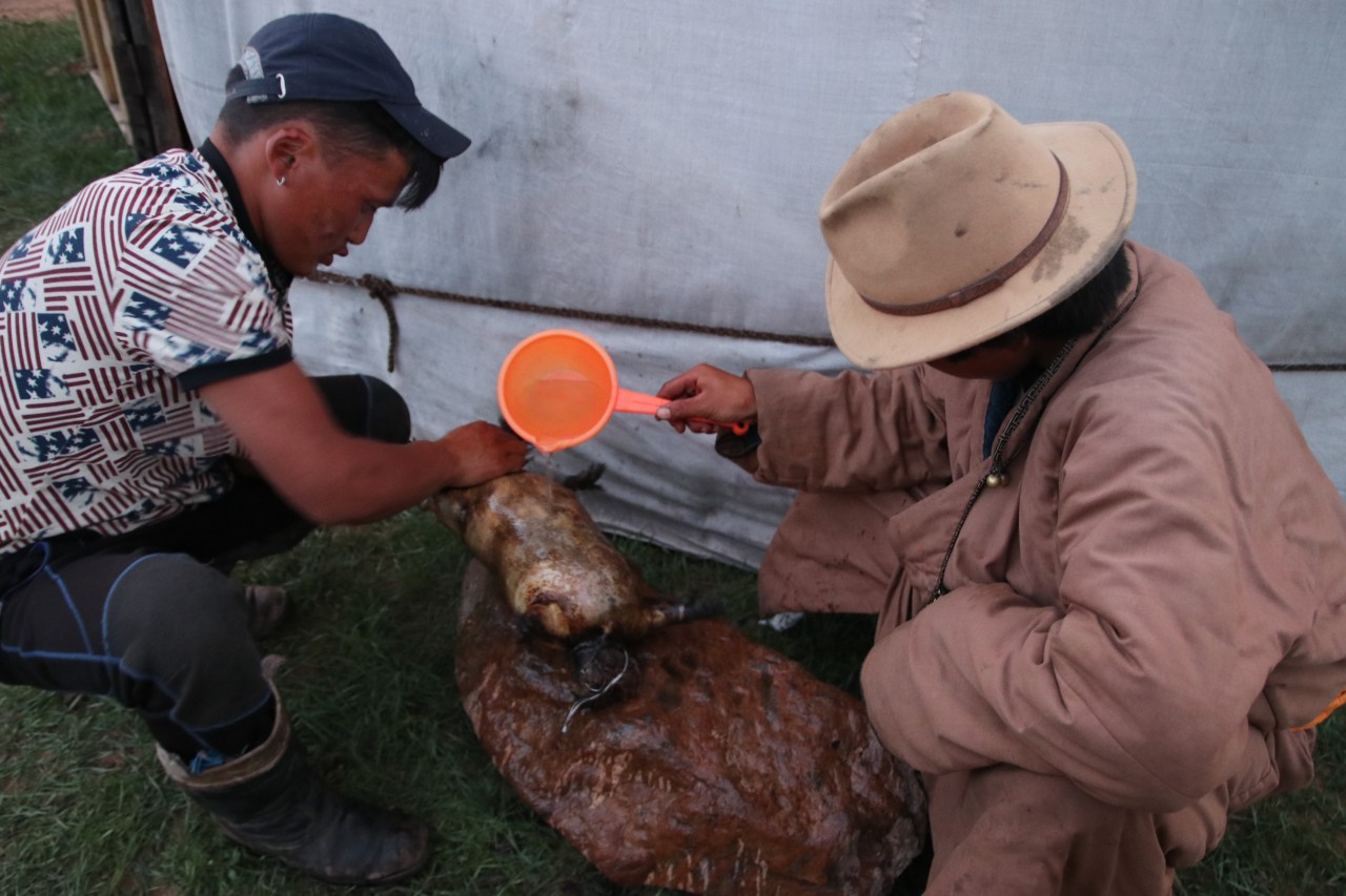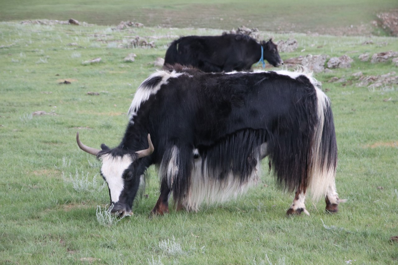 Etre à la merci de la nature (orage, pluie, grêle) mais aussi des animaux et vivre dans la structure de la yourte fut un exploit ; la vie avec les moutons, les yaks qui broutent, les chèvres qui se prennent parfois pour des chiens et suivent leur maître toute la journée ; les chevaux qui courent en groupe dans les vastes prairies, se ruent dans les grandes flaques d’eau laissées par les orages ou se battent entre eux ; les vaches qui veulent passer la tête par la porte de la yourte ou les yaks qui se frottent à la yourte la nuit pour éliminer les poussières ! Les nomades eux-mêmes qui parfois entrent sans prévenir pour regarder à quoi ressemble un étranger…. Un monde contrastes ! Il faut le vivre pour le croire et surtout découvrir un monde bien éloigné du nôtre ! Je dois dire, que je n’aurais jamais de ma vie, partagée autant de temps avec les animaux domestiqués et surtout vécue à l’air libre dans les yourtes. Une expérience qui vous montre la rudesse de la vie des nomades mais aussi la joie de vivre à l’air et de pouvoir le soir regarder la voie lactée.