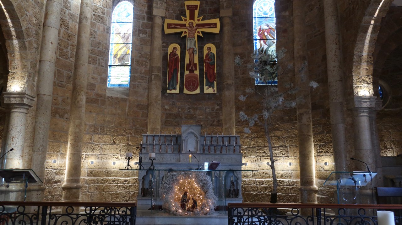 Dans l’église Saint-Elias – église orthodoxe maronite Minet El Hosn – gardée par des policiers armés jusqu’aux dents se trouve une très jolie crèche. A l’intérieur de l’église devant l’autel une petite crèche contenant Marie, Joseph et Jésus brille de mille feux. Un joli hommage à notre Père, sous la croix du Christ.