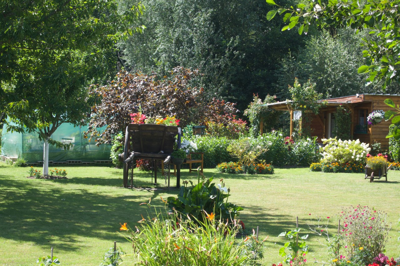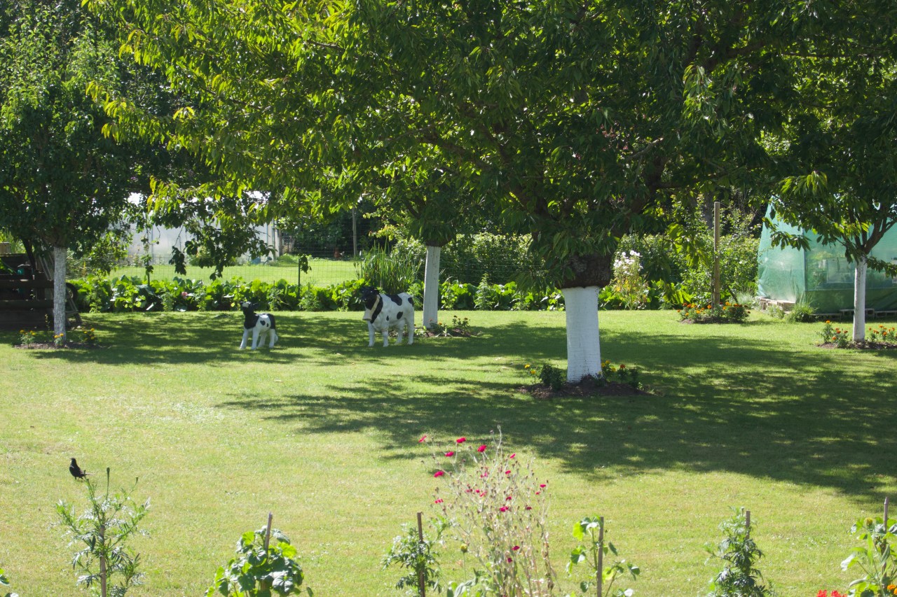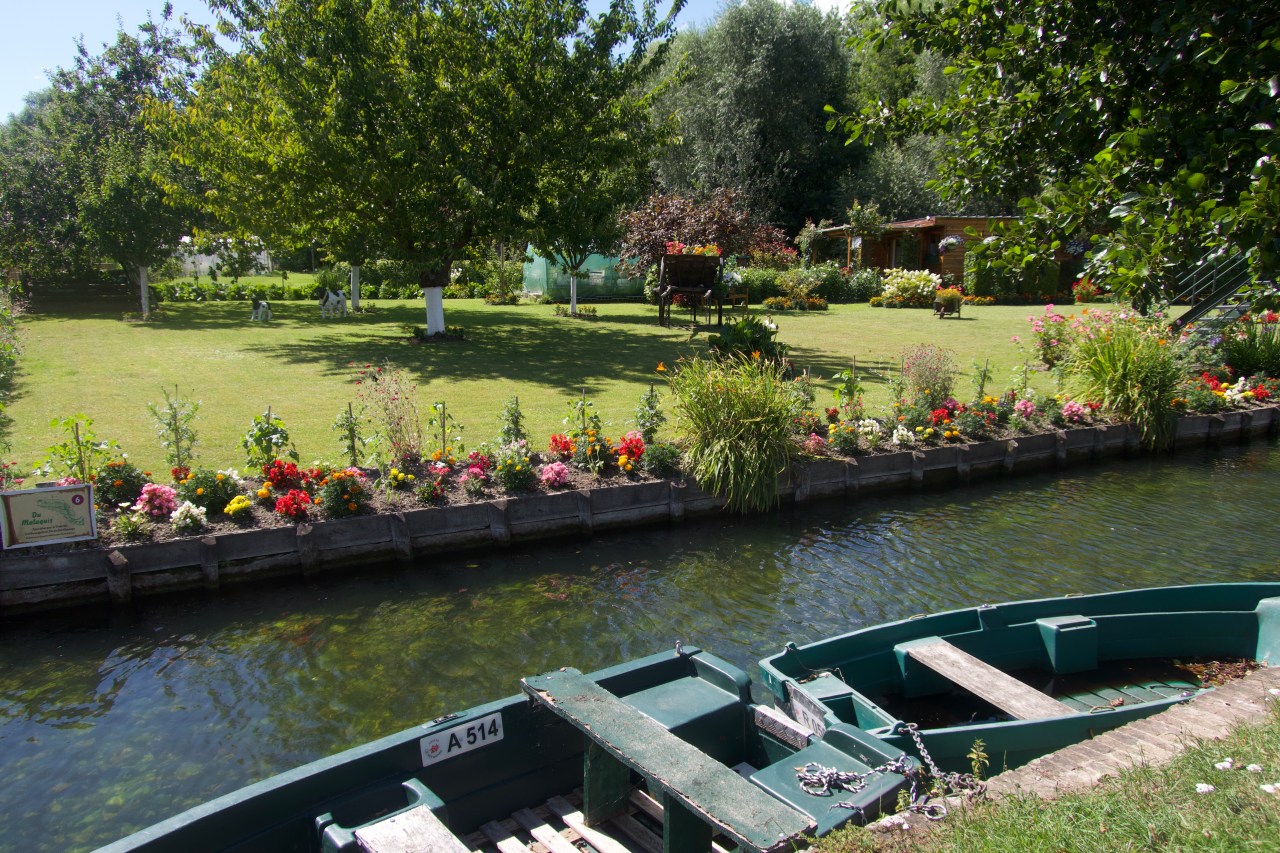 Et puis dans l’ombre deux barques attendent le maraîcher pour aller cueillir ses légumes. Et tout à coup un superbe jardin vous taquine avec ses deux vaches qui sont juste des ornementations en trompe l’œil. Les fleurs sur les rebords des canaux et dans la charrette vous feraient bien sauter le canal pour atterrir dans le jardin d’Eden ! L’ombre des pommiers y seraient un lieu de repos.