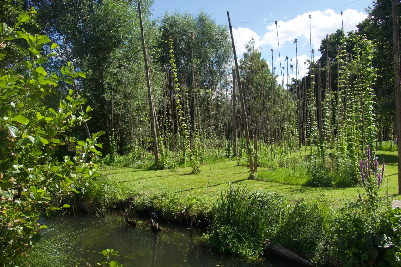 Un peu plus loin des houblons essaient de côtoyer le ciel et les tiges arrimés à des bouts de bois grimpent à vous donner le tournis.