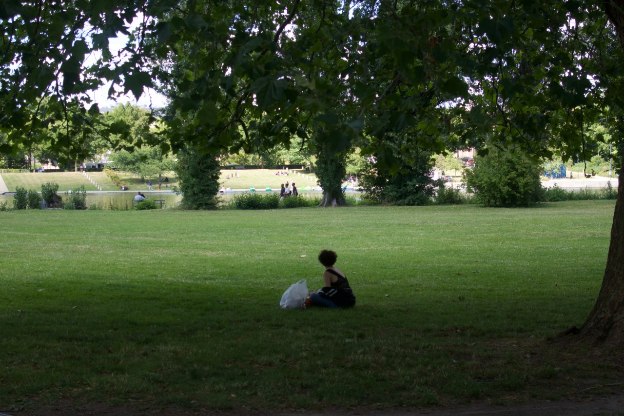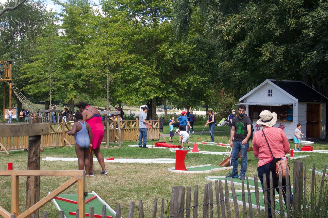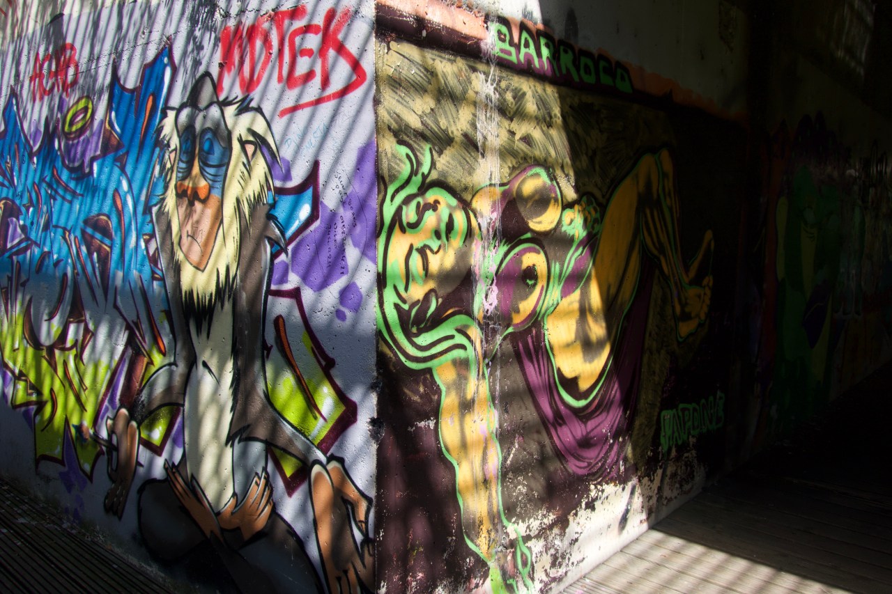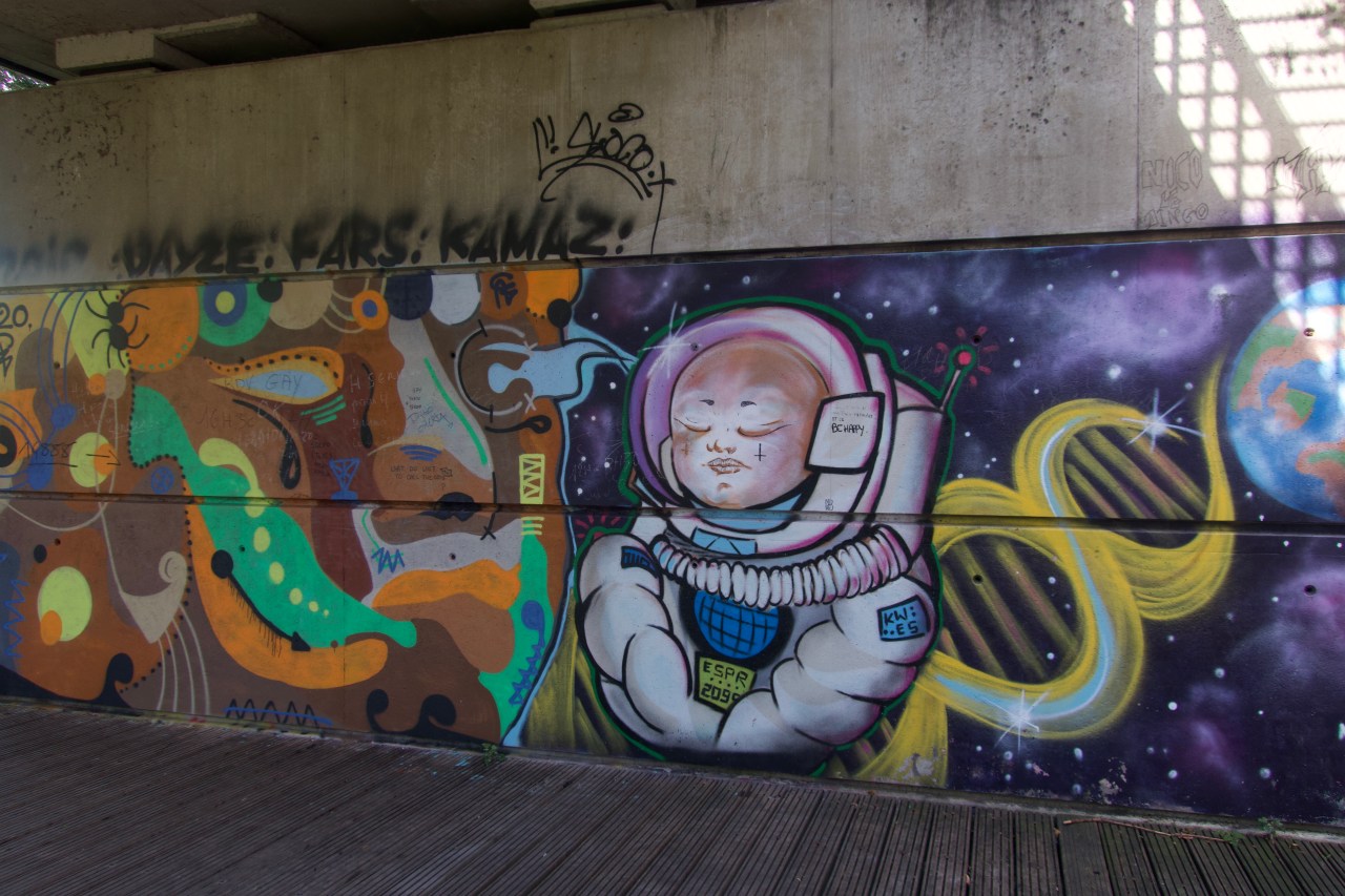 Mais je rebrousse chemin et me dirige vers la ville pour découvrir de jolis dessins de Street-Art qui décorent les ponts et vous transportent dans un autre monde. Celui des cosmonautes, des singes et des rêves à inventer. Et puis continuant par le jardin je peux voir une femme assise se reposant et jouissant du paysage ; d’autres jouant à l’accrobranche dans le vide ; d’autres faisant du mini-golf.