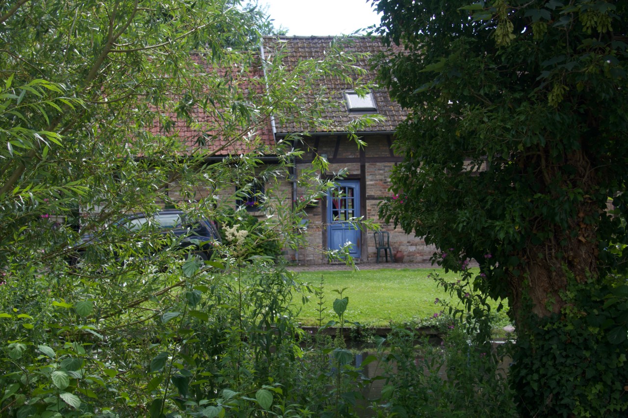 Et la fin de la balade se termine sur un autre canal et sur une très jolie maison amiénoise en brique rouge, aux fenêtres et portes bleues comme posée là par erreur sur une pelouse tondue verte pomme qui fait ressortir sa beauté et son isolement.