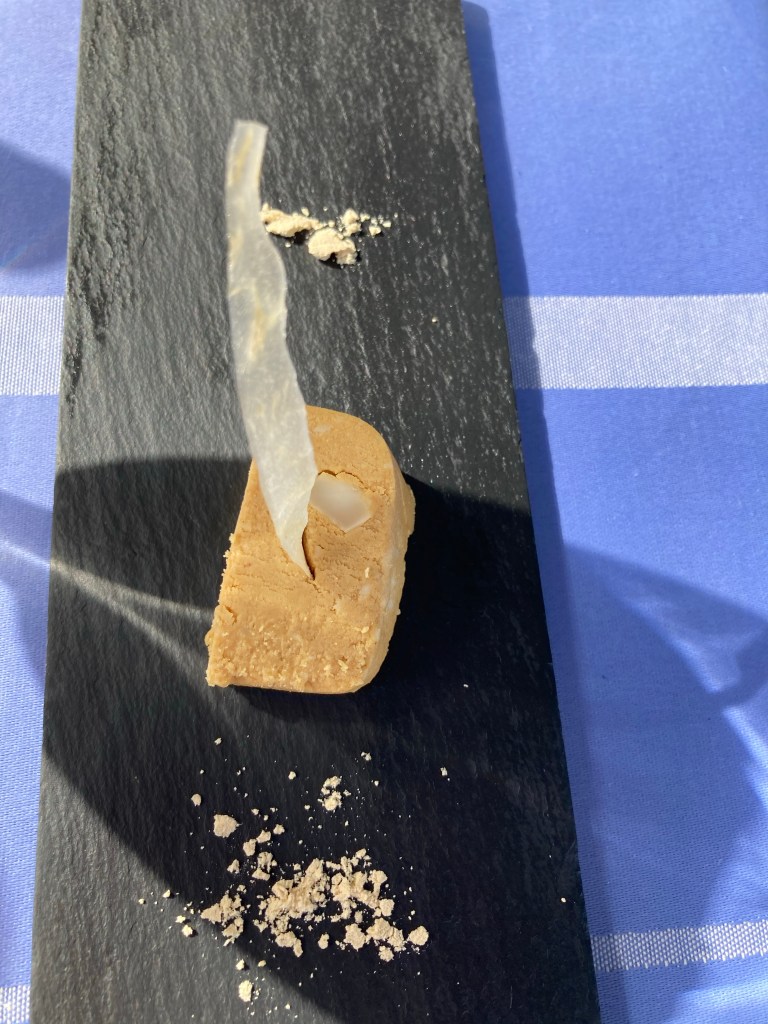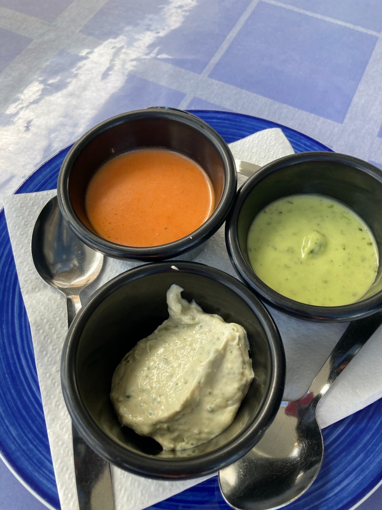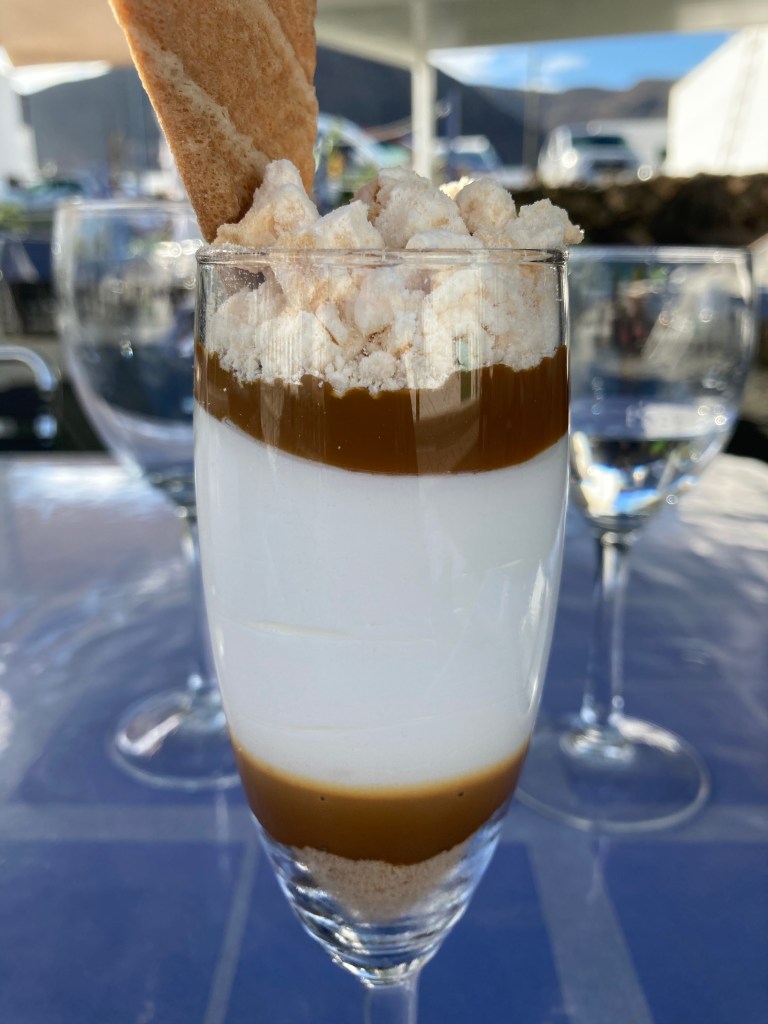 A Orzola, dans le restaurant La Marisca, j’ai découvert une sublime entrée équivalente d’un turon ! J’ai aussi testé les différentes sauces, présentées à chaque repas, accompagnées du pain : celle piquante (la rouge), celle à base d’ail comme ce que l’on met dans les escargots (la verte) et l’autre à base de sardines (la beige). On dévore tout avec le pain ! Et la magnifique dorade entière préparée pour que vous la dégustiez. Un régal. J’ai souvent pris ce plat simple mais délicieux que cela soit à El Golfo et à la playa Quemada. Et j’ai fini par un dessert trop sucré à mon goût mélangeant meringue pilée, crème fouettée et chocolat ou marron.  Ca donne des forces pour les balades à venir !