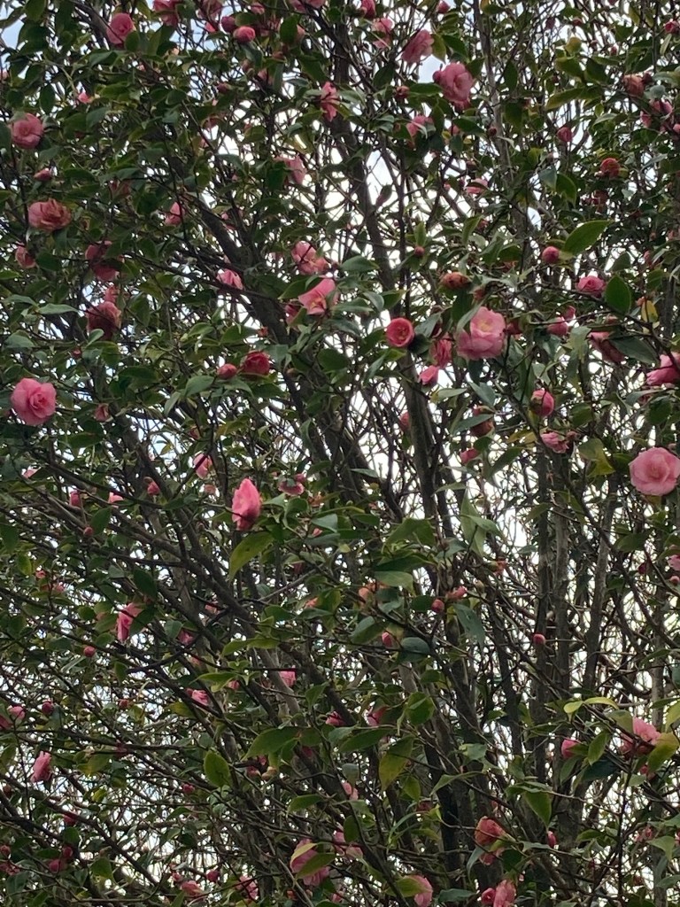 les camélias roses ouvrent leurs coroles roses et nous font une ornementation auréolée – on croirait des roses sauvages.