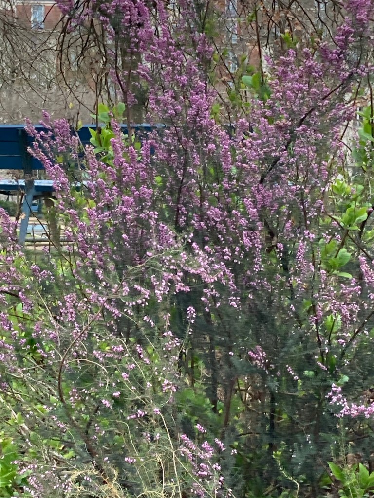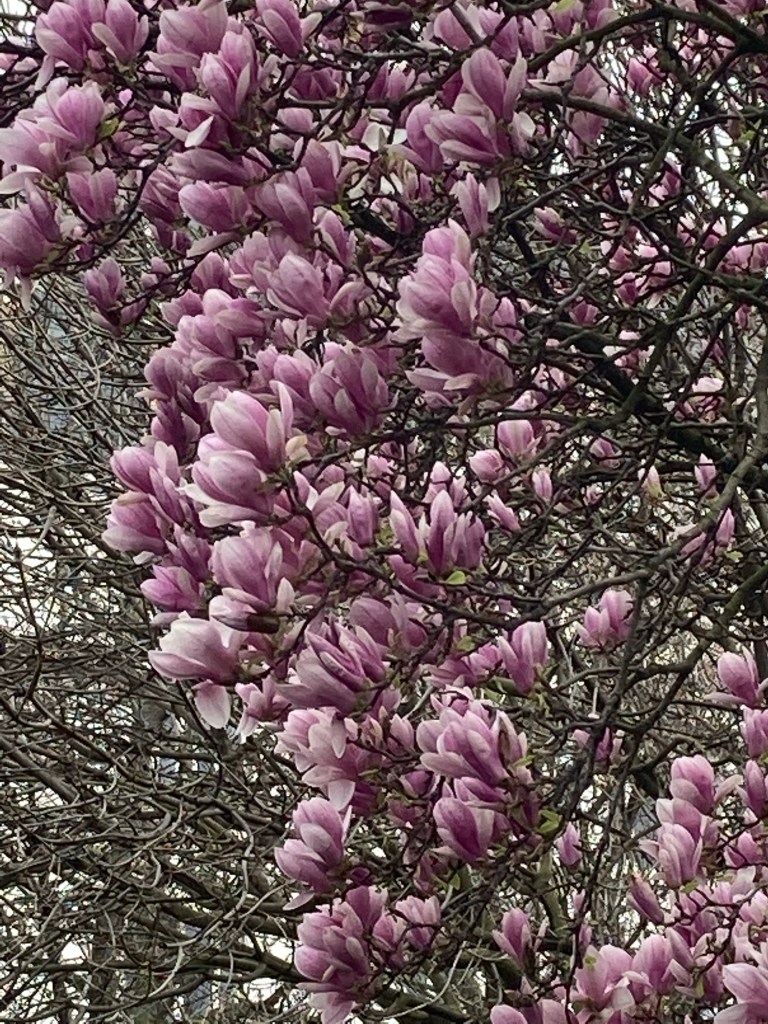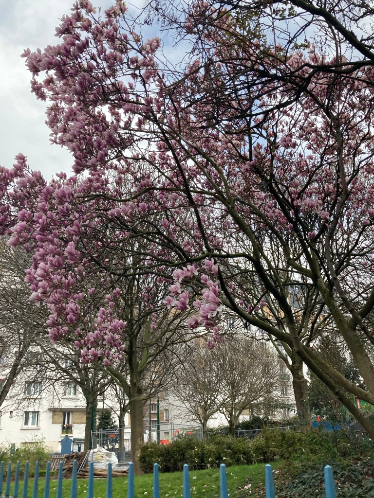 Le magnolia croule sous ses fleurs roses mauves qui éclosent lorsque le soleil est là.