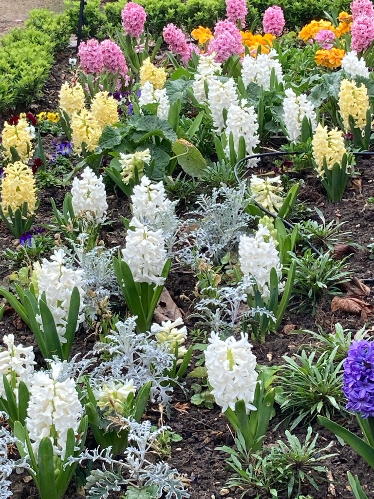 Les jacinthes bleues, blanches, roses et jaunes embaument le chemin qui les précède. Les couleurs sont un ravissement du cœur et un enchantement des sens.