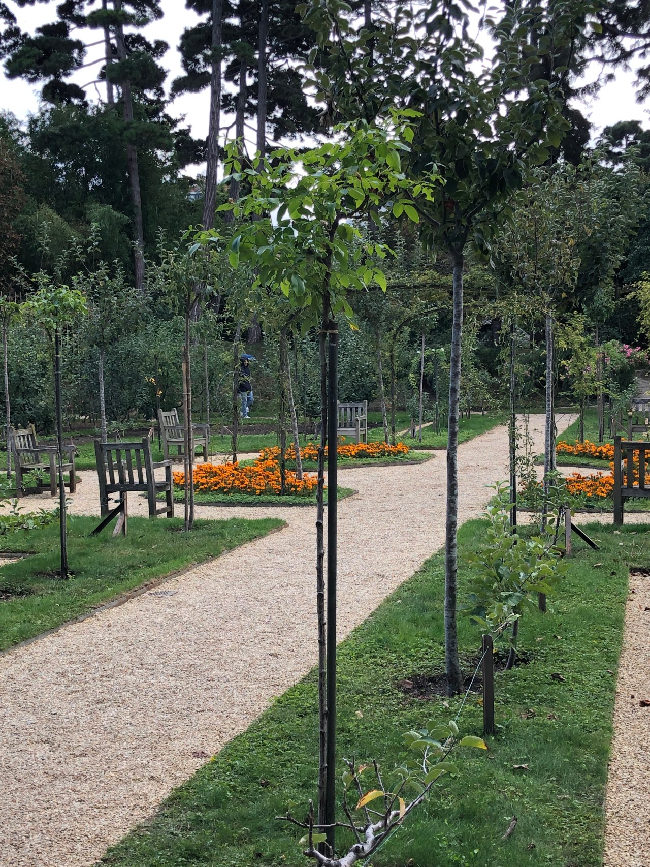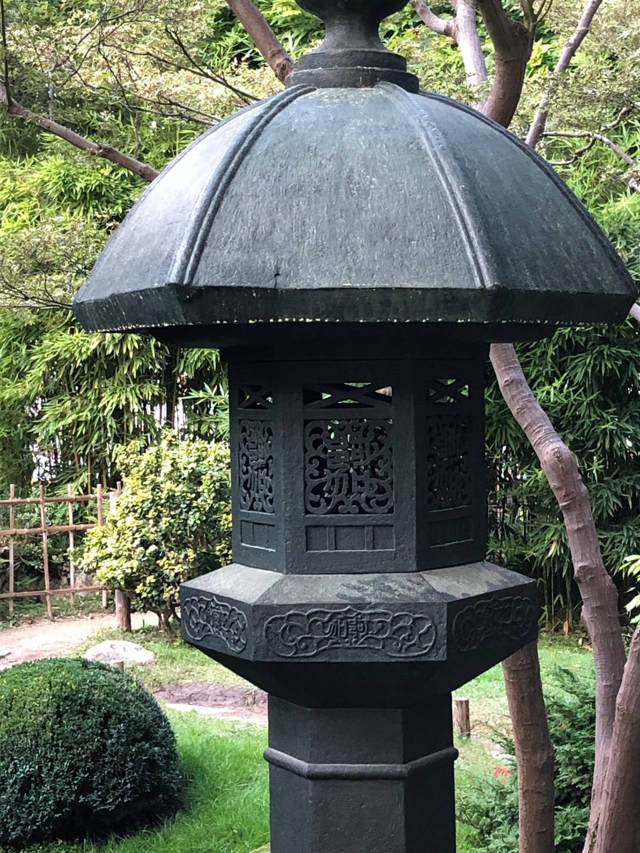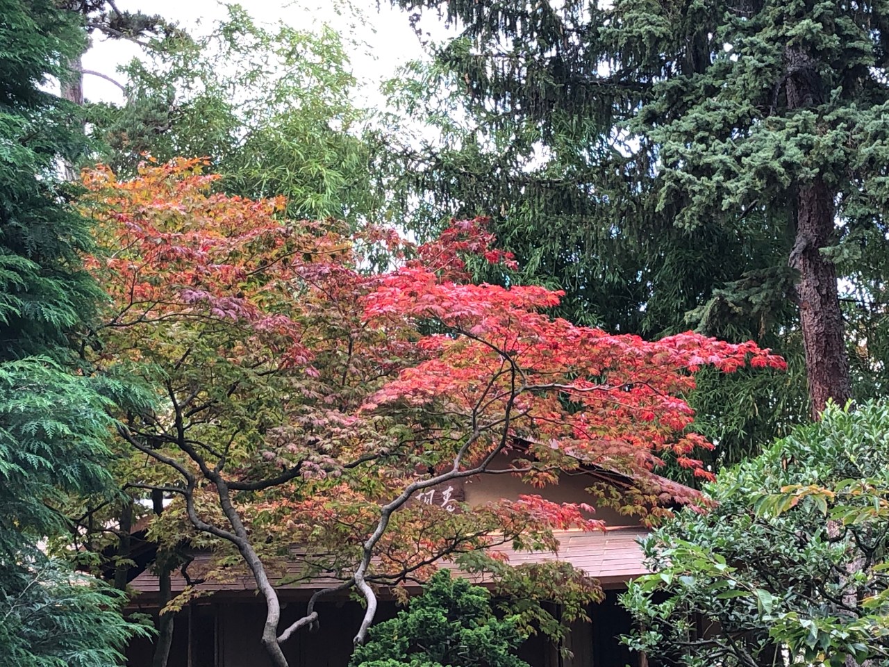 Le jardin était très verdoyant, jaunissant ou rougissant selon les arbres. Un début d’automne avec des fleurs mauves, des arbres avec des oranges trifoliolées (citronnier de Corée), des petites baies jaunes oranges et rouges de buissons ardents. Des décors de bambous qui rompent la monotonie et cassent les différents décors du jardin.
