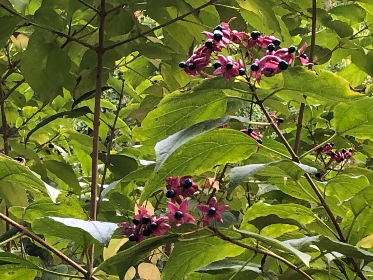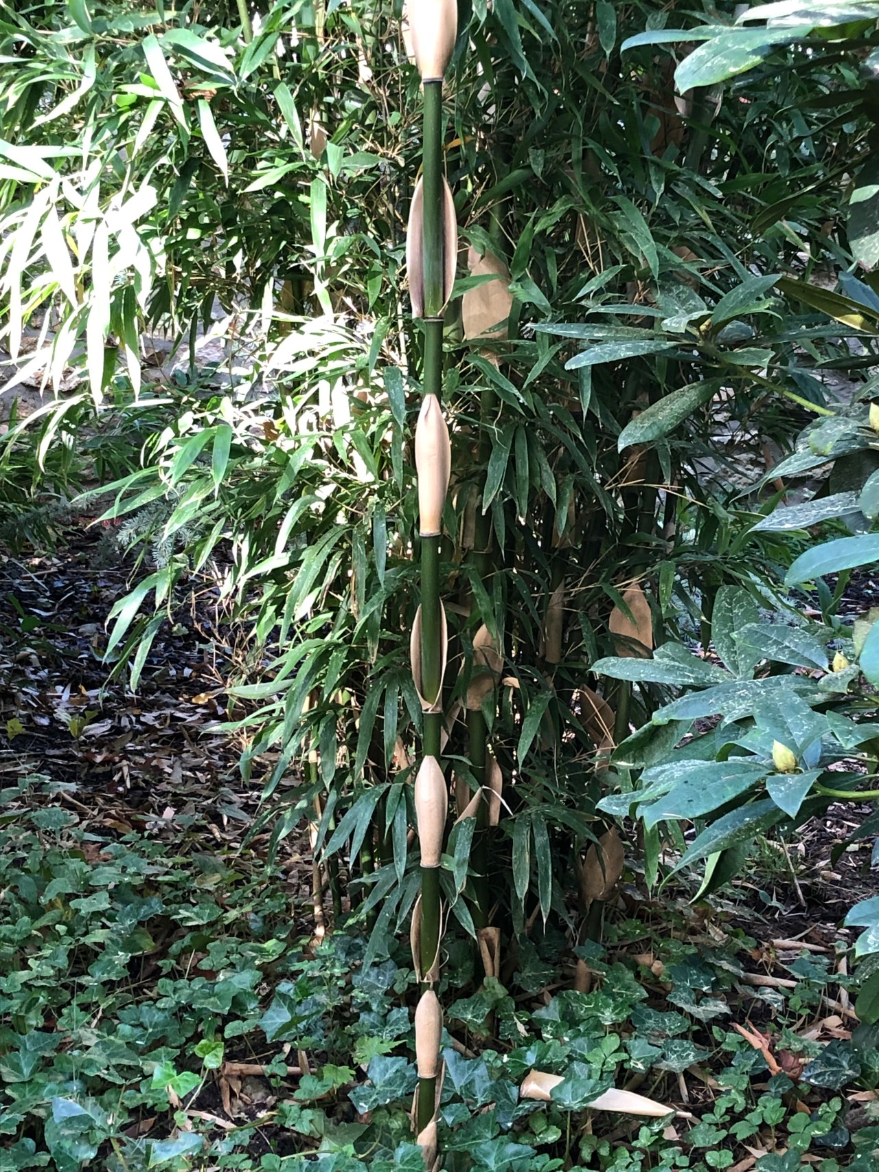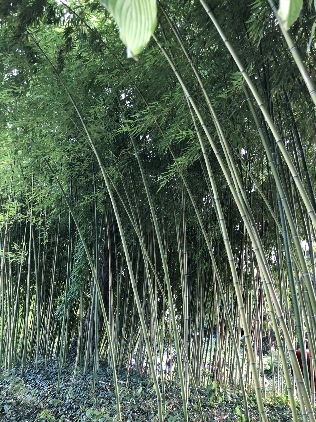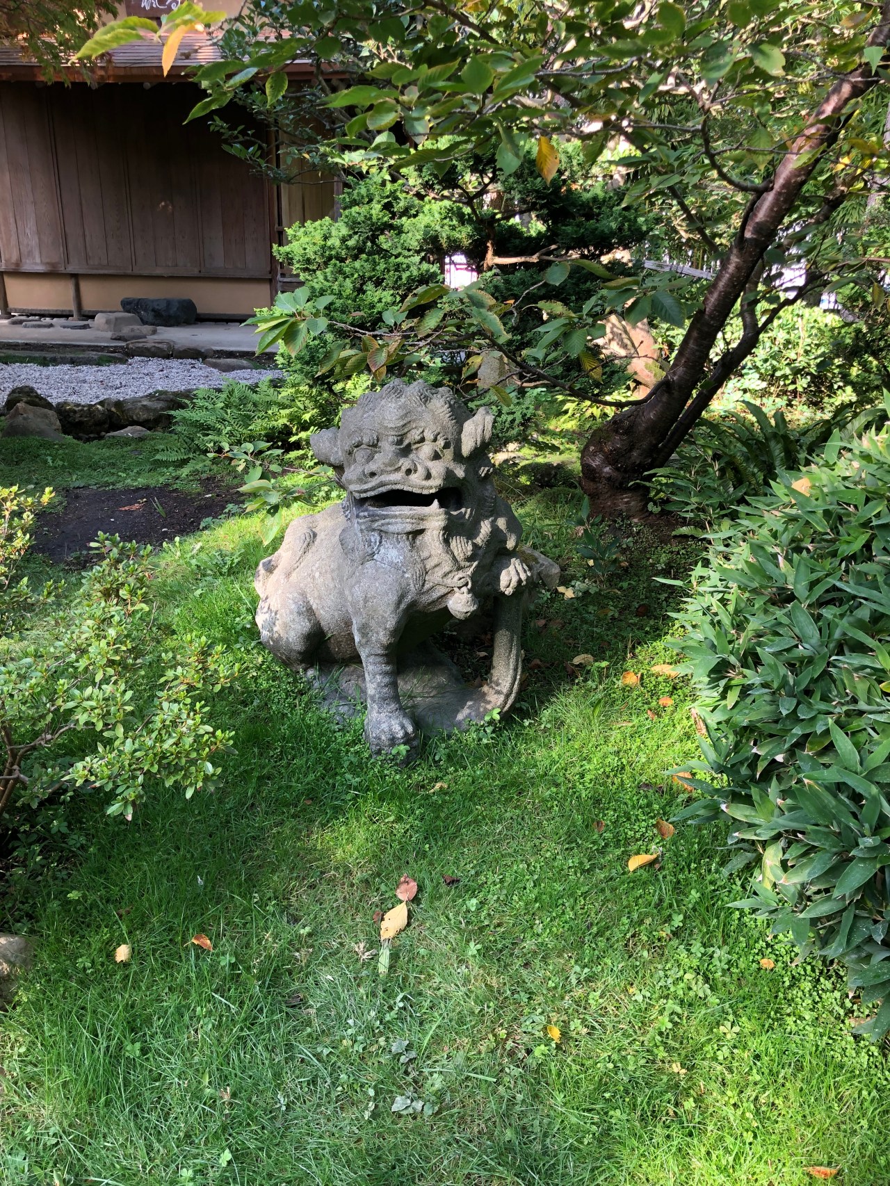 Le jardin était très verdoyant, jaunissant ou rougissant selon les arbres. Un début d’automne avec des fleurs mauves, des arbres avec des oranges trifoliolées (citronnier de Corée), des petites baies jaunes oranges et rouges de buissons ardents. Des décors de bambous qui rompent la monotonie et cassent les différents décors du jardin.