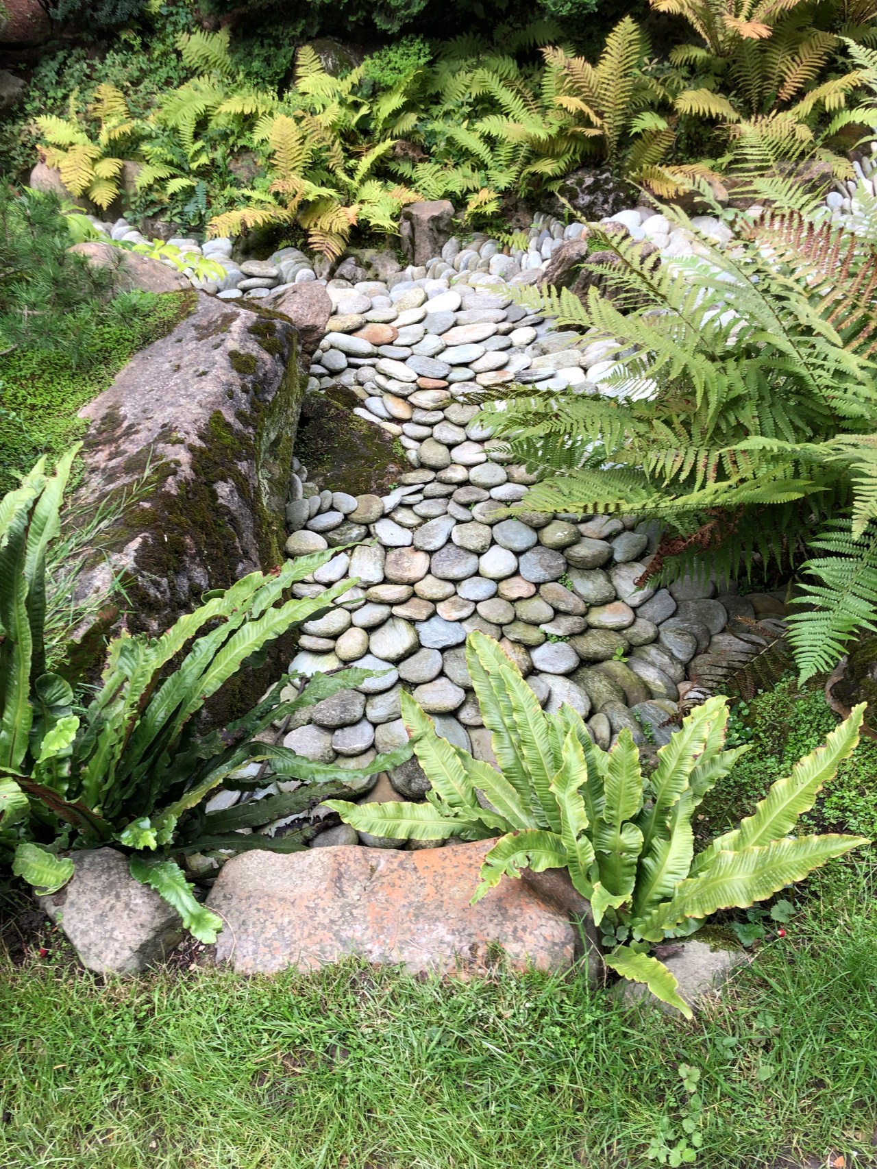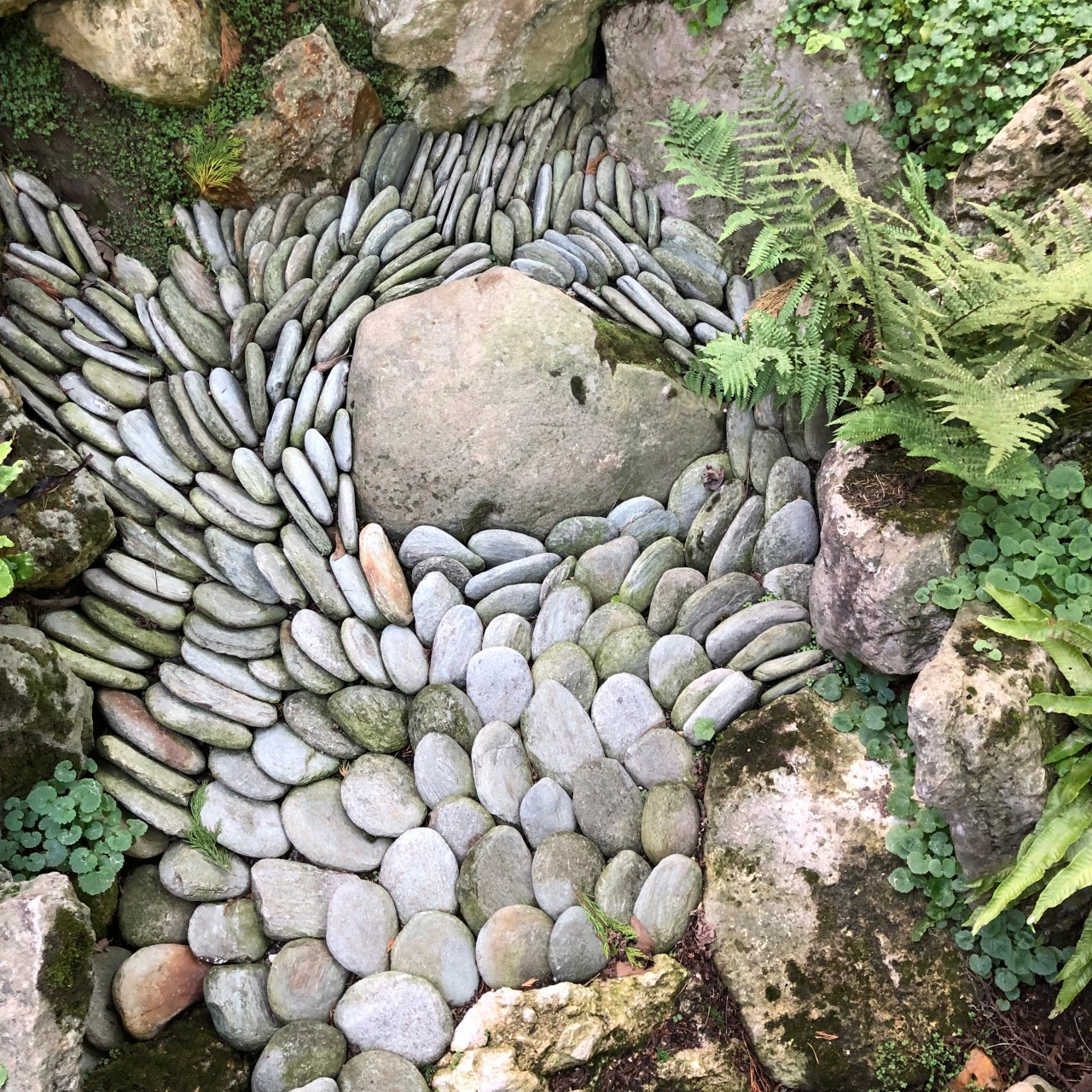 Un endroit que je trouve reposant est celui de la rivière sèche avec les galets qui forme une sorte de fond calme et apaisant. Il finit sur un dôme de galets de forme circulaire comme si un cairn était monté en forme arrondie. La forme des galets fait une sorte de tableau – un mini rocher, entouré de galets à plat et en épi. On dirait la terre et la mer avec ses remous. Ou un cœur qui bat. On dirait le jeu de l’eau qui coule tranquillement ou bien qui affronte les roches, s’y heurte et repart pour couler à nouveau doucement.