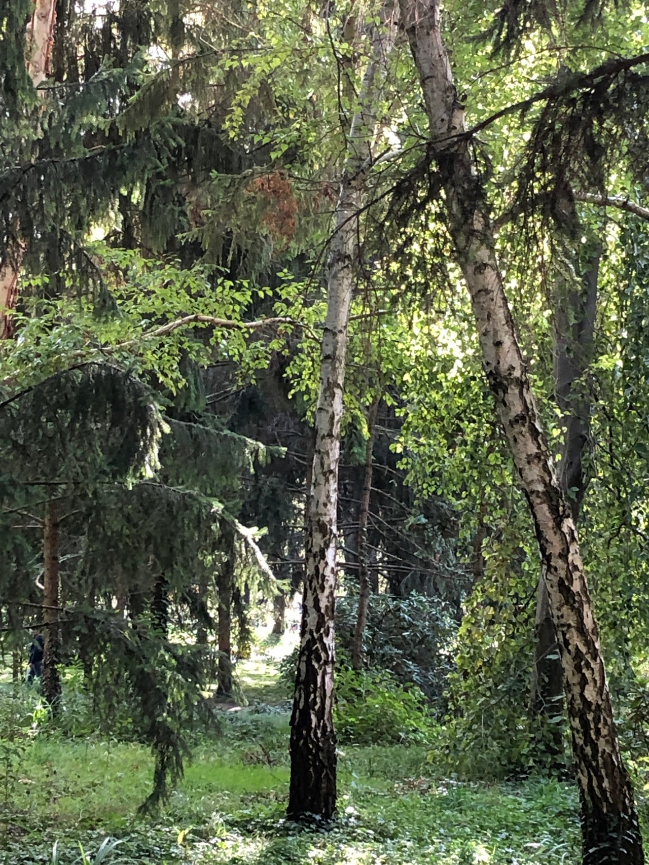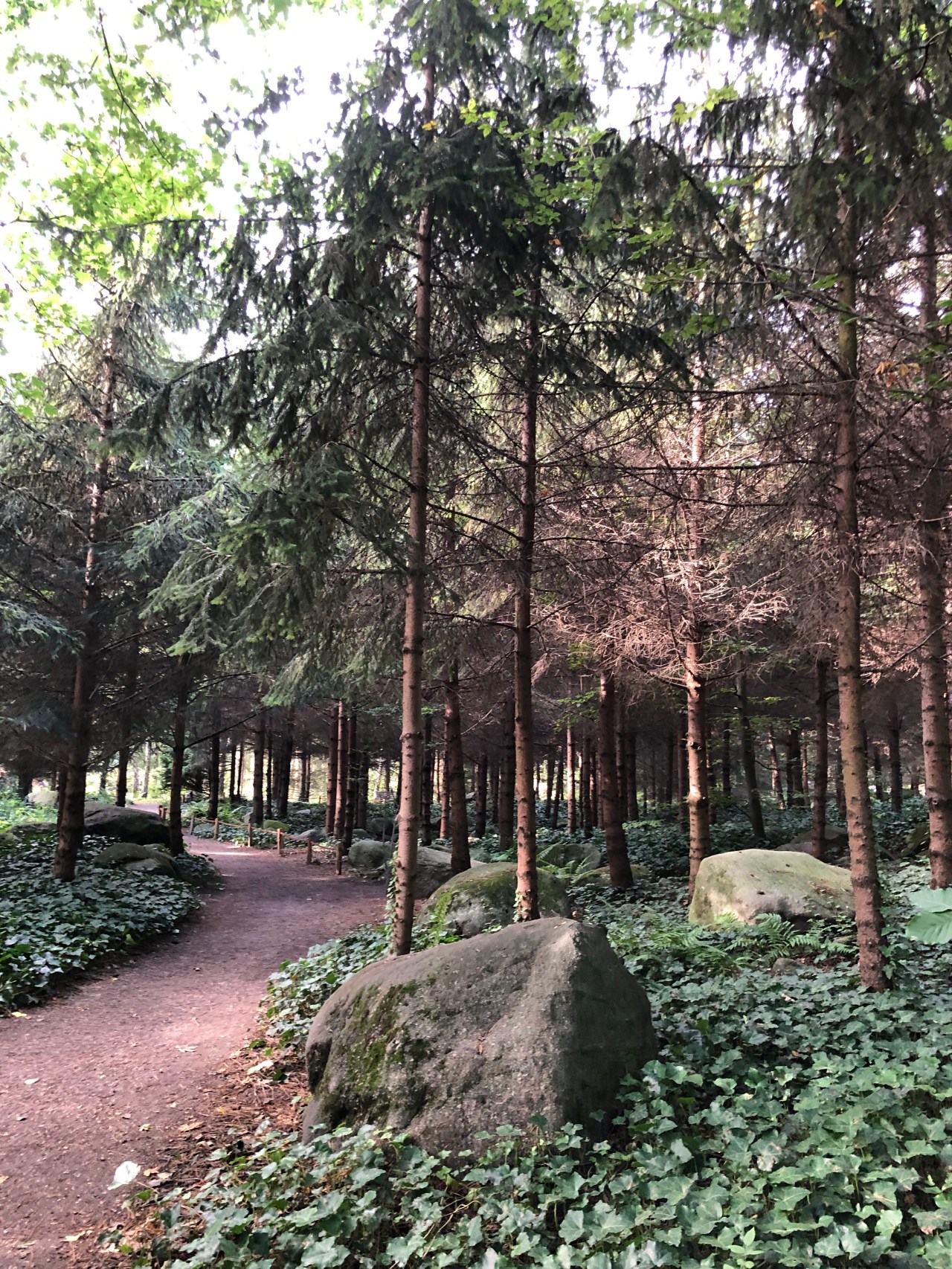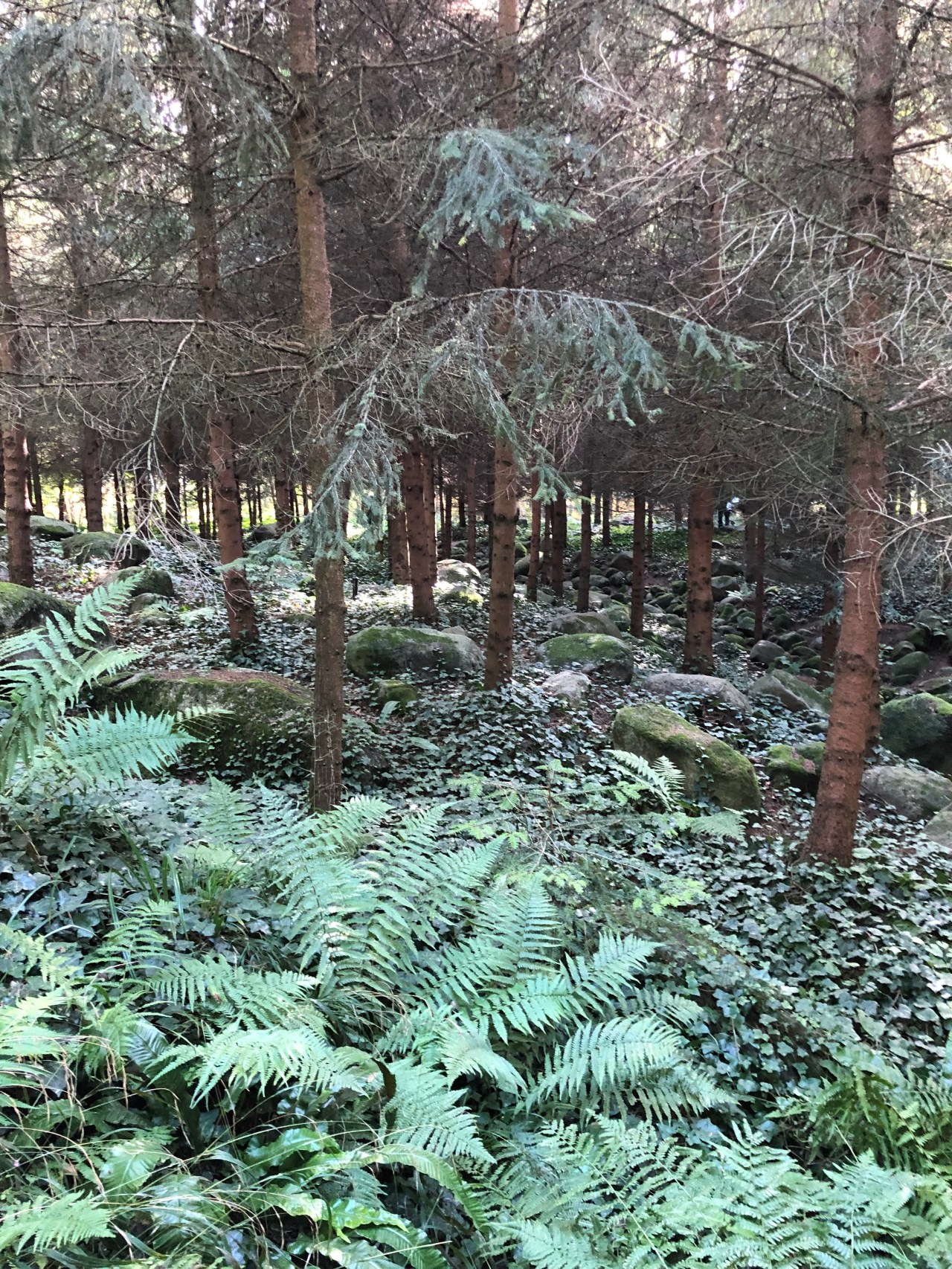 Et puis je suis entrée dans les forêts de bouleaux qui m’ont rappelé la Russie ; les grands cèdres qui m’ont projeté au Liban ; les pins qui parlent Vosges mais aussi Canada ; les grandes fougères qui grignotent le sol et le font disparaitre. Et les conifères et leurs fruits pointés en l’air tout roux.
