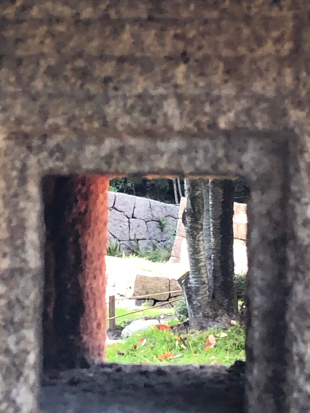 On atteint alors le pont japonais rouge qui enjambe un petit lac où des carpes grises, oranges ou rouges nagent et se pavanent. De grosses pierres permettent de retourner vers l’autre rive. Je me suis assise à cet endroit pour regarder ce site apaisant et flamboyant ; regarder les arbres et les bambous qui poussent autour et apprécier les couleurs rouges qui pointent le bout de leur nez. Le pont rouge était le point d’attraction du lieu où tous se prenaient en photo comme les japonais adorent le faire sur un lieu connu. Il y a aussi cet arrondi autour d’un arbre, fait de pierres, qui donne l’impression d’une piste de vélodrome ou d’être dans l’espace entouré de comètes. Une forme de vertige vous prend et vous étreint.