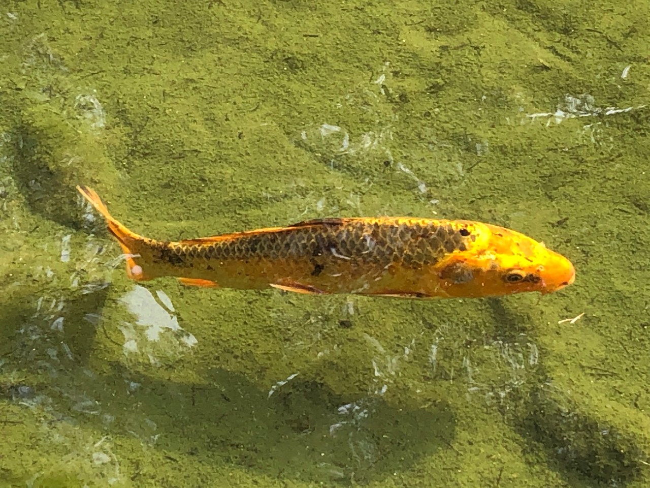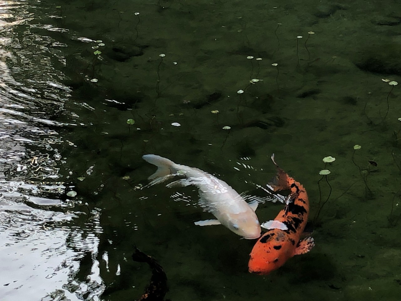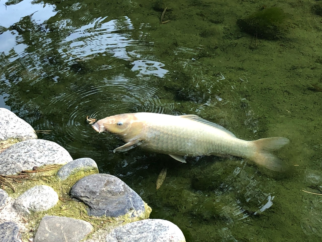 Je me suis assise sur des galets pour me réchauffer au soleil et profiter des derniers rayons de la journée. Regarder les poissons – carpes nager, gober et se faufiler les unes contre les autres à la recherche de quelque chose à manger.