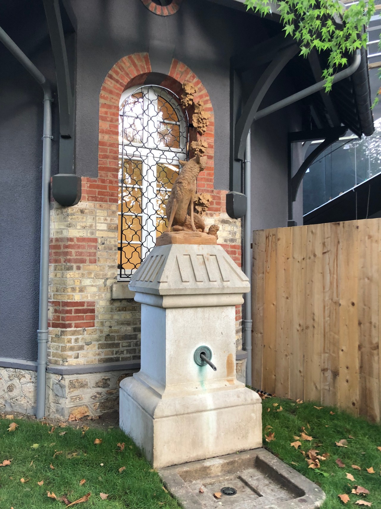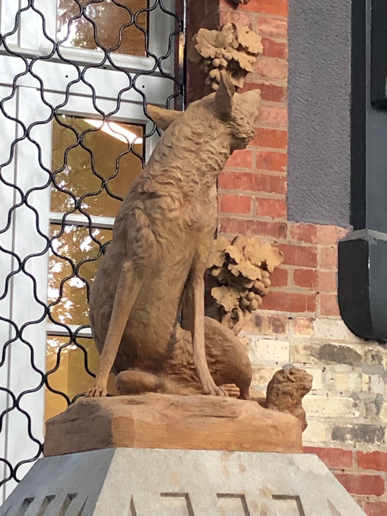 Vous êtes accueilli par une fontaine où trône un chien ou plutôt un renard qui regarde les grappes de raisins qui longent la maison. Clin d’œil à La Fontaine ?