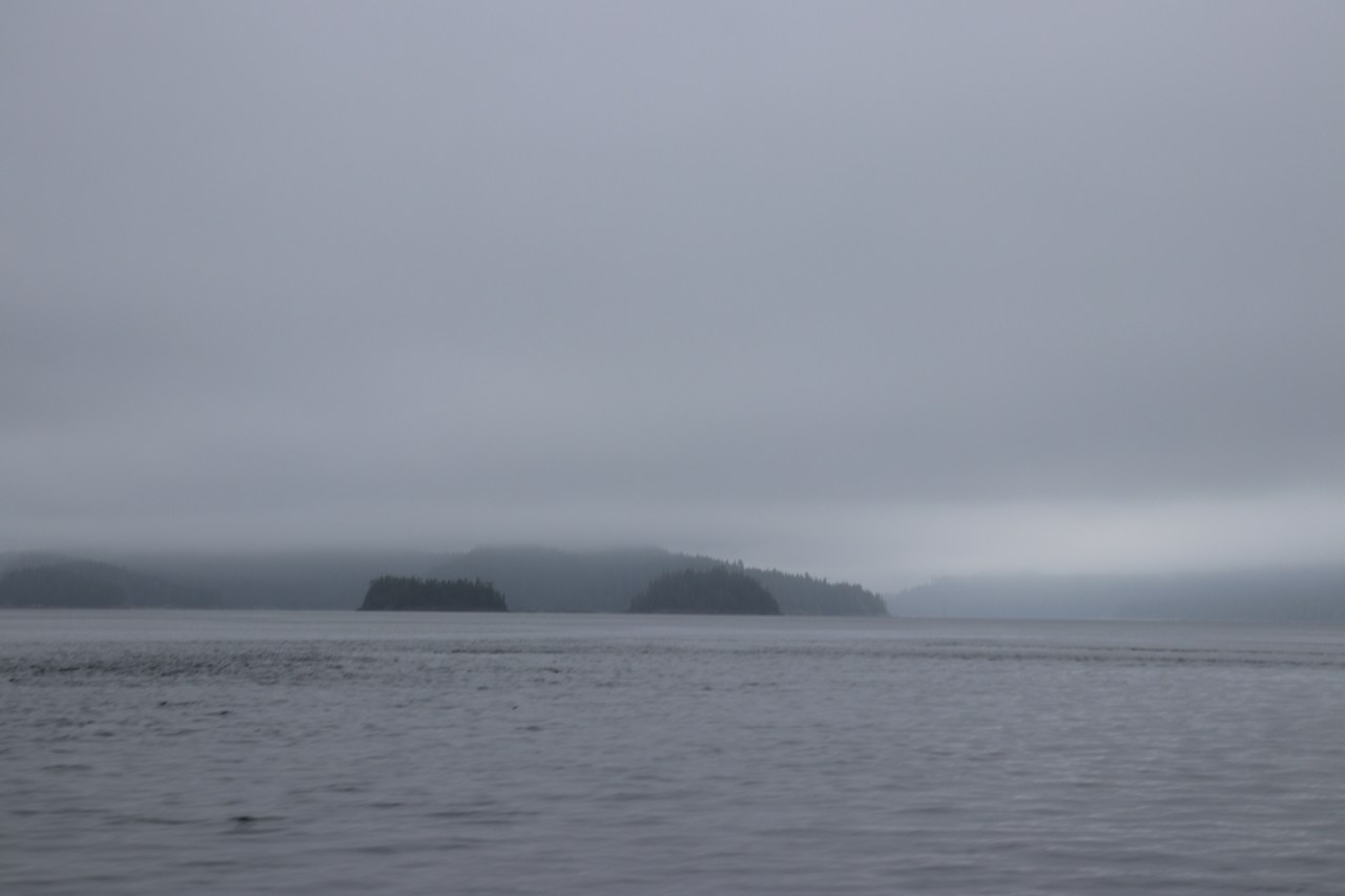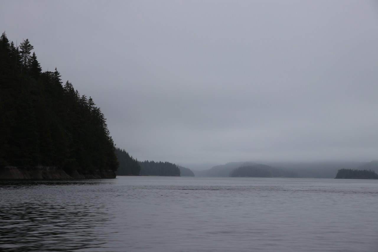 Le brouillard nous entourait et nous foncions ventre à terre sur la mer plate et calme à la recherche des ours bruns. Le paysage était triste voire glauque et je me demandais dans tout ce cocon gris ce qui allait bien pouvoir ressortir. Allions nous voir des animaux qui comme nous devaient se protéger des morsures du froid et rester tapis dans les arbres.