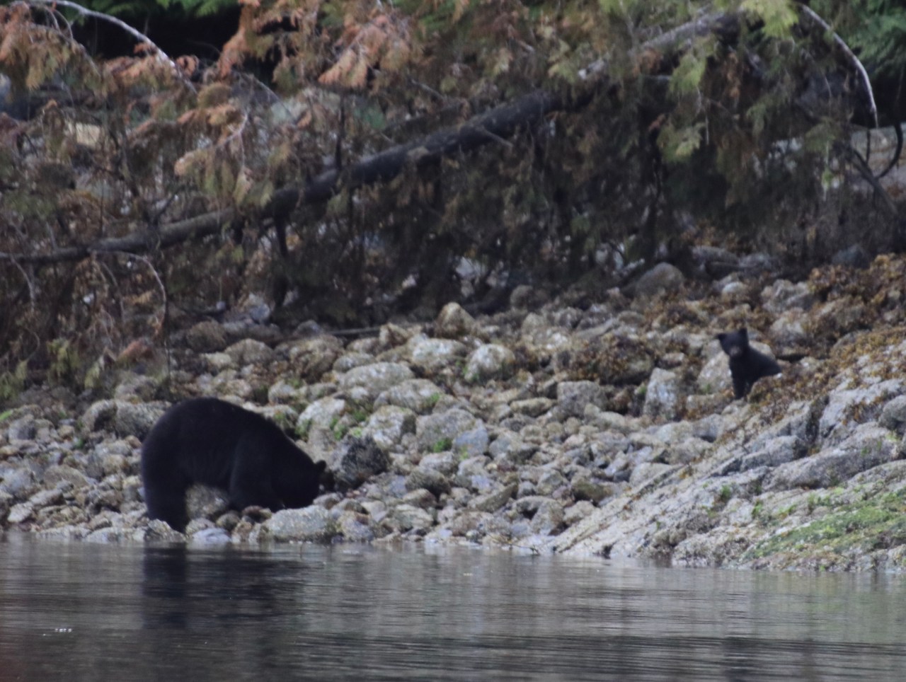 Et puis tout à coup, au détour d’une baie, proche d’une forêt bien touffue que voyons nous au bord de l’eau : un ours et son ourson. De loin ils sont lilliputiens mais en s’approchant nous pouvons les voir. L’ourson en entendant le bruit des bateaux est allé se cacher dans les arbres et impossible de le déloger. Il pleurait et criait mais sa mère ours continuait son chemin le long de la berge pour manger des tous petits crabes qu’elle cherchait sous les pierres et les galets. Travail énorme que de soulever des grosses pierres et de chercher de quoi se nourrir et pouvoir donner à manger à son petit. Tant et si bien, qu’elle va s’éloigner de son ourson et le laisser seul à brailler. Très affairée par sa recherche de nourriture elle va vaquer à son activité. Puis au bout d’un moment elle va faire demi-tour et revenir vers le lieu où l’ourson attend.