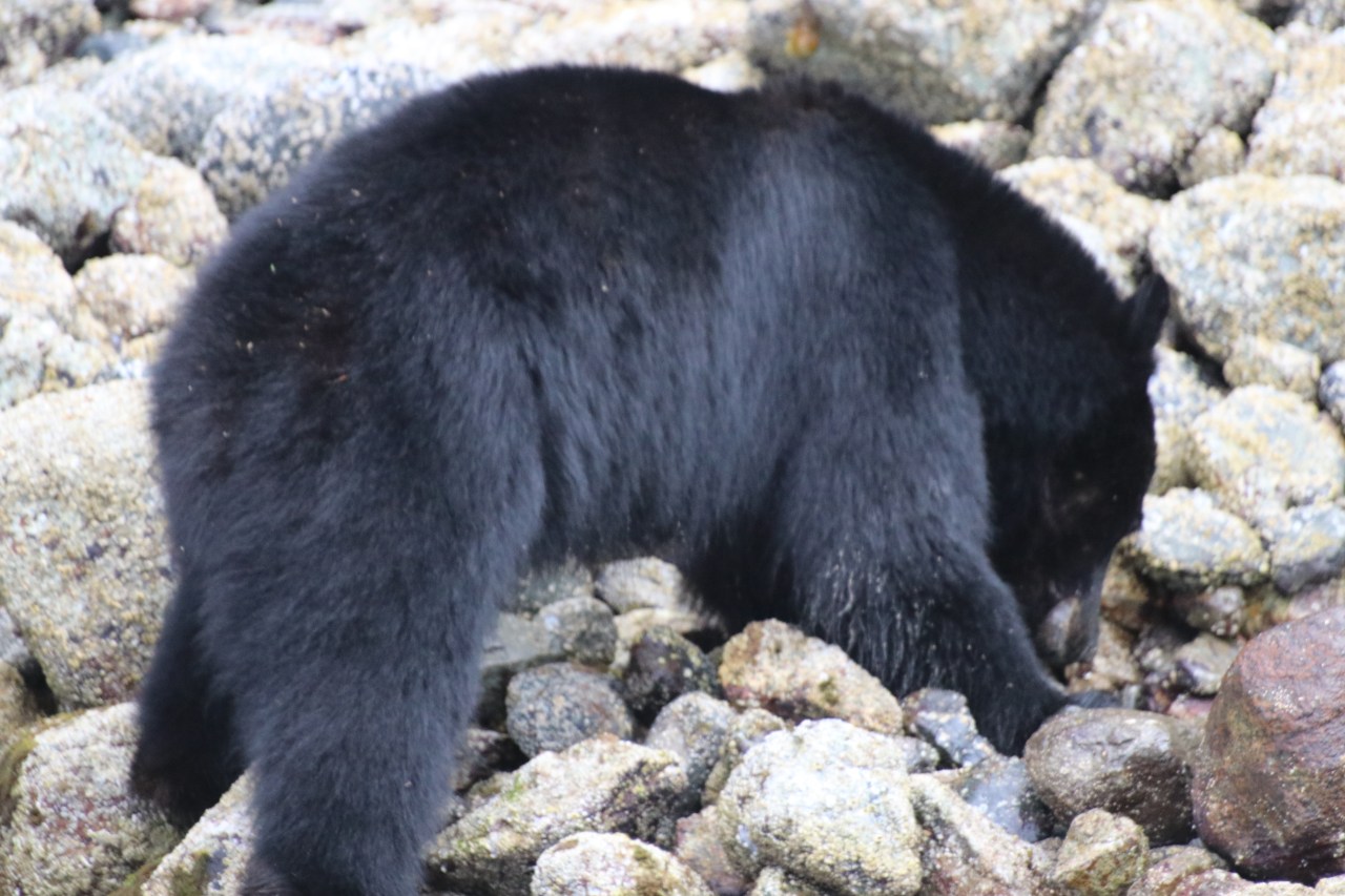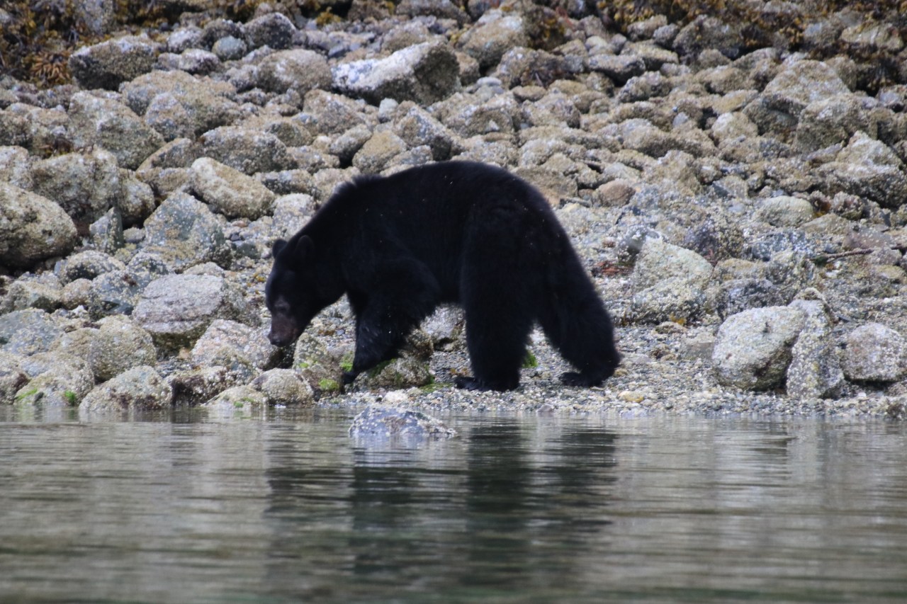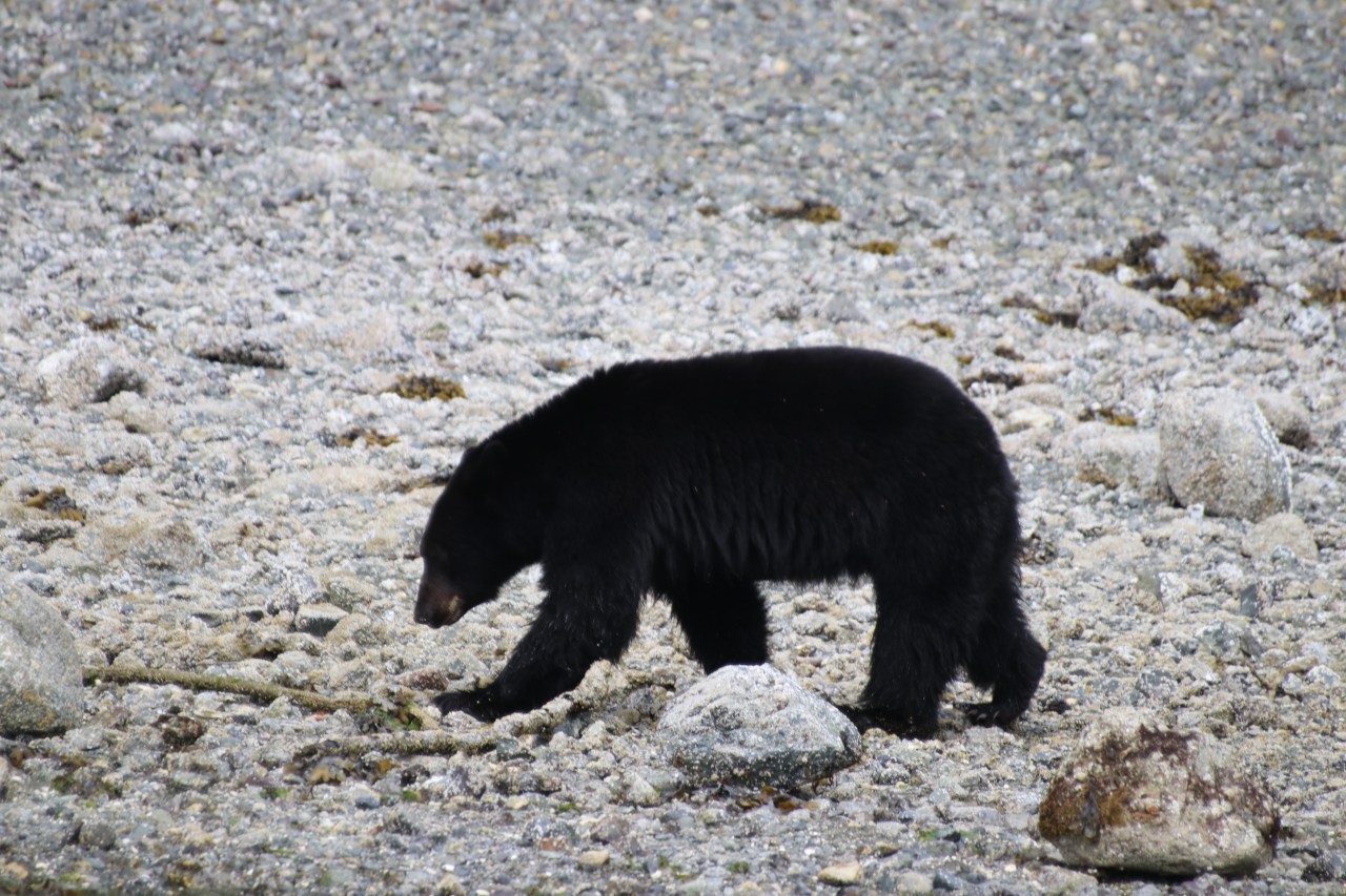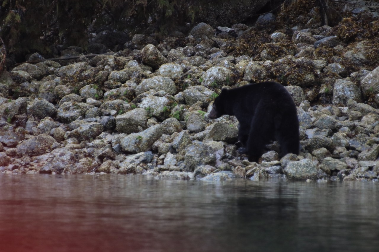 Nous sommes repartis pour éviter de les énerver pour finir par atteindre une autre berge où un ours se baladait tout seul. Lui aussi était très occupé à retourner les rochers pour attraper des petits crabes. Les ours ont l’air d’adorer les mini crabes. Nous aurons pu admirer son postérieur – il ne nous offrait que cela !