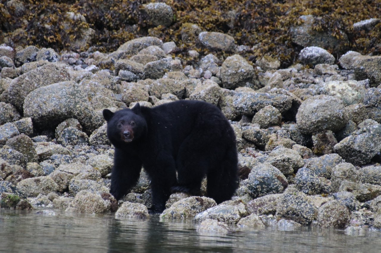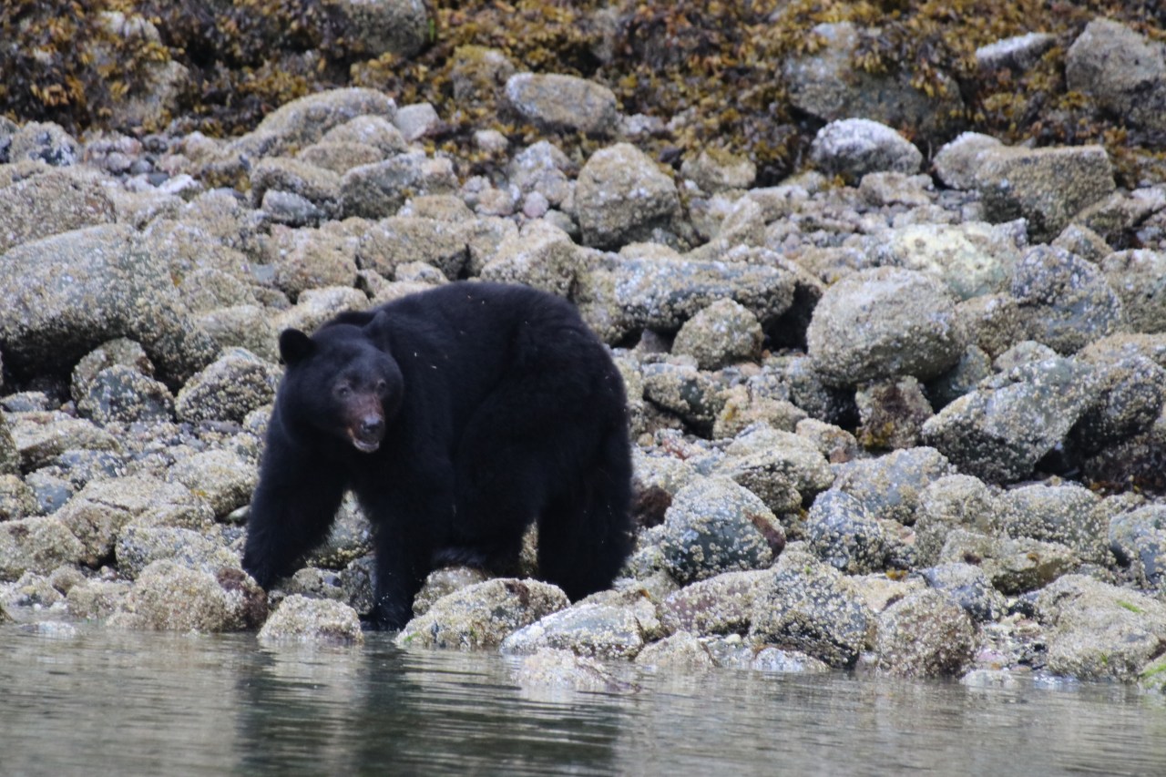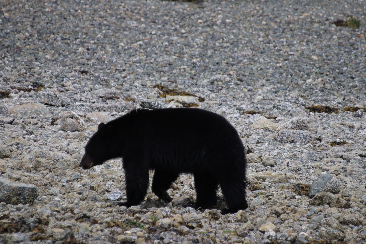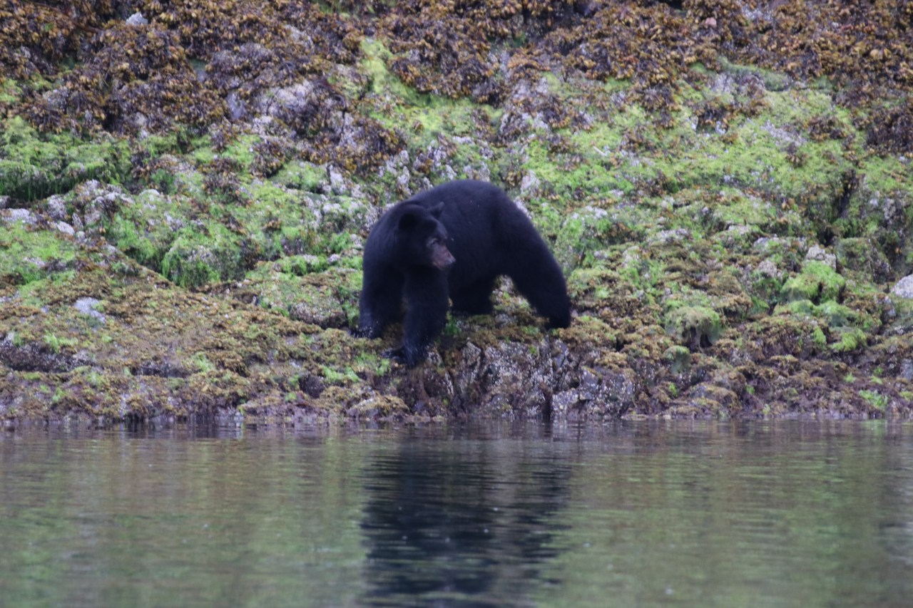 Nous sommes repartis pour éviter de les énerver pour finir par atteindre une autre berge où un ours se baladait tout seul. Lui aussi était très occupé à retourner les rochers pour attraper des petits crabes. Les ours ont l’air d’adorer les mini crabes. Nous aurons pu admirer son postérieur – il ne nous offrait que cela !