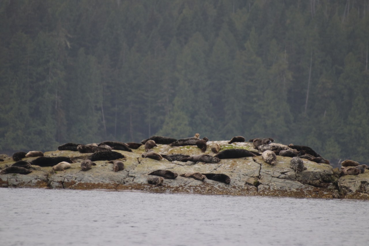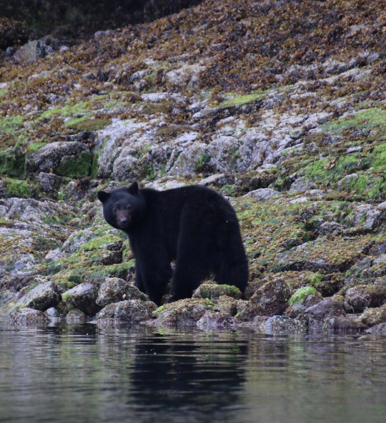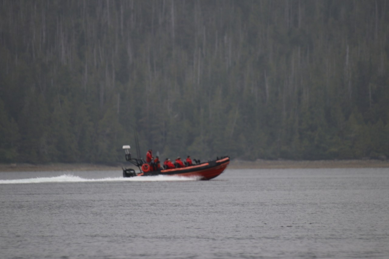 Quarante kilomètres plus loin, le ventre vide, et un café avalé avec un croissant, habillée, harnachée dans une combinaison orange pour sauter sur un zodiac et une matinée à la recherche de l’ours brun à travers les dédales des iles intérieures proche de Tofino.