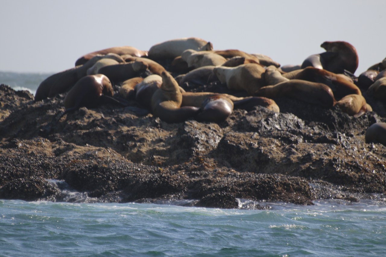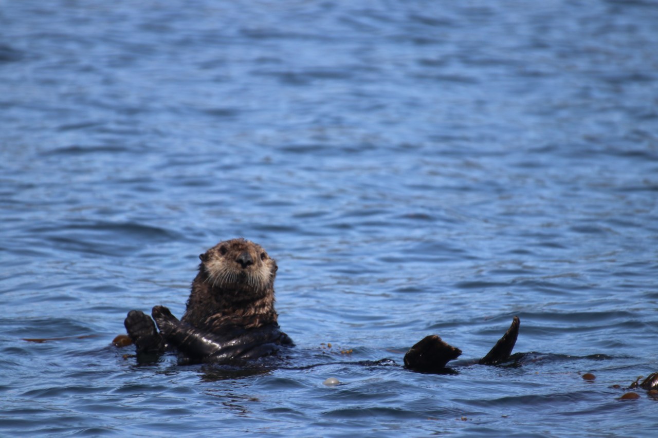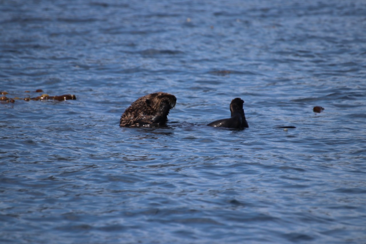 Ceci est un bien grand mot car point de baleines en vue et surtout une mer déchainée qui nous en fait voir de toutes les couleurs. On pouvait mieux apprécier le paysage. En chemin nous avons croisé une queue de baleine et sommes parties à la recherche de la baleine qui a joué à cache-cache avec nous. Nous ne l’avons pas revue et elle s’est bien ri de nous ! Mais nous avons rencontré une jolie loutre de mer qui elle s’est donné un plaisir de nous accompagner et de nous montrer comme elle était belle. Elle mangeait quelque chose et tenait ce quelque chose entre ces pattes. Elle faisait la planche et nous regardait droit dans les yeux.