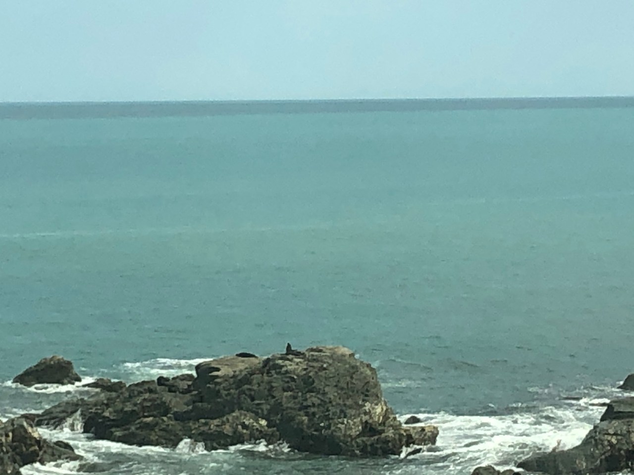 On continue notre train-train vers les montagnes pelées jaunes pour arriver très rapidement vers la côte et l’océan pacifique. Et là commence la grande aventure le long des plages immenses, plates et rocheuses où les albatros, les mouettes volent et font un bruit d’enfer ; où les baleines viennent vous narguer ; où les dauphins vous font signe des nageoires et des queues ; où les otaries viennent se baigner ou se faire « dorer » sur les rochers bordant les rails du train.
