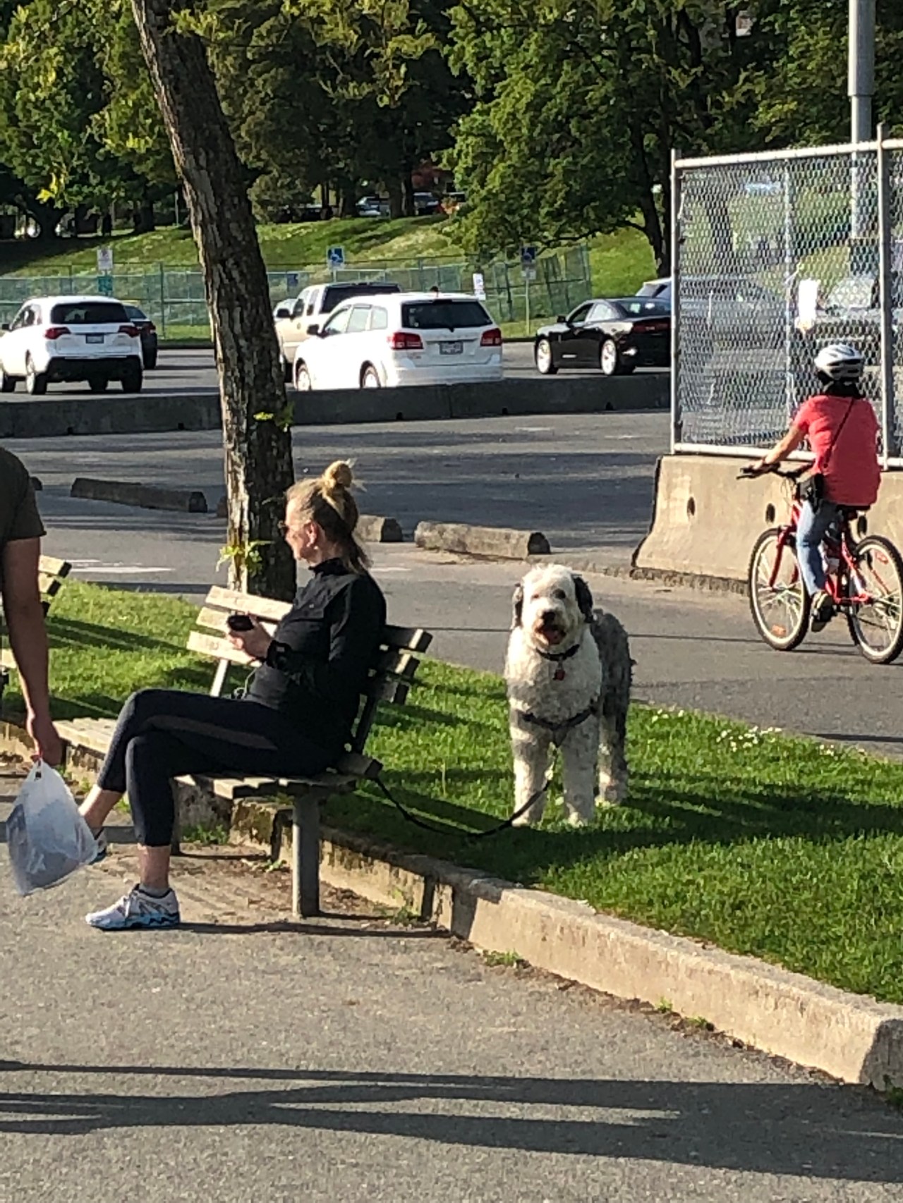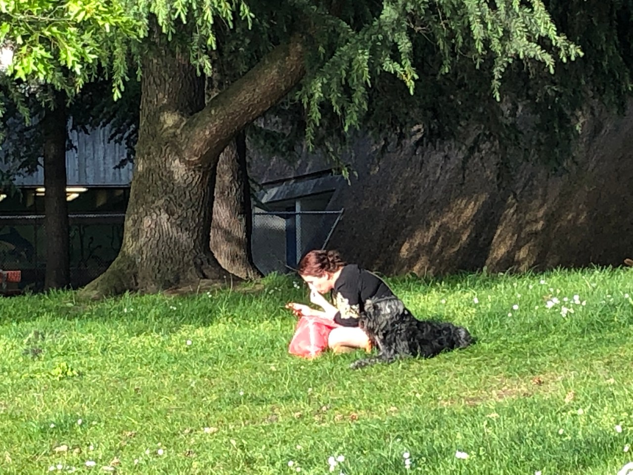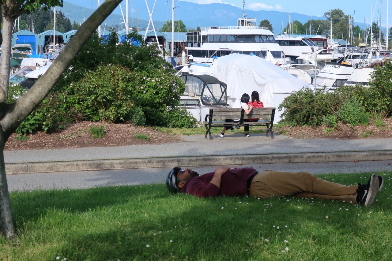 Et puis cette femme plus studieuse qui lit, assise sur l’herbe, accompagnée de son chien qui regarde le paysage, abritée du soleil sous un arbre. D’autres se baladent le long des palmiers et admirent le coucher du soleil proche. Une autre fait une pause, après un jogging, sur un banc, son bobtail entravé par la laisse regarde les passants. Et puis il y celui qui a trop bu et cuve son vin sous un arbre tout proche du port de Vancouver. Des couples qui papotent en plein soleil.