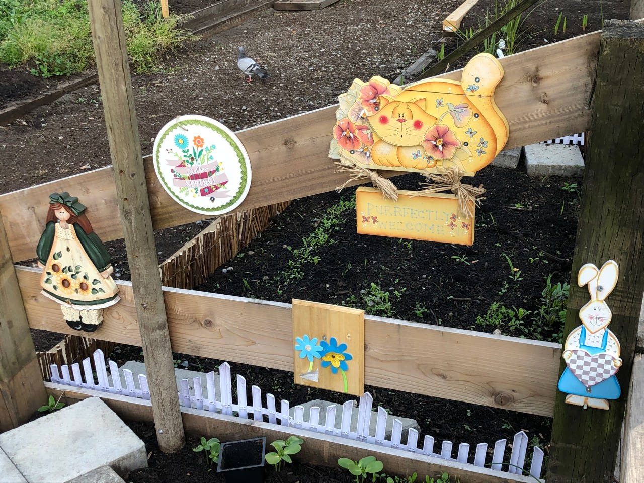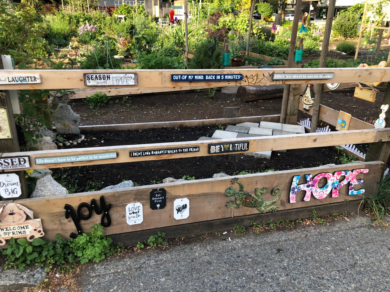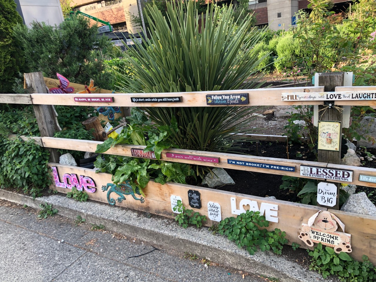 Il y a aussi les jardins des communautés où les personnes qui ont un lopin de terre viennent gratter la terre, y planter des fleurs ou des légumes ; papoter entre amis ou co-locataires et arroser leurs plantations. Je dois dire que cet endroit est véritablement un havre de paix en plein centre ouest de Vancouver où il fait bon respirer. Et puis les bordures de ce jardin sont décorées de manière très attractive avec plein de slogans remplis de bonheur : espoir, joie, aimer ce que vos faites, beau, je suis ailleurs et je reviens dans cinq minutes, la vie n’a pas besoin d’être parfaite pour être magnifique. Soyez heureux, soyez lumineux, soyez-vous ! J’en passe et des meilleures. Ça vaut le coup de les lire et de passer du temps car vous vous sentez heureux, léger et plein de vitalité intérieure. Et puis les potagers sont ornés de petites filles, de chats ou de lapins en bois peints. Petit clin d’œil aux enfants et leur plaisir naïf. Puis relevant le nez j’aperçois deux pigeons amoureux (ou pas), assis sur le haut d’une séparation en grillage, se serrant l’un contre l’autre et roucoulant. L’endroit me porte encore et je pense souvent que nous devrions à Paris mettre plus de verdure et de communauté entre les hommes qui y habitent.