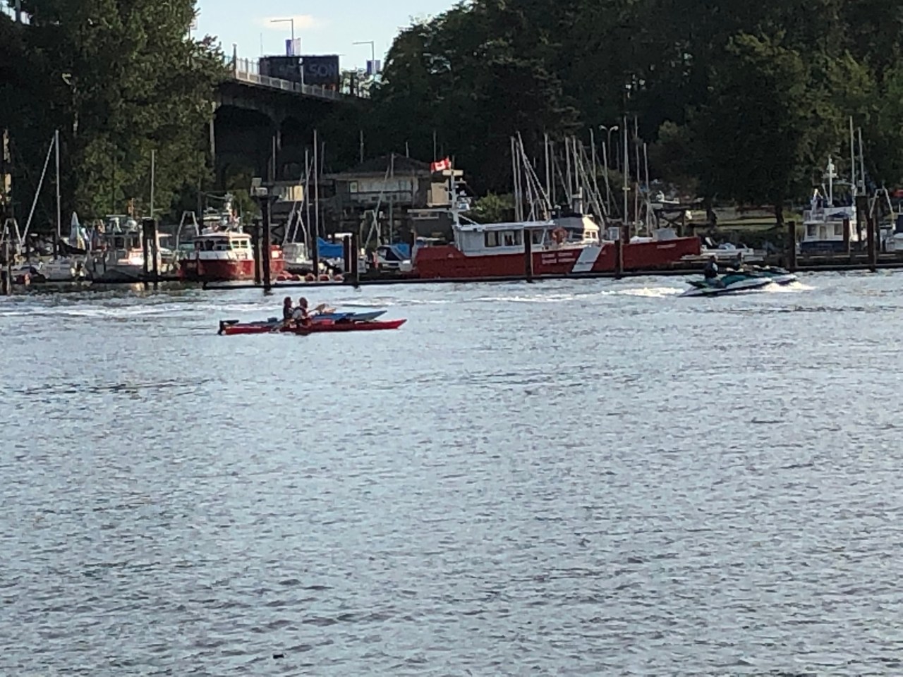 Et puis il y a les bateaux qui passent : les gros yachts qui sortent du port, les voiliers qui reviennent au port et les canoés kayaks qui sont poussés à la force des bras et qui évitent les gros bateaux et les scooters de mer. Et les canards qui jonglent dans cette jungle et avancent en rang profitant de la voie libre de tout danger.