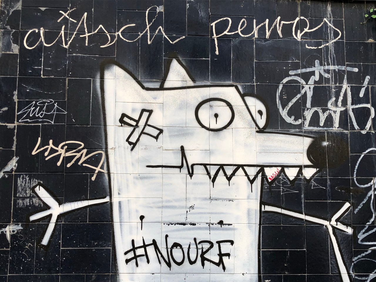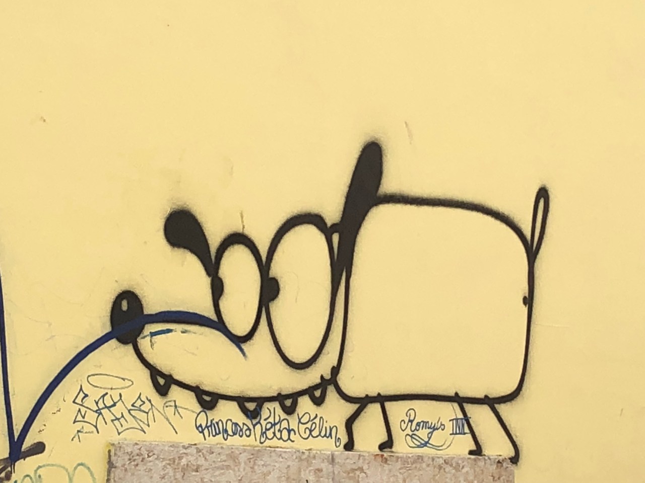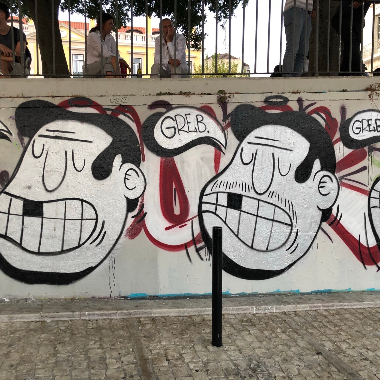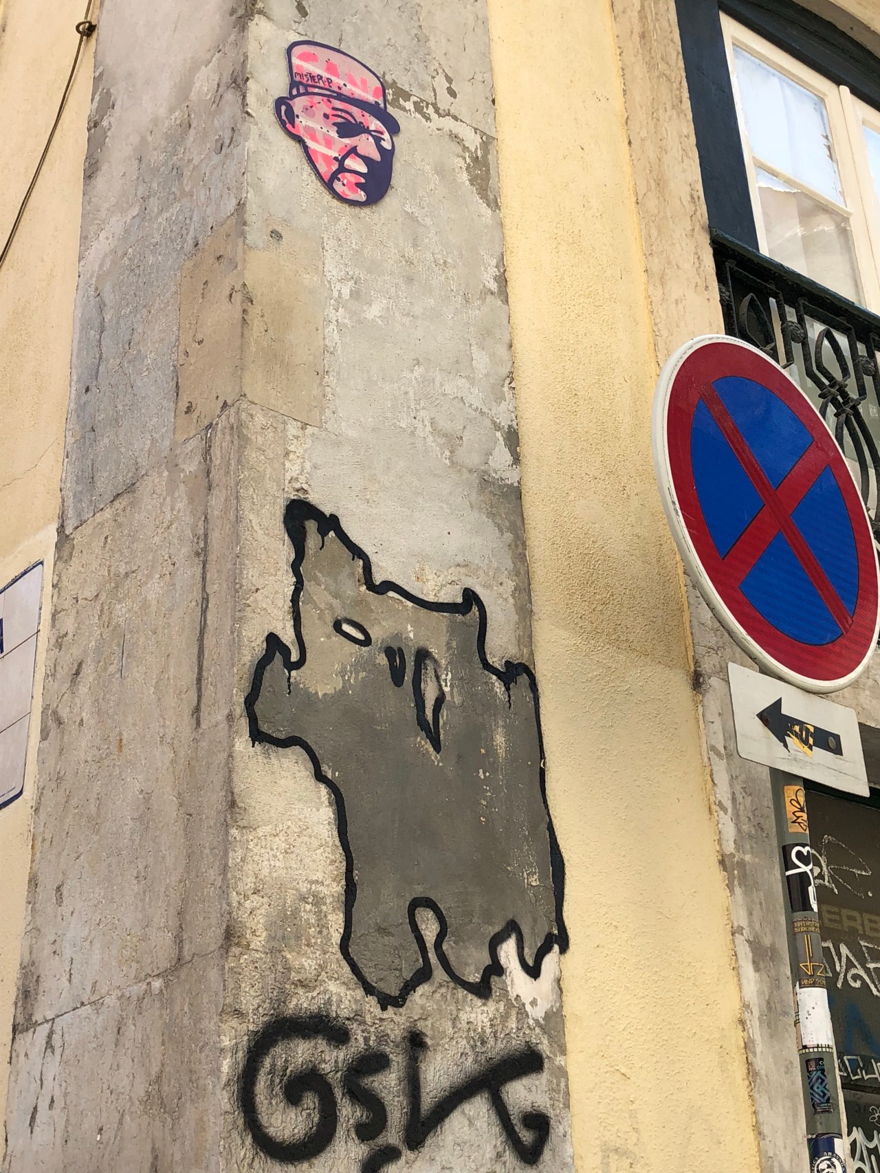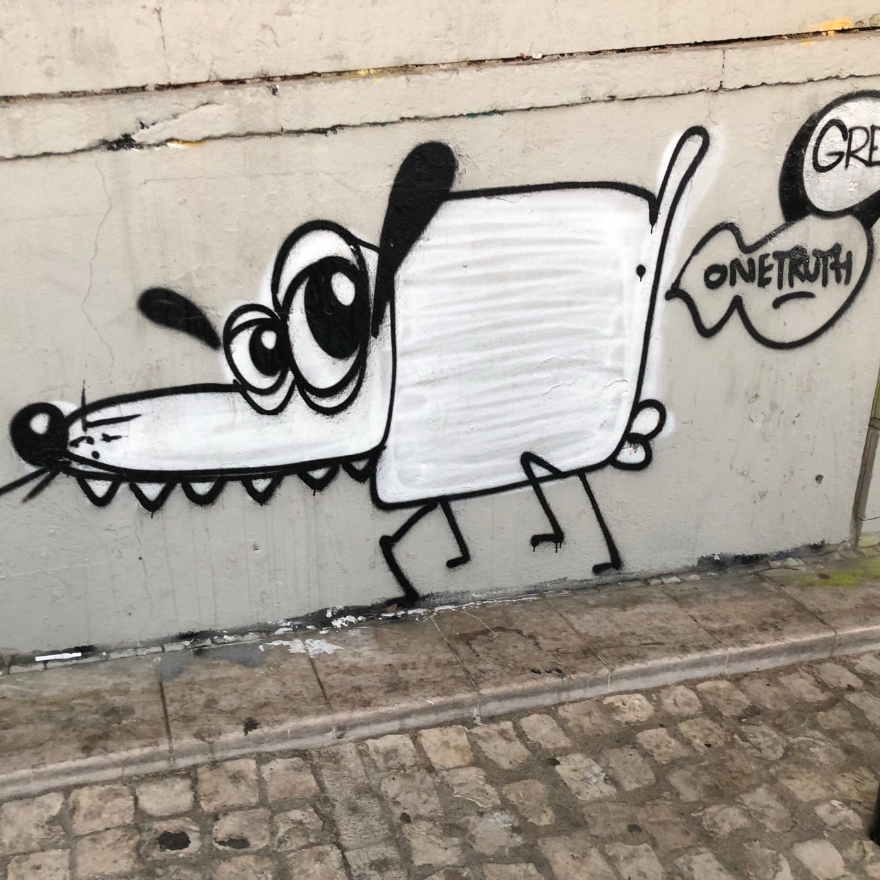 Près du Mirador Santa Catarina vous faites face à des grandes gueules aux dents bien visibles comme dans les BD. L’artiste doit être Greb puisque l’on trouve sa signature partout autour de ses œuvres. Il a dessiné aussi un chien au long nez qui crotte des « one truth » une vérité. Laquelle je ne sais pas mais la gueule du chien et ses yeux m’amusent. Et je l’ai recroisé à plusieurs endroits du Bairro Alto cette fois crottant des cœurs (love) ou bien sans rien. Ses yeux et ses oreilles sont trop drôles. Un autre blanc sur du noir avec un sparadrap, les dents à l’air. Il semblerait que ce soit une tradition les chiens à Lisbonne.