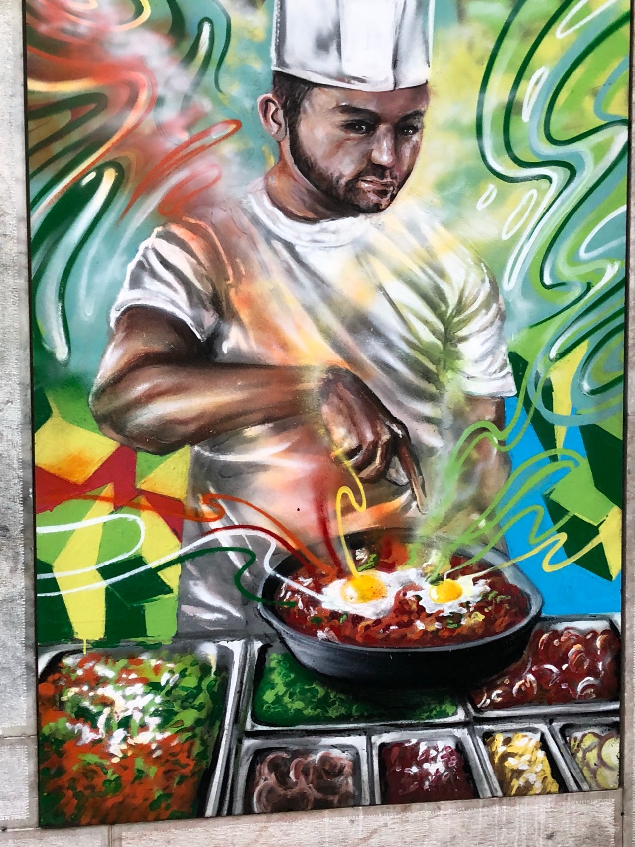 Devant un restaurant dans le Bairro Alto il y a la peinture du cuisinier qui prépare une sorte de wok à la coréenne.