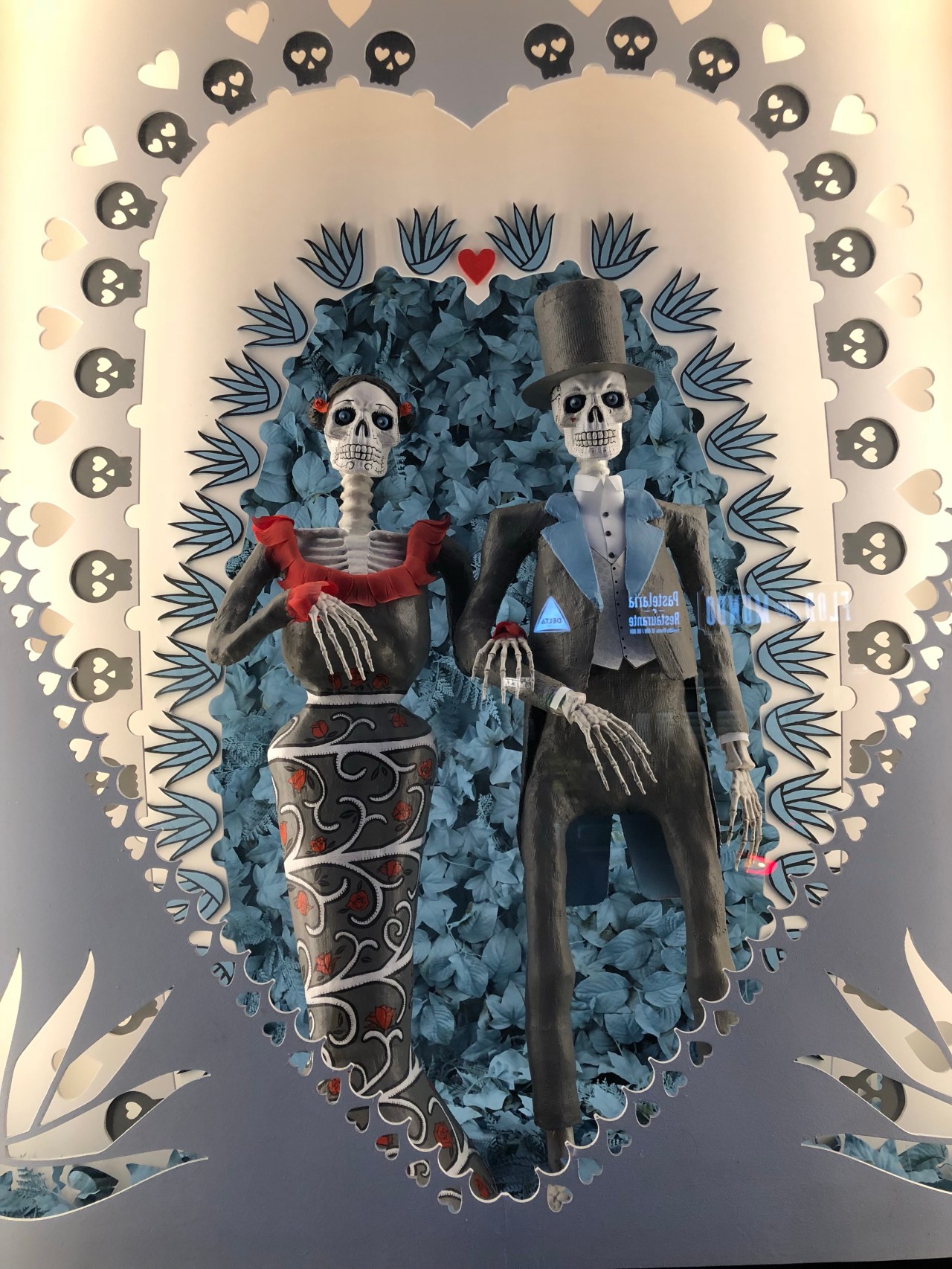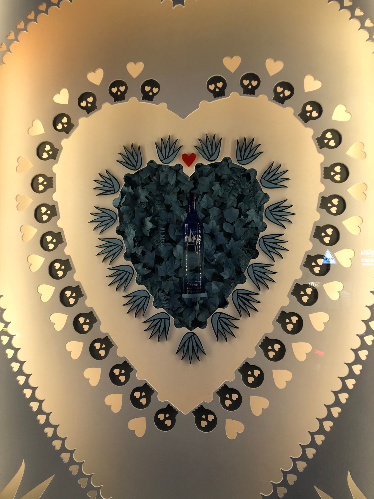 Certains magasins me réjouissent en particulier celui qui fait référence à l’artiste Frida Kahlo avec les personnes – cadavres habillés et entourés de cœurs. Un peu flippant mais rigolo ! Et la bouteille de tequila « Milagro » cintrée de cœurs qui s’empilent les unes sur les autres comme une collerette à la Colette. J’ai trouvé le décor très art déco et m’a donné envie de le photographier.