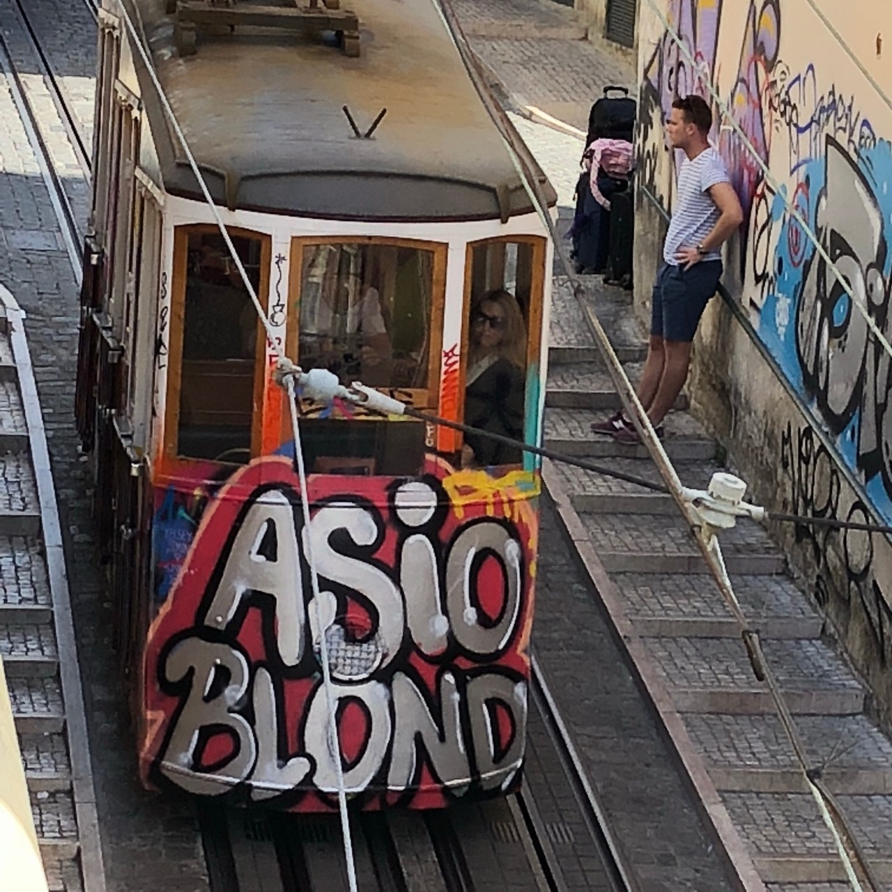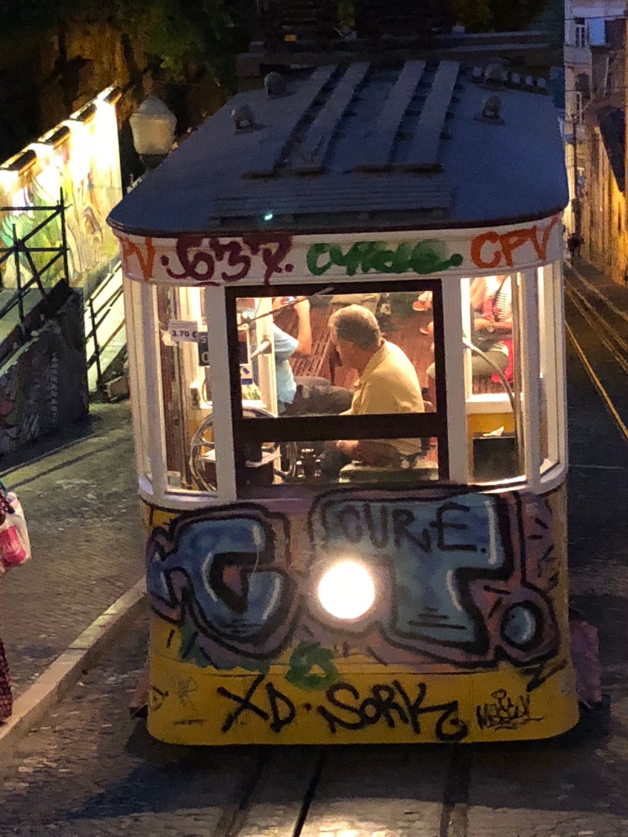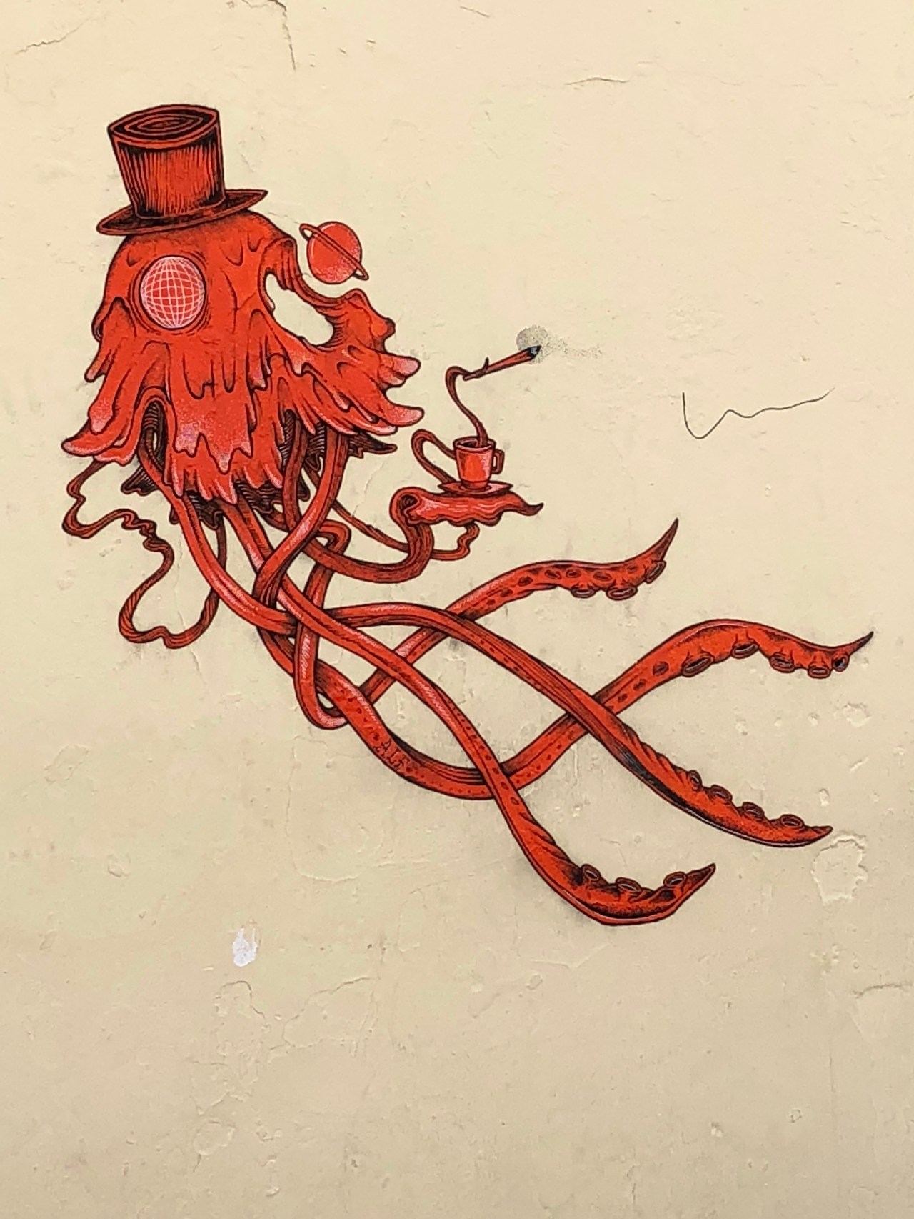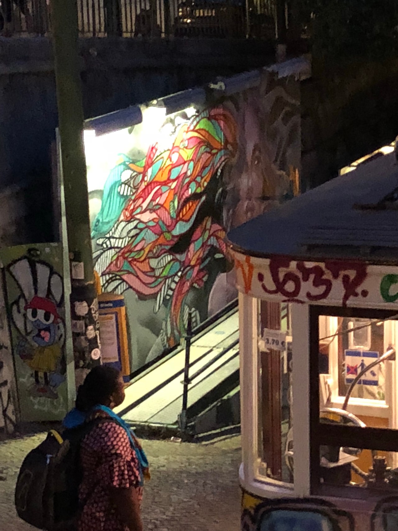 Même les trams sont tagués que ce soit celui de Bica ou l’autre l’ascenseur de Gloria. Et à l’arrivée du Gloria il y a deux dessins : l’une d’un visage avec une tête et des cheveux ressemblant à des lianes ou des pieuvres de couleurs magnifiques. J’en ai recroisé une pieuvre toute rouge – sorte d’extraterrestre buvant un café. Et tout en descendant il y en a d’autres.