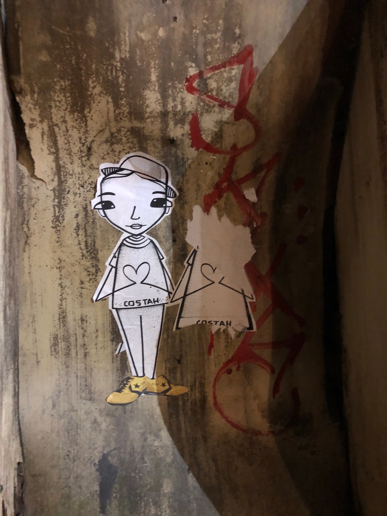 Au coin d’un angle entre plusieurs immeubles j’ai découvert ce joli petit personnage tout en finesse avec un joli petit cœur sur la poitrine avec son chapeau très rétro. J’ai adoré. Il est signé Cos Tah. Là aussi je ne sais pas si c’est l’auteur.