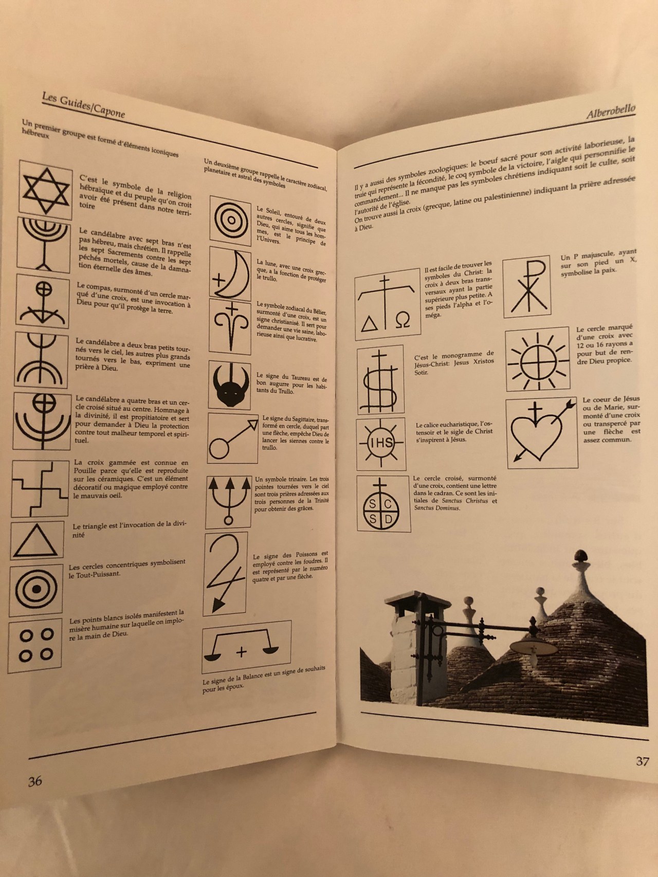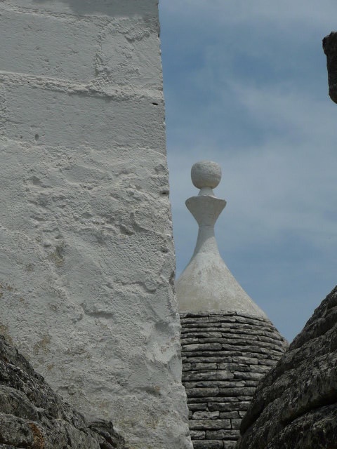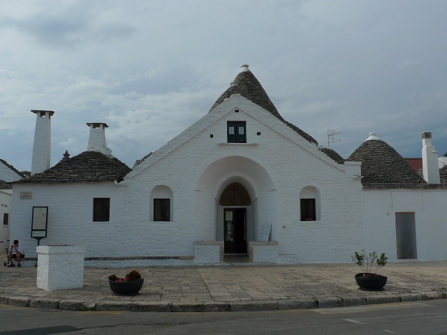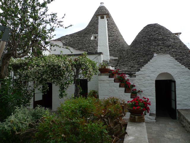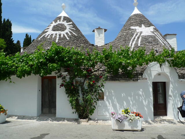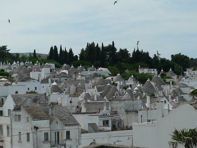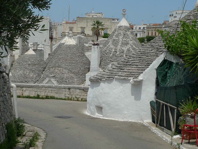 Cette ville est une merveille décorée de petites maisons de mortier recouverte de chaux blanche et de toits en forme conique, pyramidaux ou bien en forme de dômes, faits de pierre en lause calcaire plate superposées les unes sur les autres. Il y a plus ou moins 1500 maisons ou trulli.