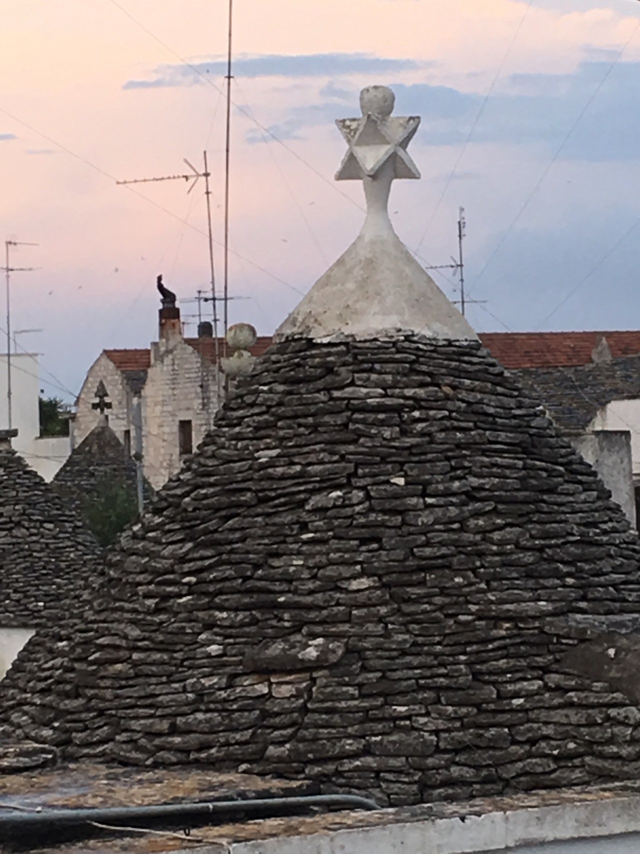 Passée cette place nous avions une vue extraordinaire sur le Monti avec ses maisons et ses trullis. Je suis restée ébahie devant cette forêt de cônes blancs surmontés de boules blanches, disques ou sphères, pyramide, étoile ou ciboire ou d’une croix, sorte de soucoupes volantes posées, aux toits parfois peints de cœurs, de croix ou de points ou de soleil. (je vous laisserais un document sur les symboles)