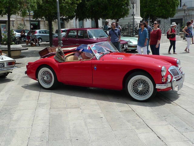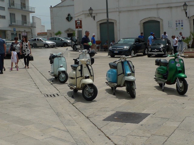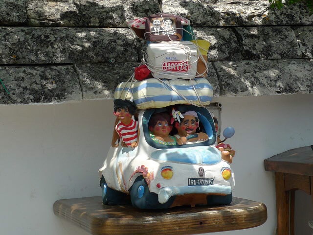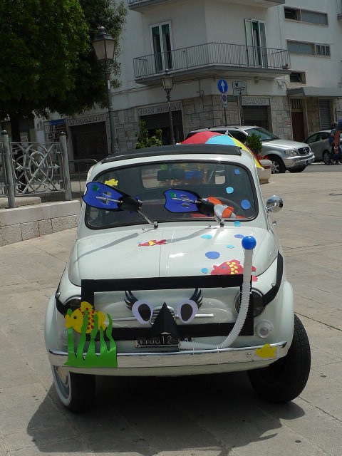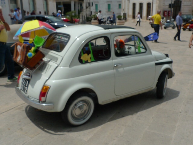 La ville était en fête ce jour-là, car sur la grande place de veilles voitures et des vespas anciennes trônaient. Elles étaient plus rutilantes les unes que les autres. Et puis une fiat 500 pot pourri comme nous l’appelons a attiré mes yeux. Son tuba accroché à l’avant, ses palmes comme essuie-glace et son parapluie ou parasol accroché à l’arrière de la voiture – en fait une valise contenant des bacs à sable et des râteaux, habits complets des enfants et adultes pour la plage et la détente – étaient un clin d’œil à l’été, la mer et le bonheur de la plongée. La dolce Vita italienne dans toute sa splendeur !
