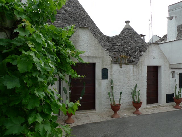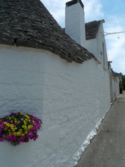 Longer les ruelles blanches était un vrai moment de calme – paradis sur terre malgré les hordes de touristes qui piétinaient les rues adjacentes. S’enforcer dans le cœur d’Alberobello et échapper aux touristes restaient un sport précieux. Ces ruelles étaient si étroites que parfois on se demandait si un humain pouvait passer et longer les murs. Les portes de maisons sont très basses. Les maisons étaient aussi très basses, ventrues et arrondies, mangeant parfois la route où elles étaient accolées. Au coin de chaque maisonnette un bouquet de fleurs ou bien des plantes vertes qui pendaient aux portes ou le long des murs. Une ville minimaliste !