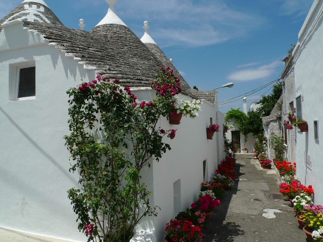 Une impression de jamais vu, de village étrange voire lilliputienne dont on attendait de voir sortir des nains ou des gens différents de nous. Des forêts de fleurs agrémentaient ces trullis faisant des couronnes de jasmin odorant le long des murs. Un paradis minimaliste sur terre.