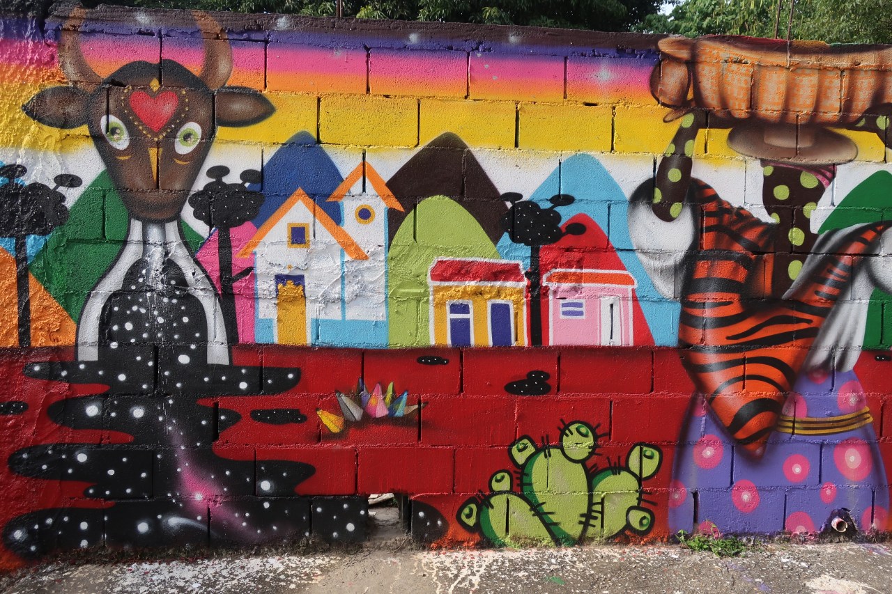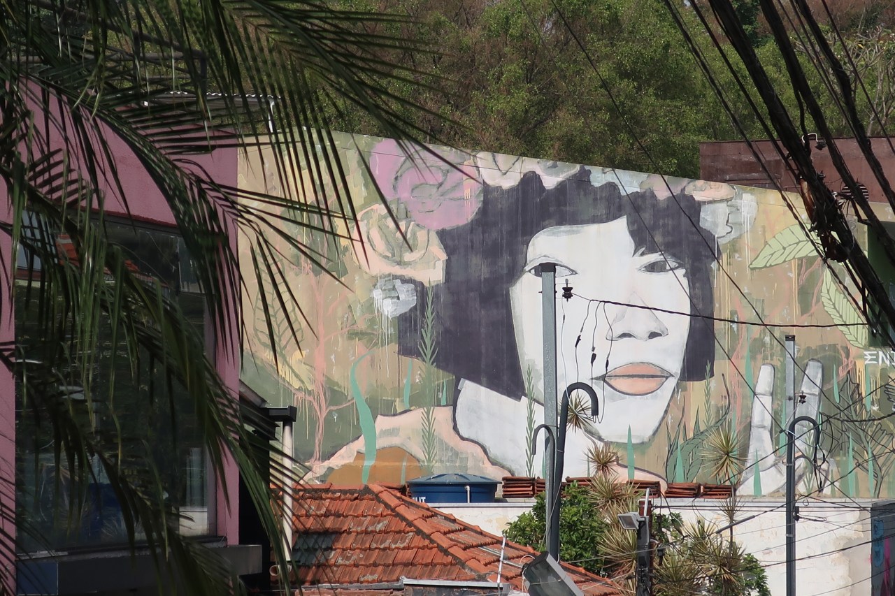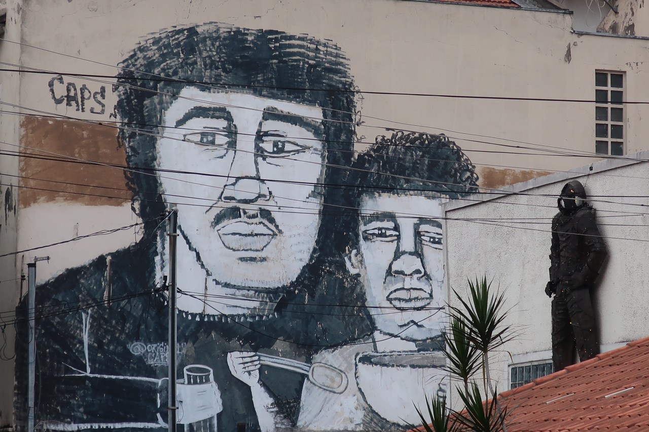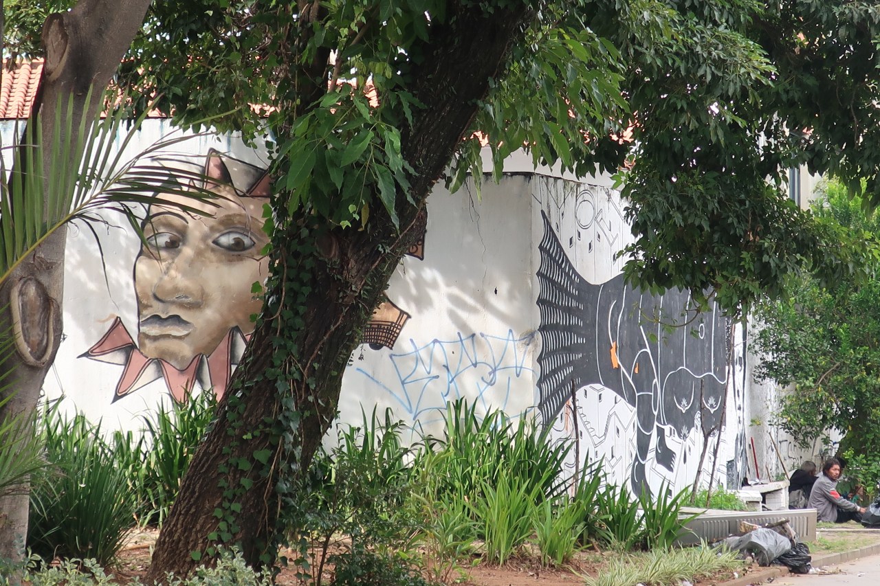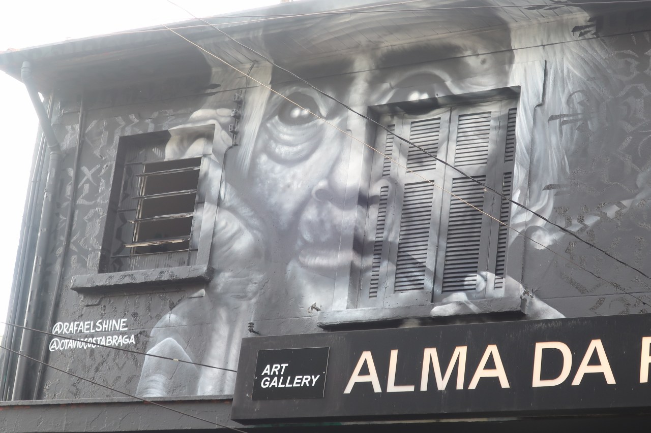 Près du Monastère San Bento et dans sa cour même on y trouve un chat stylisé à double tête surplombant, surveillant ou protégeant une fillette à la kalachnikov. Pas un coin de mur n’est laissé à l’abandon, même les plots pour empêcher les voitures de monter sur les trottoirs sont peints – tête de chat avec des palmiers plantés dessus, comme coiffure punk ; ou bien tête de femme allongée, bleue aux yeux globuleux.