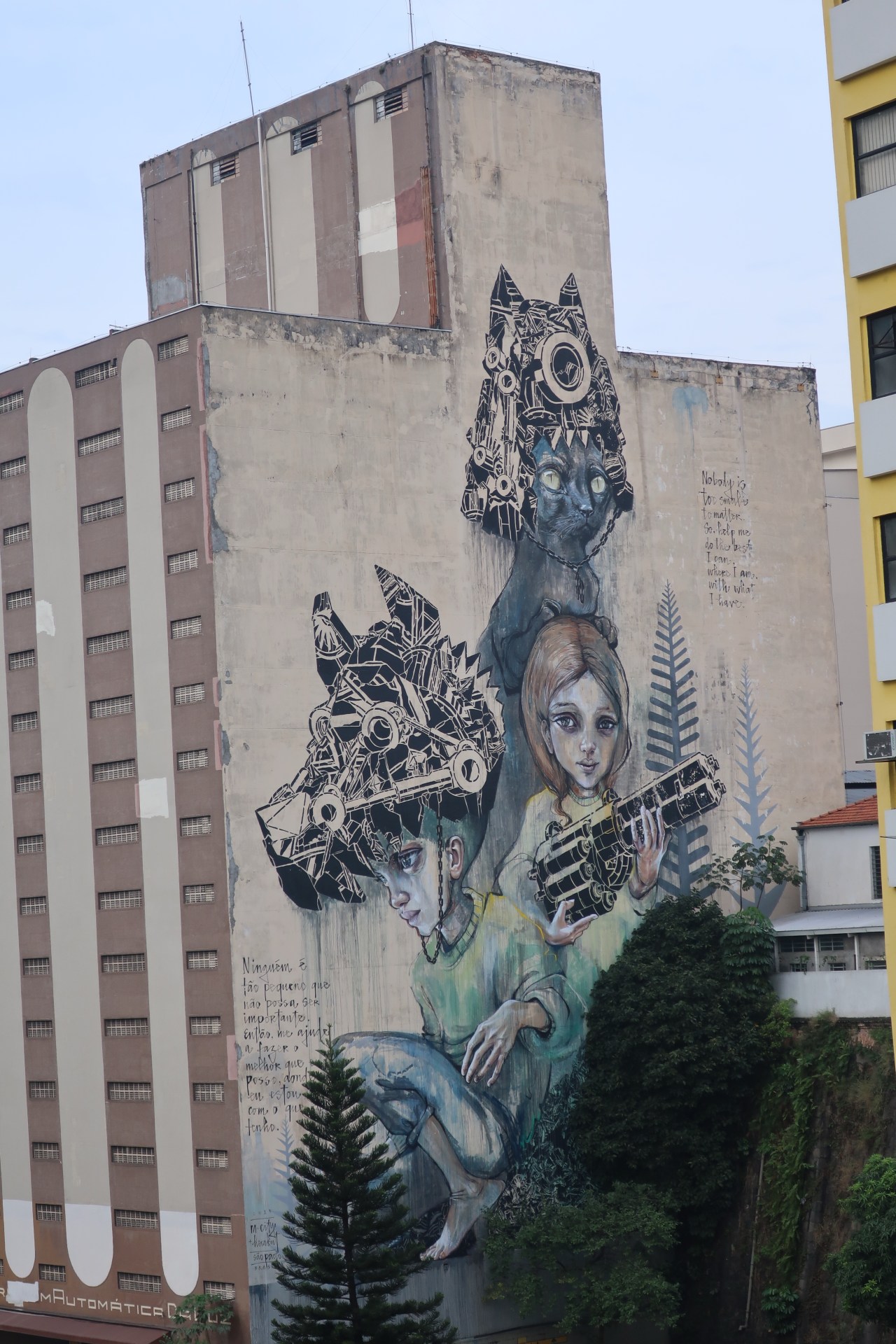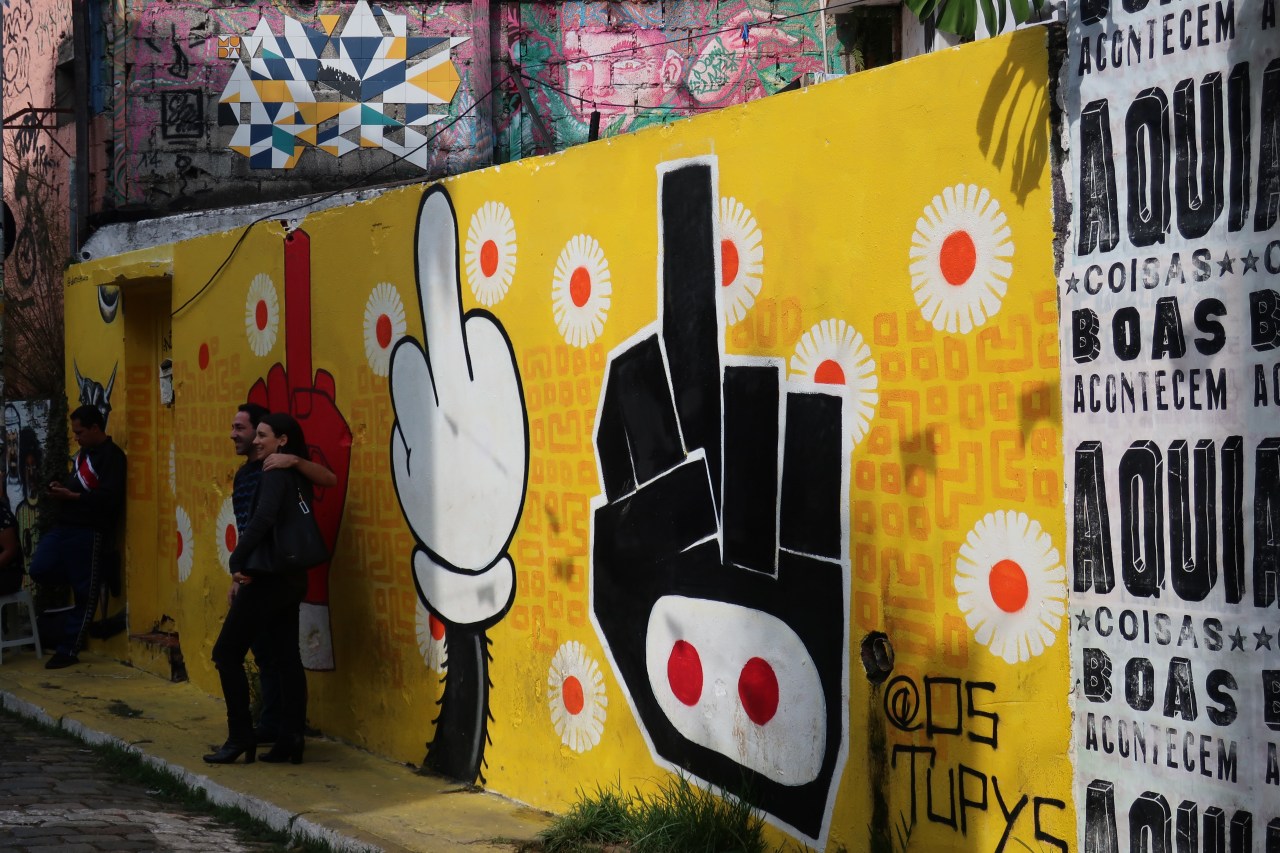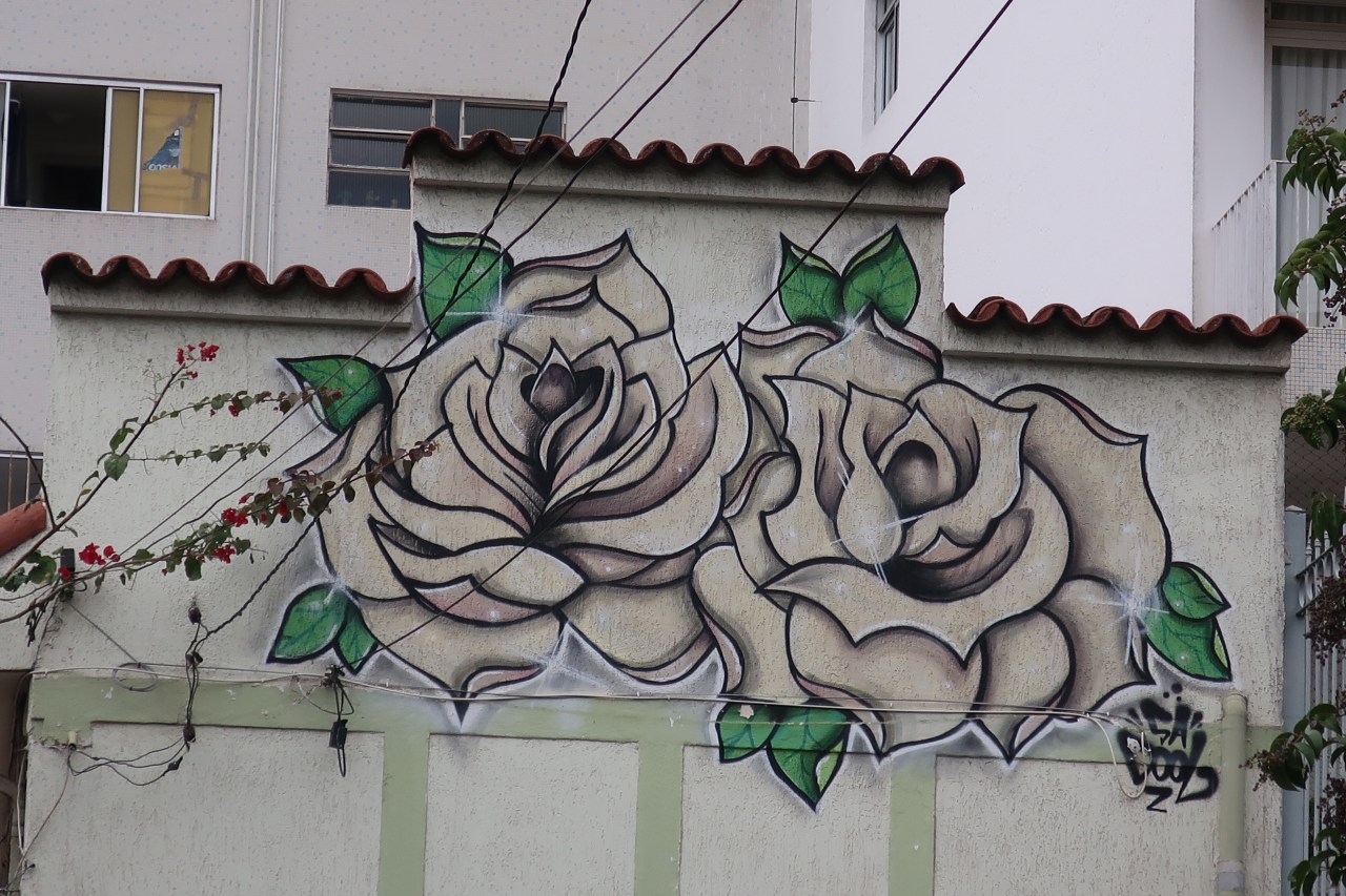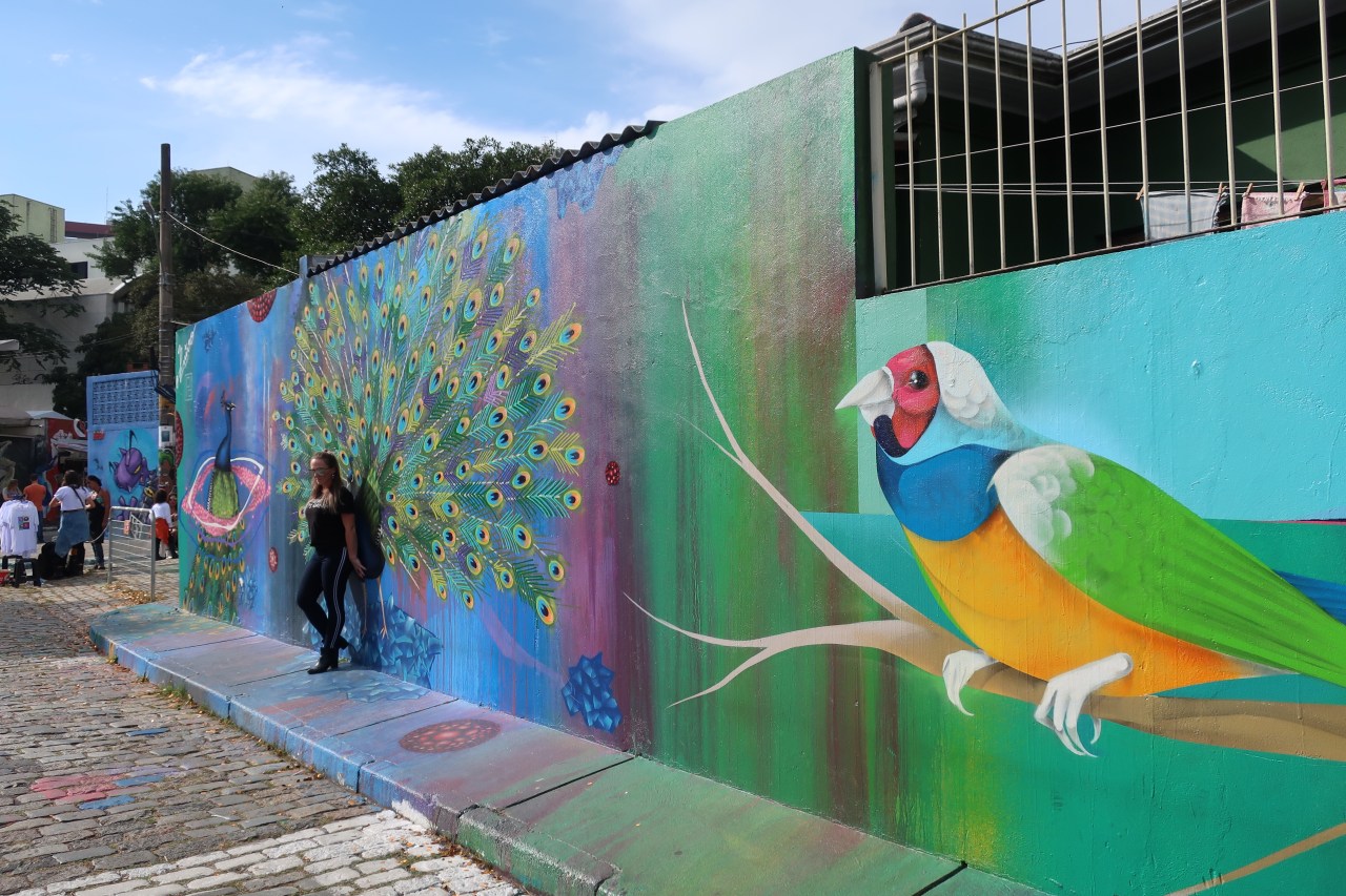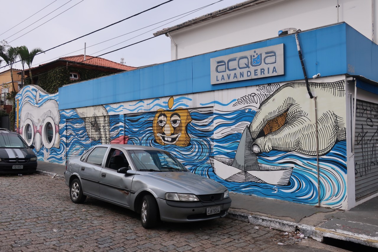Près du Monastère San Bento et dans sa cour même on y trouve un chat stylisé à double tête surplombant, surveillant ou protégeant une fillette à la kalachnikov. Pas un coin de mur n’est laissé à l’abandon, même les plots pour empêcher les voitures de monter sur les trottoirs sont peints – tête de chat avec des palmiers plantés dessus, comme coiffure punk ; ou bien tête de femme allongée, bleue aux yeux globuleux.