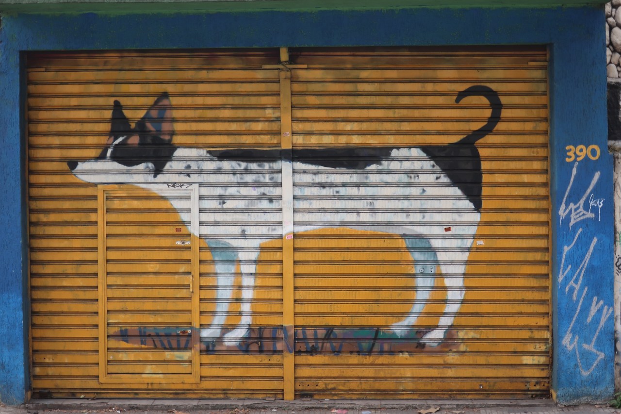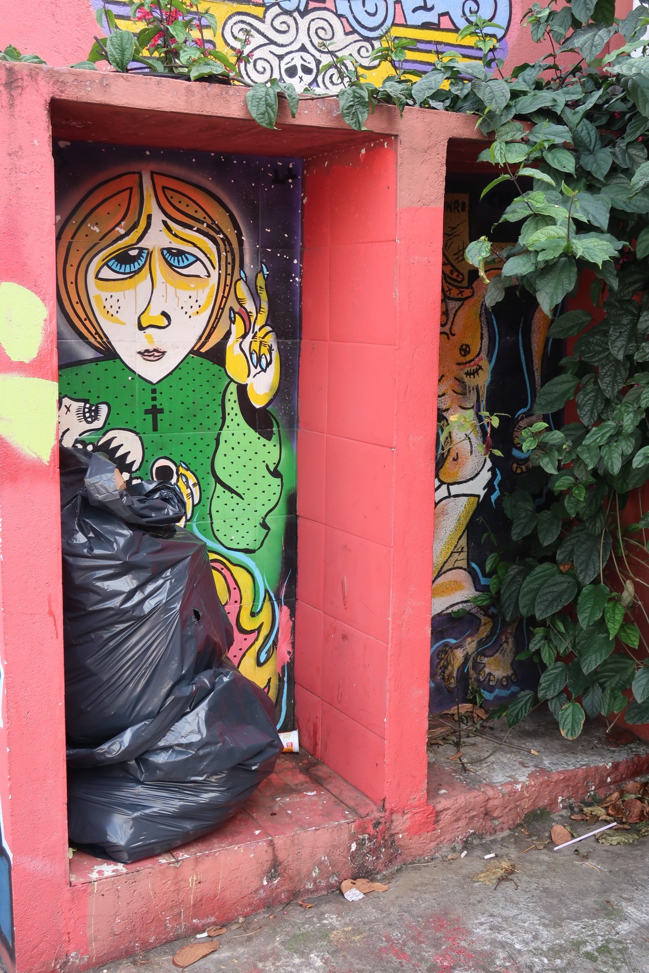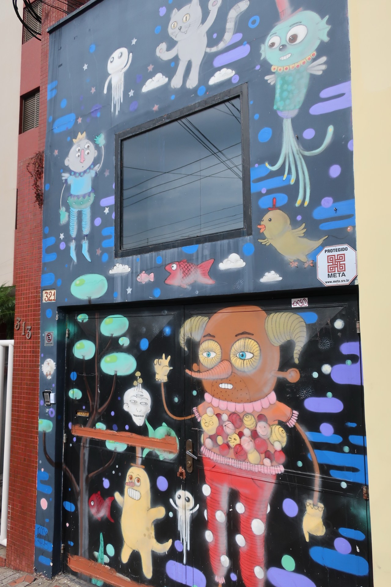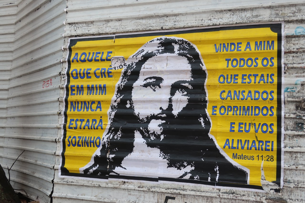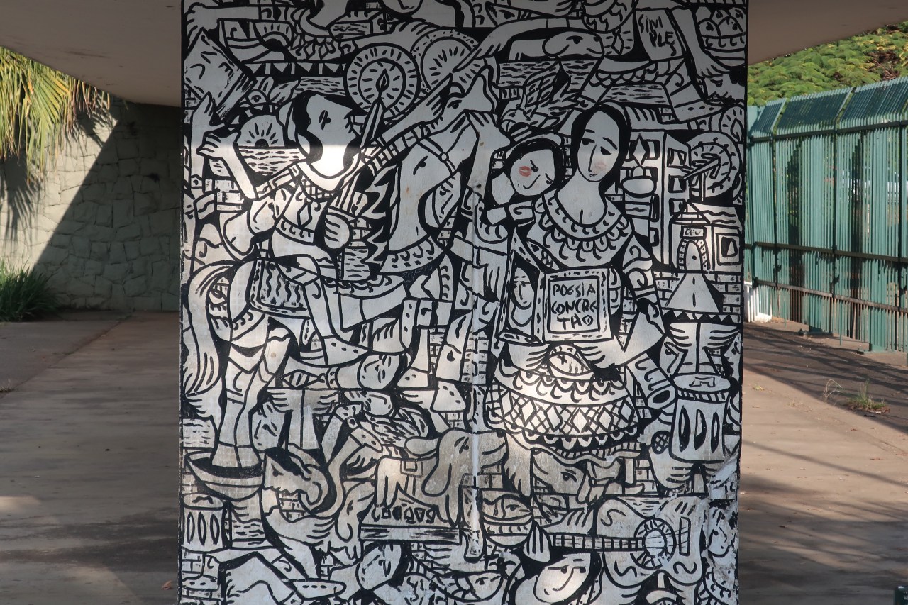Près du Monastère San Bento et dans sa cour même on y trouve un chat stylisé à double tête surplombant, surveillant ou protégeant une fillette à la kalachnikov. Pas un coin de mur n’est laissé à l’abandon, même les plots pour empêcher les voitures de monter sur les trottoirs sont peints – tête de chat avec des palmiers plantés dessus, comme coiffure punk ; ou bien tête de femme allongée, bleue aux yeux globuleux.