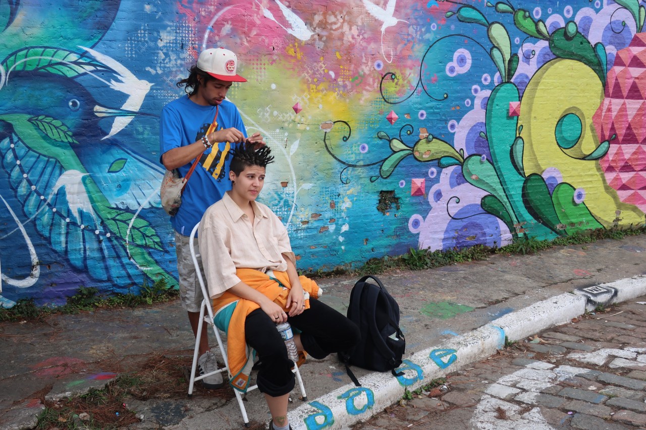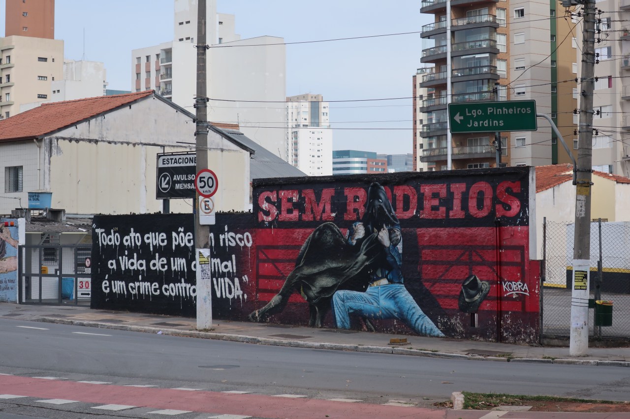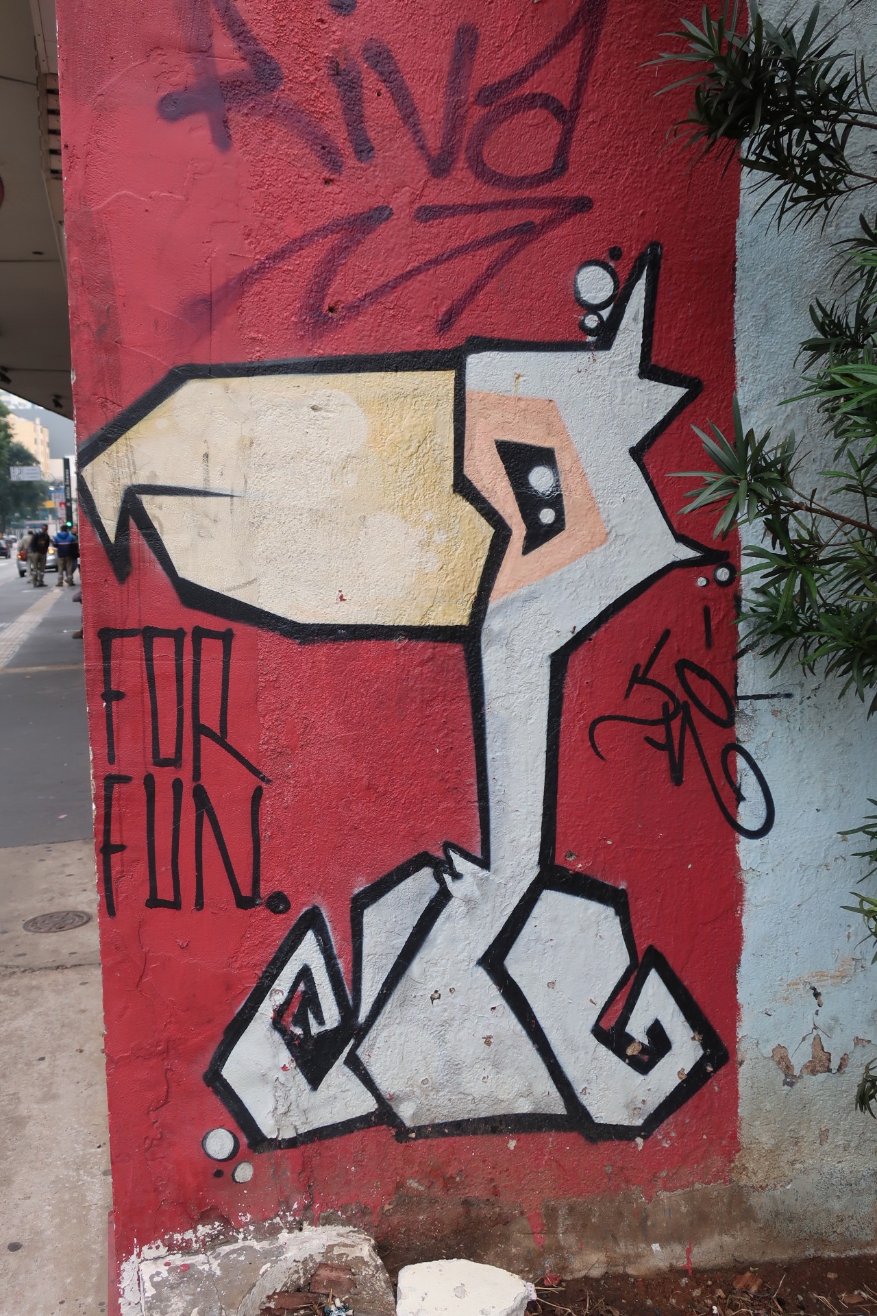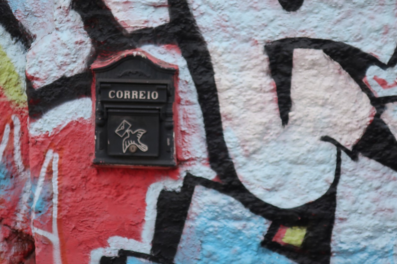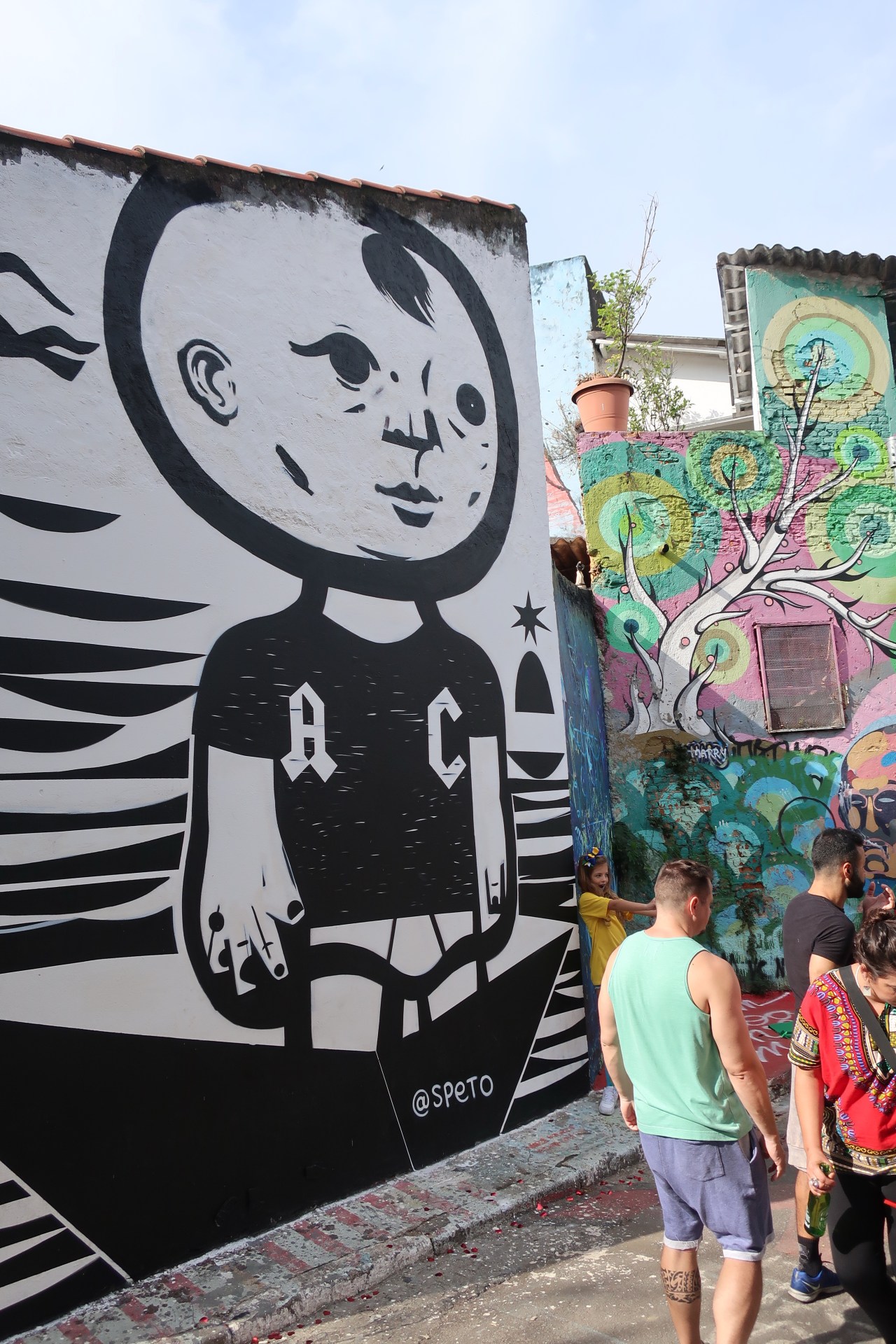 Près du Monastère San Bento et dans sa cour même on y trouve un chat stylisé à double tête surplombant, surveillant ou protégeant une fillette à la kalachnikov. Pas un coin de mur n’est laissé à l’abandon, même les plots pour empêcher les voitures de monter sur les trottoirs sont peints – tête de chat avec des palmiers plantés dessus, comme coiffure punk ; ou bien tête de femme allongée, bleue aux yeux globuleux.