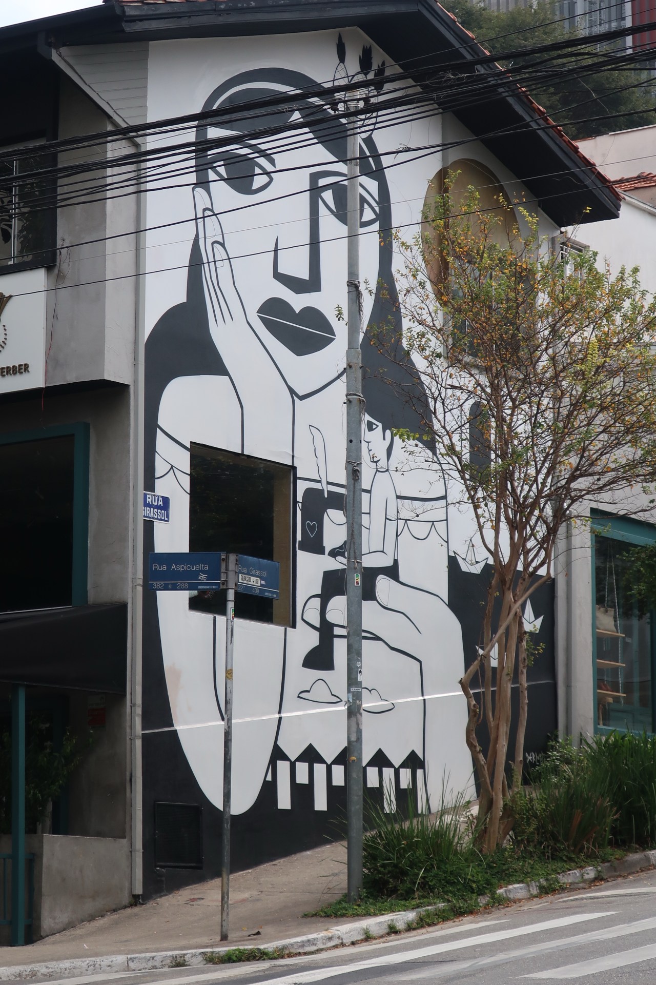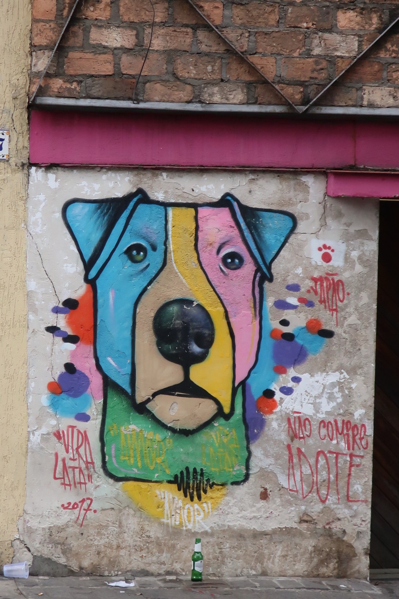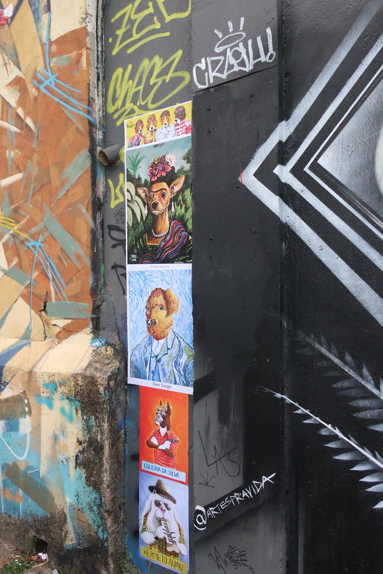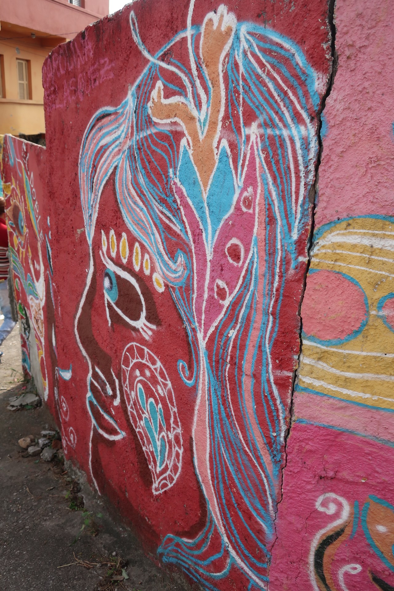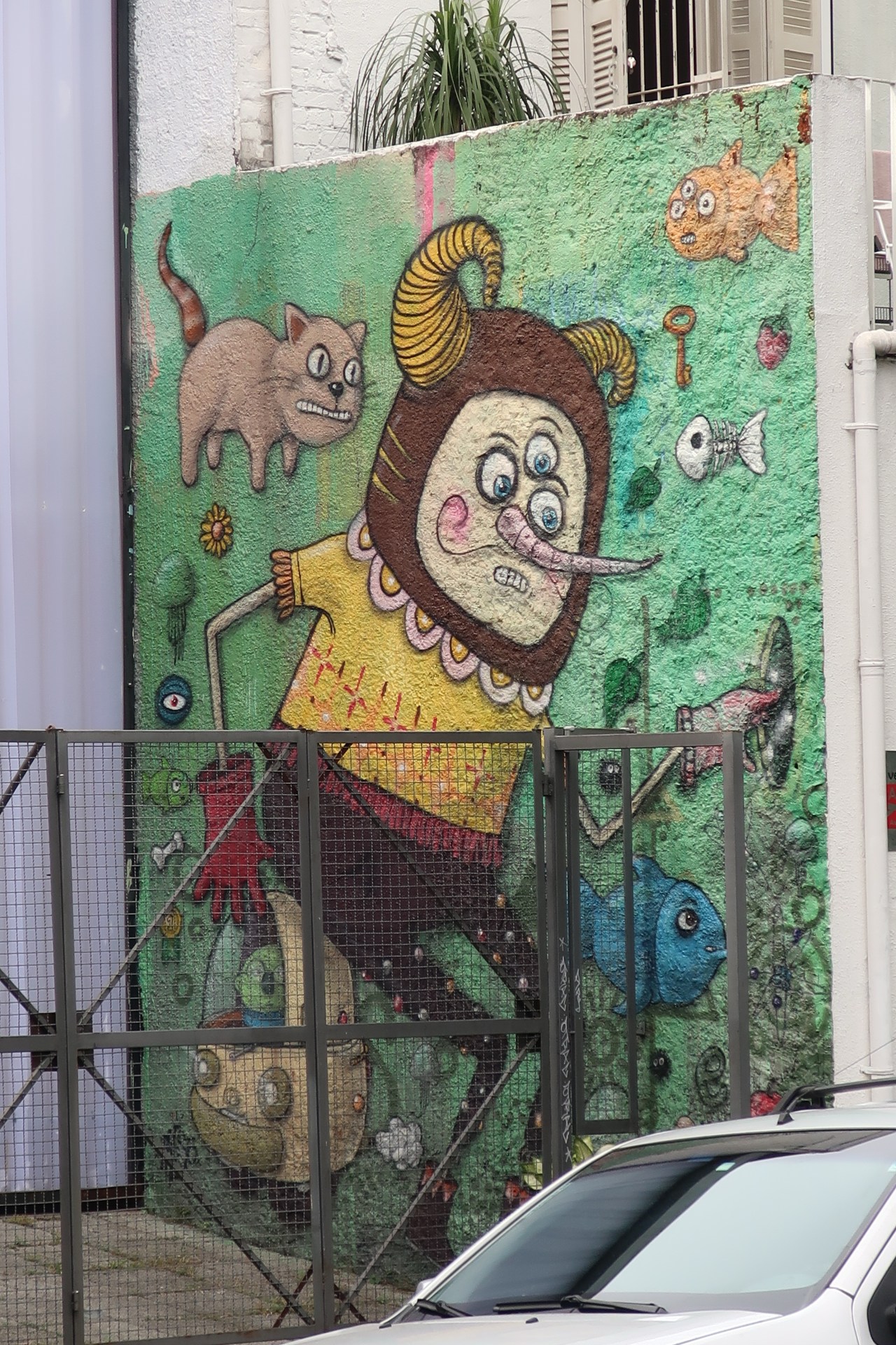 Près du Monastère San Bento et dans sa cour même on y trouve un chat stylisé à double tête surplombant, surveillant ou protégeant une fillette à la kalachnikov. Pas un coin de mur n’est laissé à l’abandon, même les plots pour empêcher les voitures de monter sur les trottoirs sont peints – tête de chat avec des palmiers plantés dessus, comme coiffure punk ; ou bien tête de femme allongée, bleue aux yeux globuleux.