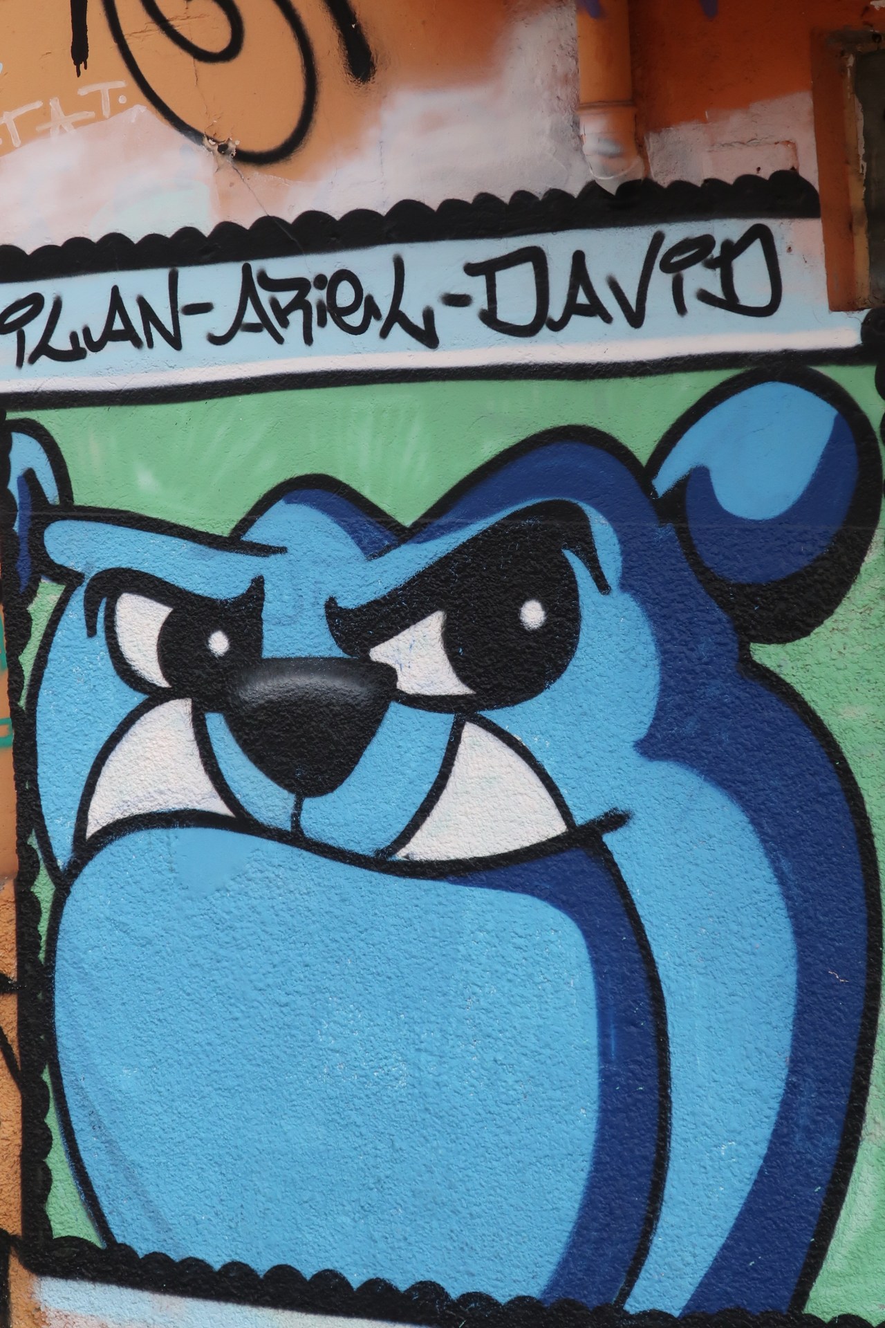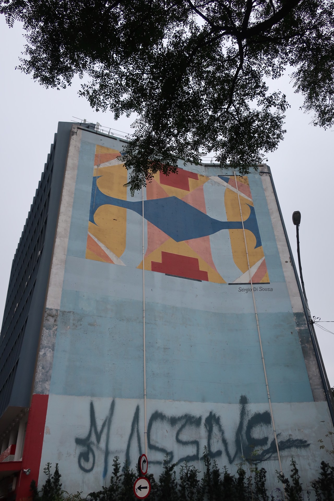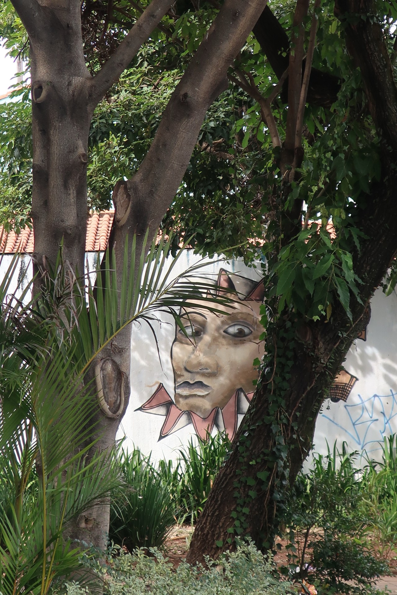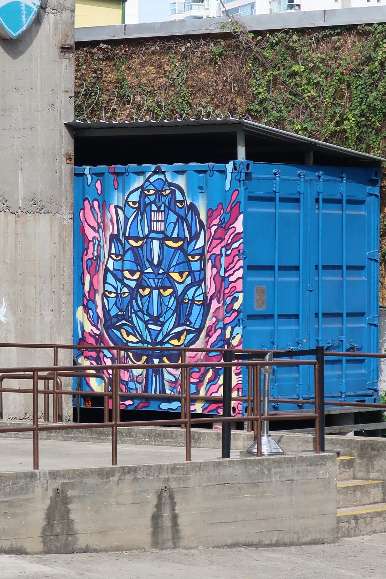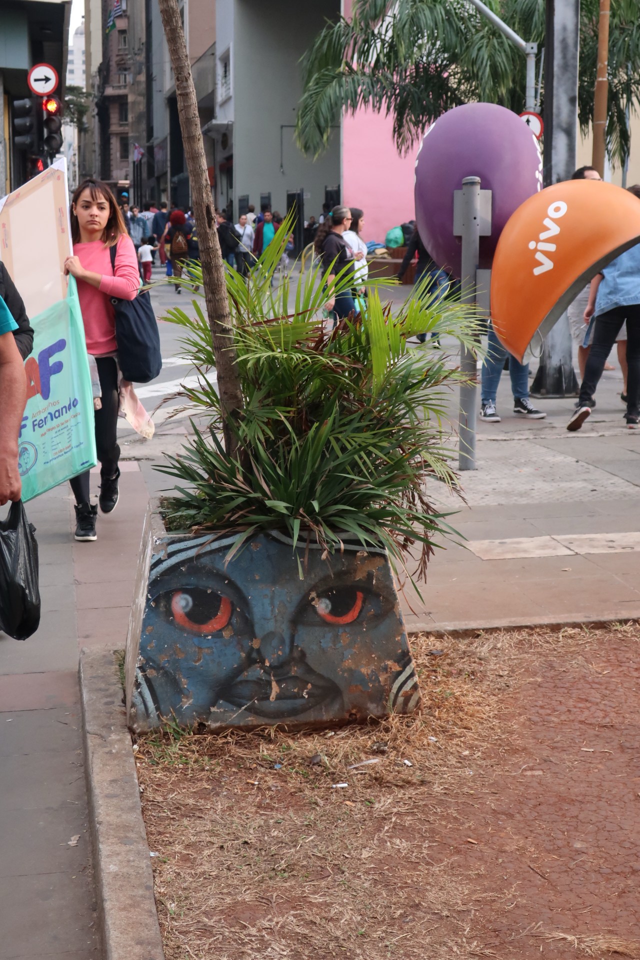Près du Monastère San Bento et dans sa cour même on y trouve un chat stylisé à double tête surplombant, surveillant ou protégeant une fillette à la kalachnikov. Pas un coin de mur n’est laissé à l’abandon, même les plots pour empêcher les voitures de monter sur les trottoirs sont peints – tête de chat avec des palmiers plantés dessus, comme coiffure punk ; ou bien tête de femme allongée, bleue aux yeux globuleux.