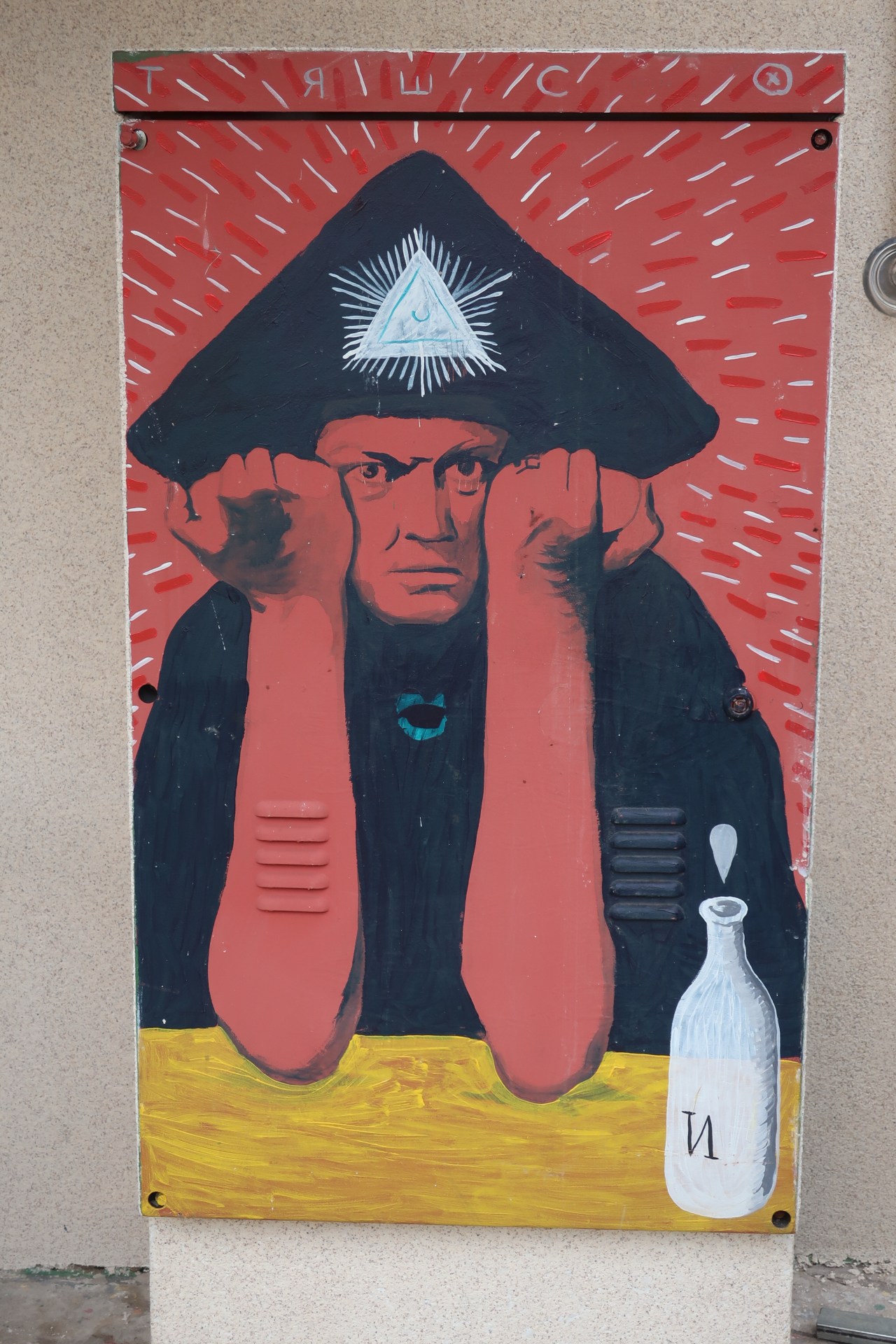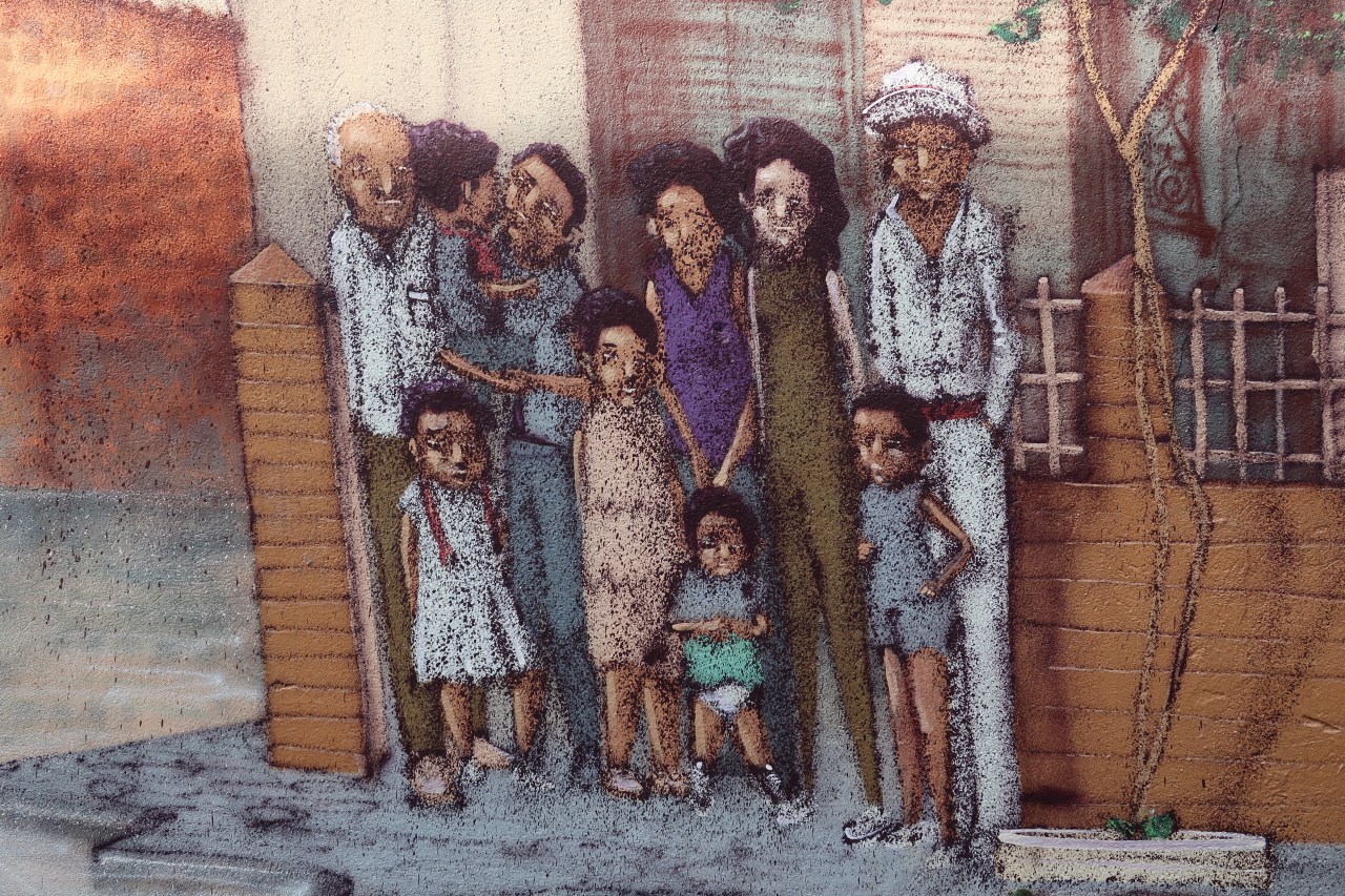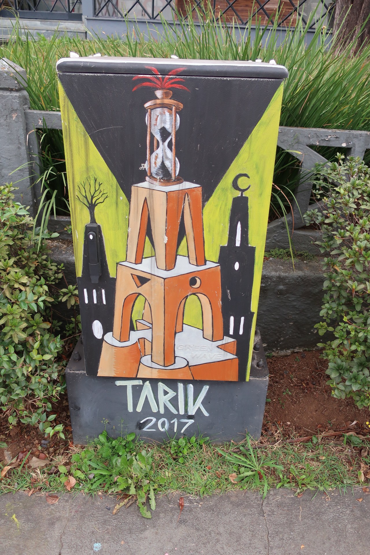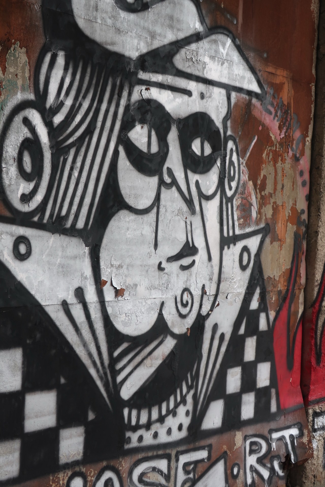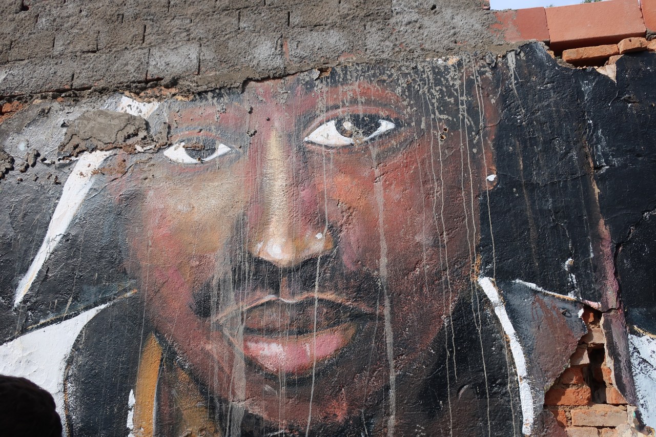 Et même des lieux les plus inattendus, comme les containers transformés en restaurants ou maison d’habitation, sont « graffités », représentant une tête faite de plusieurs têtes avec des yeux qui vous déshabillent. Même les bornes électriques servent de toile aux artistes comme Tarik avec son église et sa mosquée ; ou bien celle avec cette effigie qui me fait penser à Napoléon.